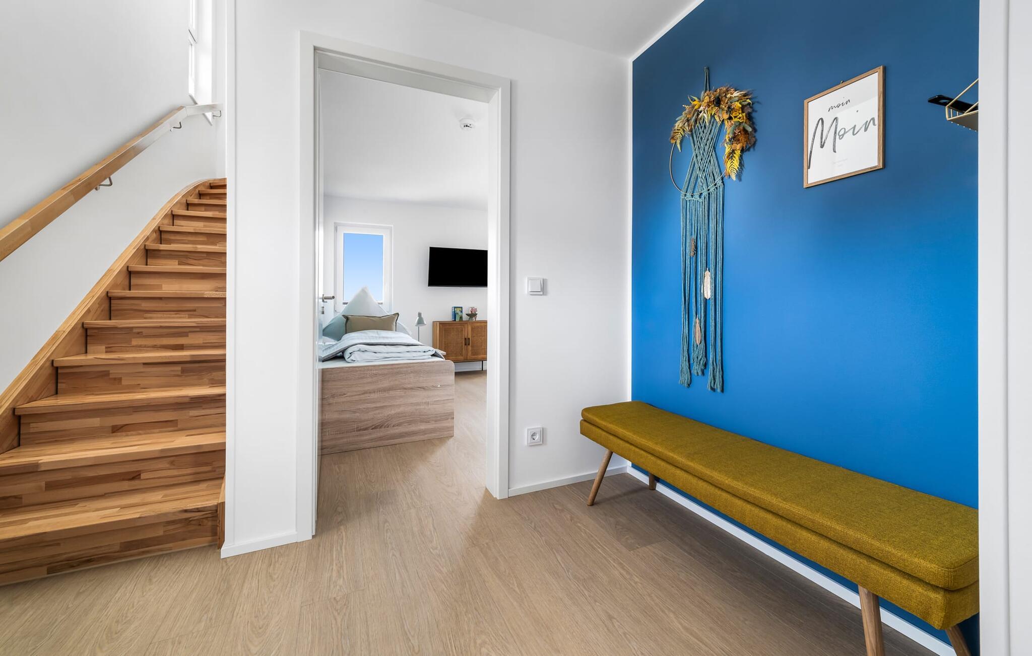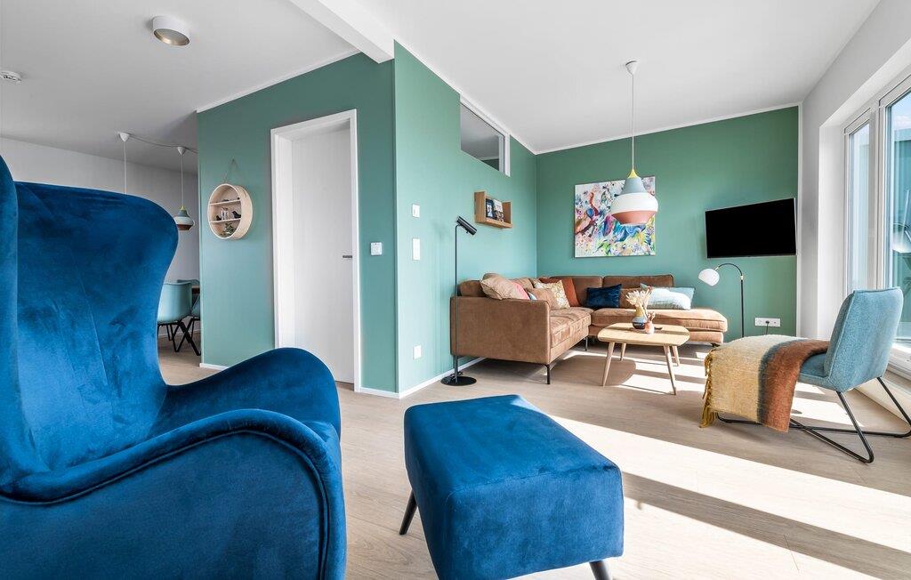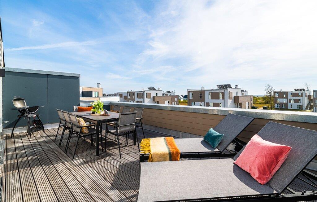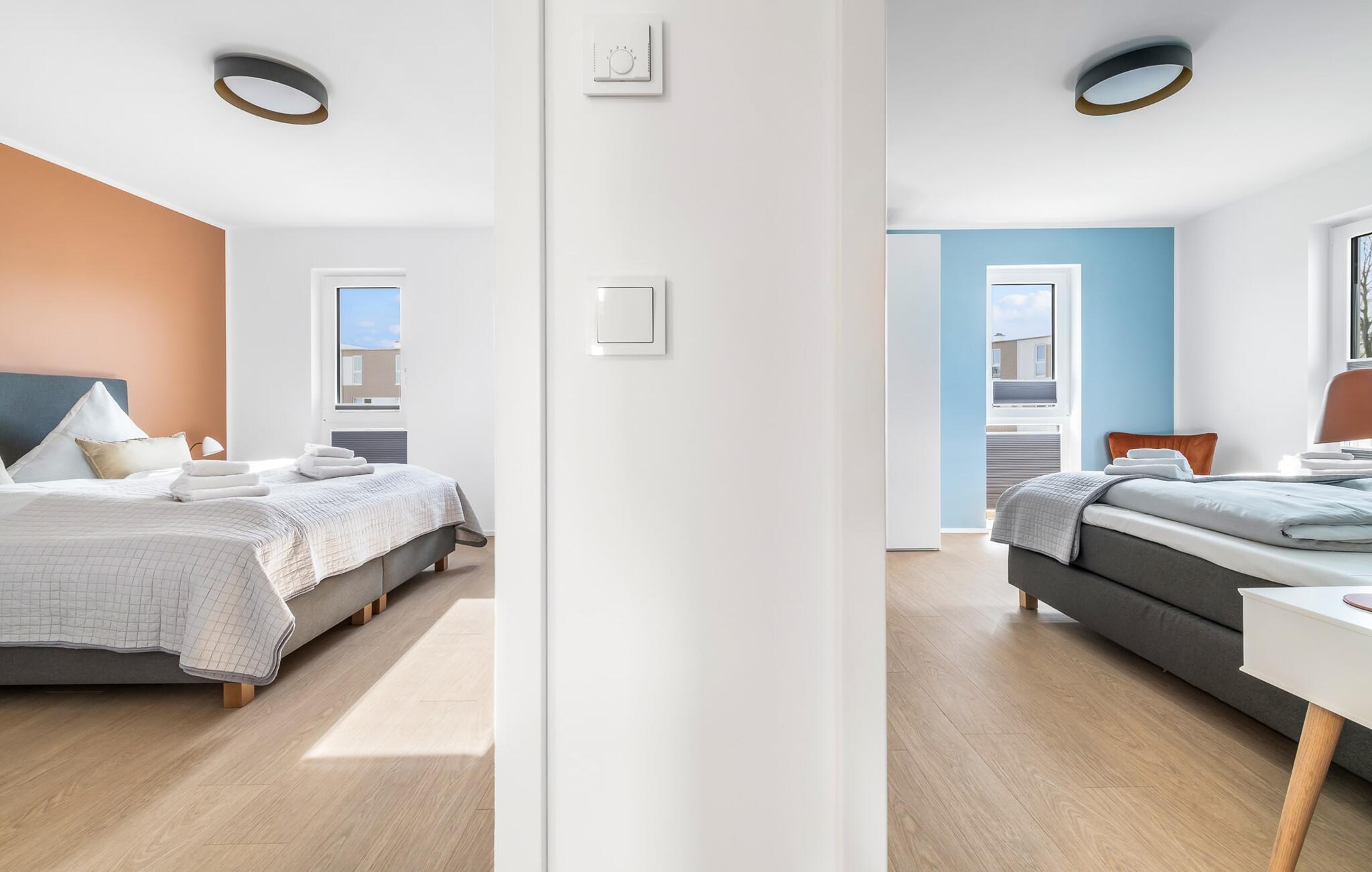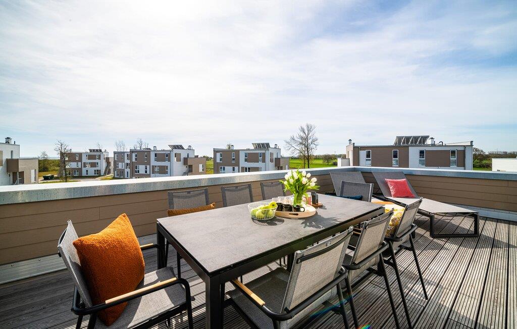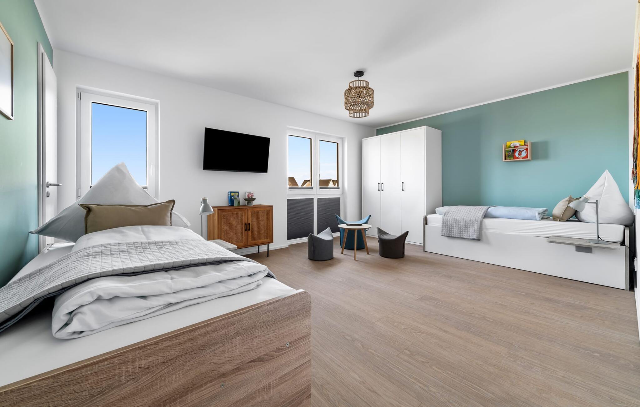 Ferielejligheden Vogelfrei byder jer velkommen med et trendy skandinavisk design og en åben følelse af rum. Her føler man sig faktisk fri som en fugl. Den moderne etagelejlighed tilbyder plads til op til 8 personer med tre soveværelser og to badeværelser fordelt på to etager. Sandstranden Weidefelder med kiosk, restaurant og strandstole er inden for gåafstand, og den travle havnepromenade i feriestedet Østersøen er et fantastisk sted at slentre og beundre havnebiografen. Når I træder ind i ferielejligheden på første sal, begynder jeres ferie fra første øjeblik. I befinder jer i lejlighedens afslapningsområde. Der er tre soveværelser til rådighed på denne etage. Uanset hvilken I vælger, er I garanteret en afslappende nat. To soveværelser er udstyret med rummelige dobbeltsenge, mens det tredje soveværelse har to enkeltsenge, som hver kan laves om til en hel dobbeltseng. I vil finde et fladskærms-tv i alle soveværelser. Også på denne etage er jeres helt egen lille wellness-oase. Badeværelset med bruser i gulvniveau og infrarød sauna til den perfekte afslutning på en feriedag. Et andet badeværelse med badekar er på anden sal i lejligheden. Her er også opholds- og spiseafdelingen placeret og emmer af komfort med sin lyse og moderne indretning. Uanset om det er en hyggelig aften med at se tv for to i sofaen eller en spilleaften sammen, her kan I bruge jeres tid, som I vil. Denne ferielejlighed har naturligvis også et rummeligt udeareal. Havemøbler af høj kvalitet er indrettet som opholdsområde og danner det perfekte udgangspunkt for en dejlig morgenmad om morgenen med solskin og masser af udsigt. Foran ferielejligheden finder I to parkeringspladser og et aflåseligt cykelskur. Vores favoritsted: Byd dagens første solskin velkommen med en duftende kaffe på tagterrassen med udsigt over Østersøen... Bemærk venligst: OstseeResort Olpenitz er meget populært, og der bygges fortsat i parken. Ikke desto mindre kan I se frem til en 5-stjernet standard og et førsteklasses ophold. Byggeaktiviteterne kommer ikke til at forstyrre jer på ferien, og derfor gives der ikke yderligere afslag i prisen.