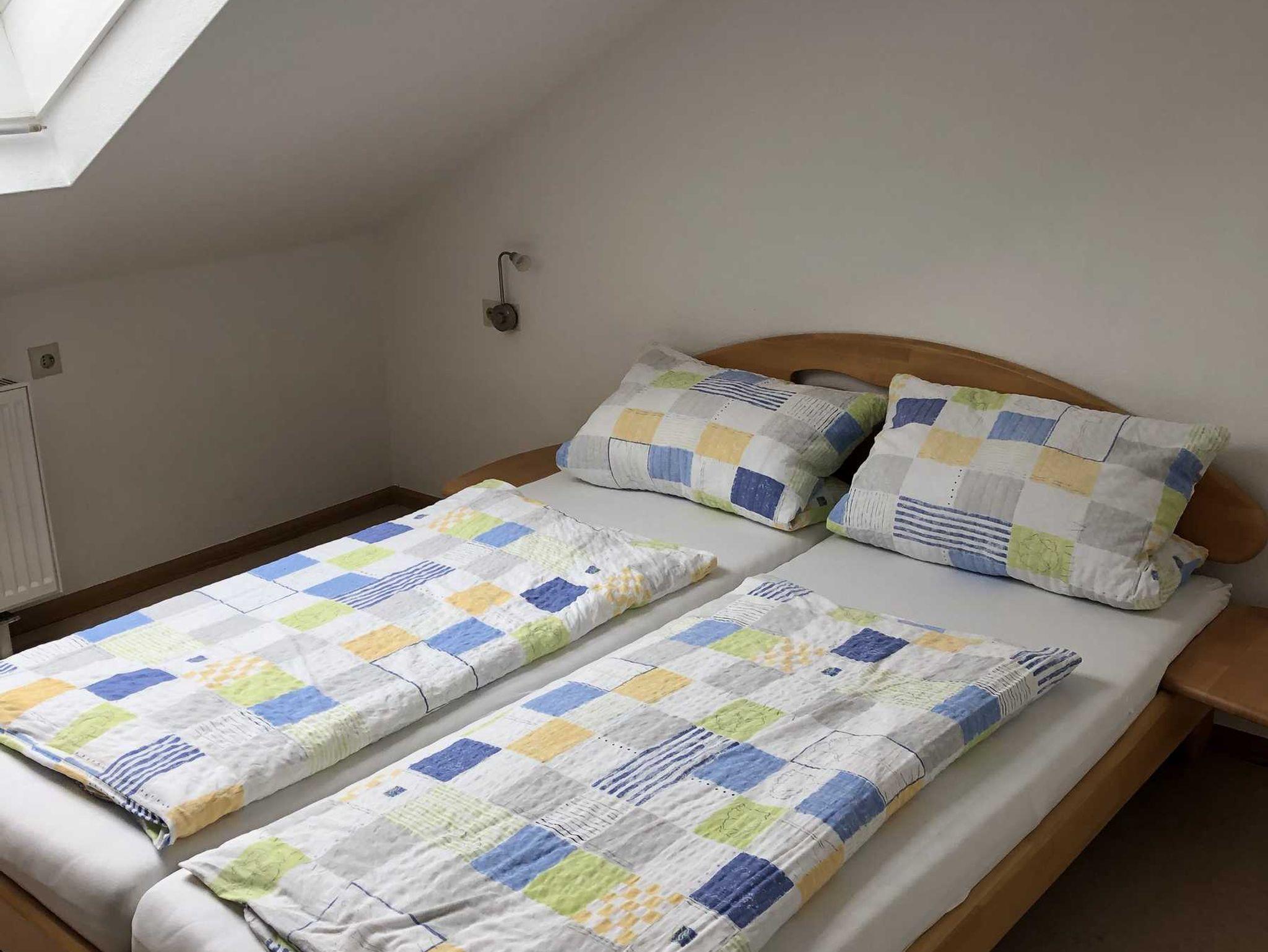 Nichtraucher-Ferienwohnung 50qm, 2 Schlafräume*, komplett ausgestattete Küche mit Geschirrspüler, WC und Dusche. Diese Wohnung befindet sich in unserem Haupthaus im Dachgeschoss. Vor Ort fällt eine Kurtaxe in Höhe von 2 EUR pro Person pro Tag an. Bitte beachten Sie, dass die Preise bei 2 Personen für die Nutzung eines Schlafraumes gelten. Sollten Sie gerne bei einer Belegung von 2 Personen 2 Schlafräume nutzen wollen, berechnen wir einen Aufpreis von 10 EUR pro Nacht.