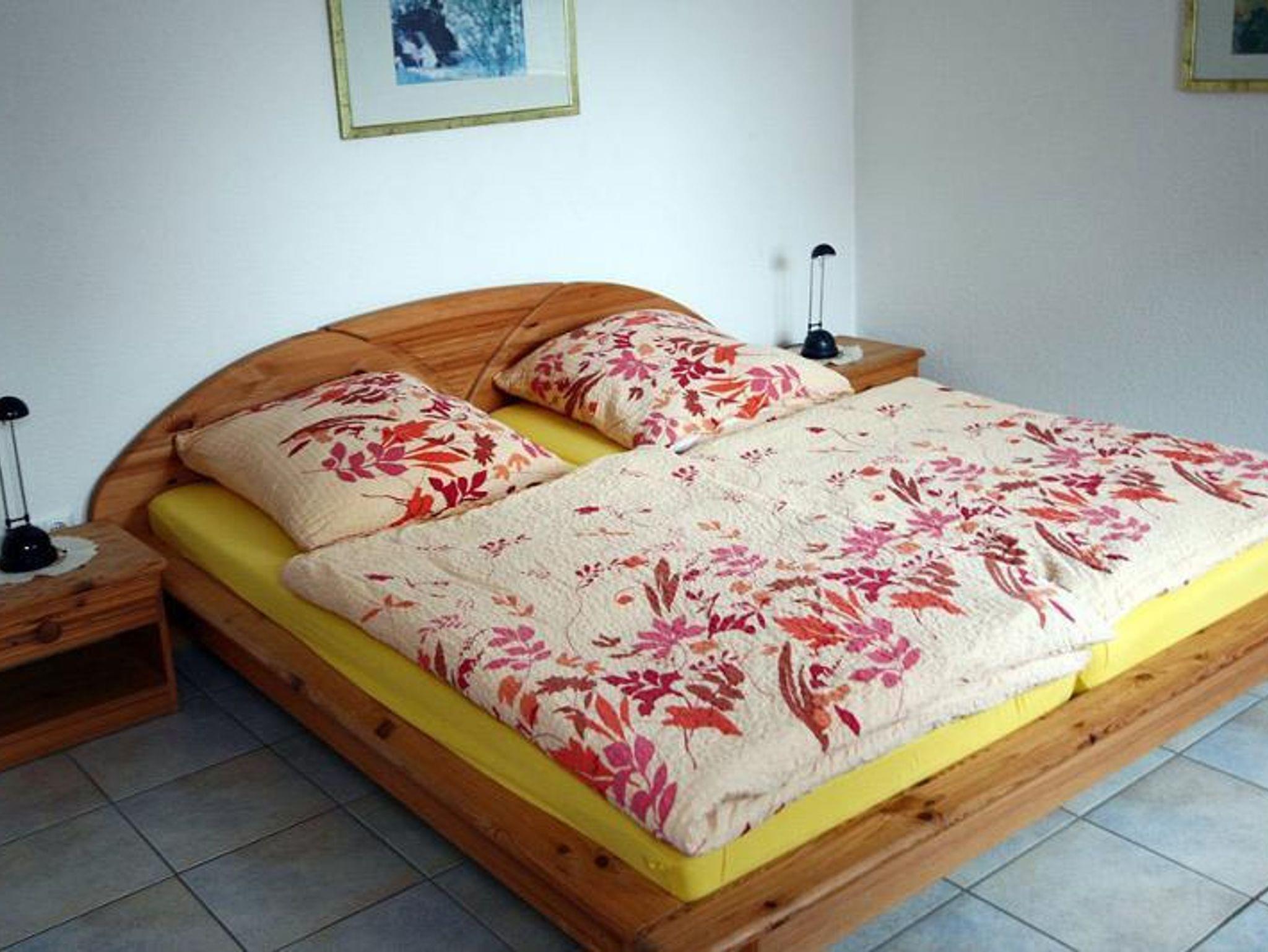 Die Wohnung verfügt über zwei separate Schlafbereiche: ein Schlafzimmer mit Doppelbett und Kinderbett sowie einen Alkoven mit zwei weiteren Schlafplätzen für Kinder.
