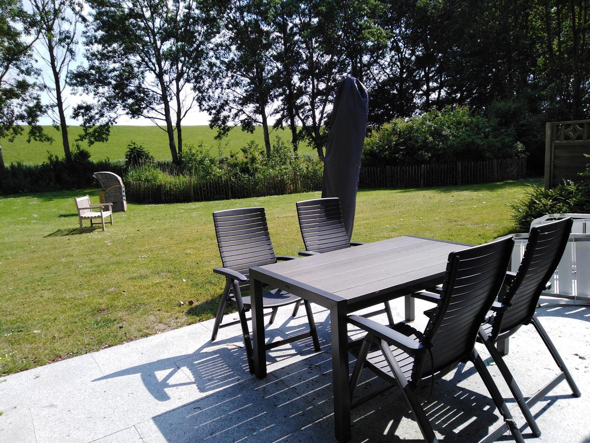 38 qm große Südterasse mit Gartenmöbeln und Strandkorb(von Ostern bis Oktober). Spiele und Bücher vorhanden, Staubsauger etc. auch. Riesiger Garten mit Deichblick, Schaukel, Sandkasten für alle Mieter