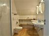 Badezimmer (Duschbad) mit Dusche, 2 Waschbecken, WC und Föhn.
