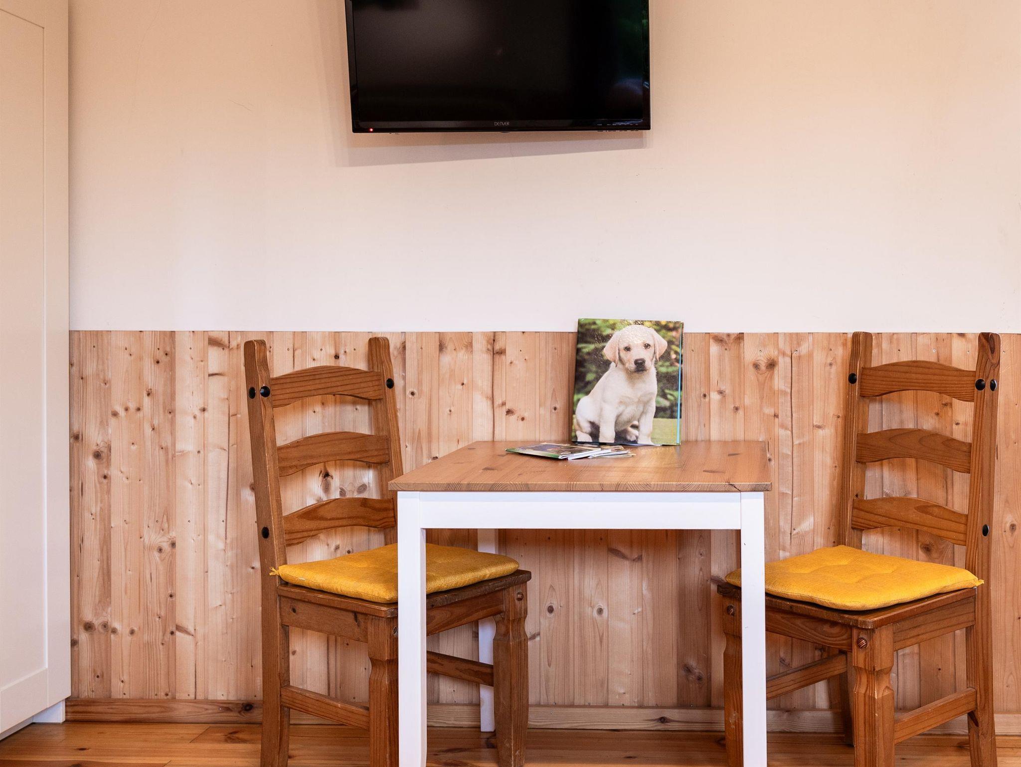 Im Hauptgebäude, einem ehemaligen Reiterhof, befindet sich der gemütliche Pfotentreff mit einer kleinen Gastroküche. Hier können unsere Gäste von Mittwoch bis Montag auf Wunsch frühstücken und auch zu Abend essen. Die vierbeinigen Begleiter dürfen selbstverständlich auch mit.