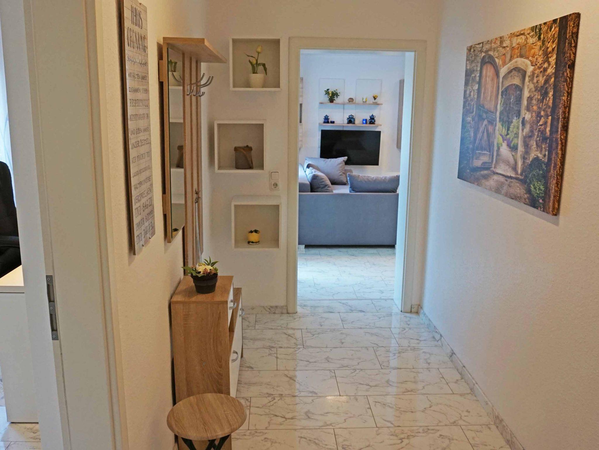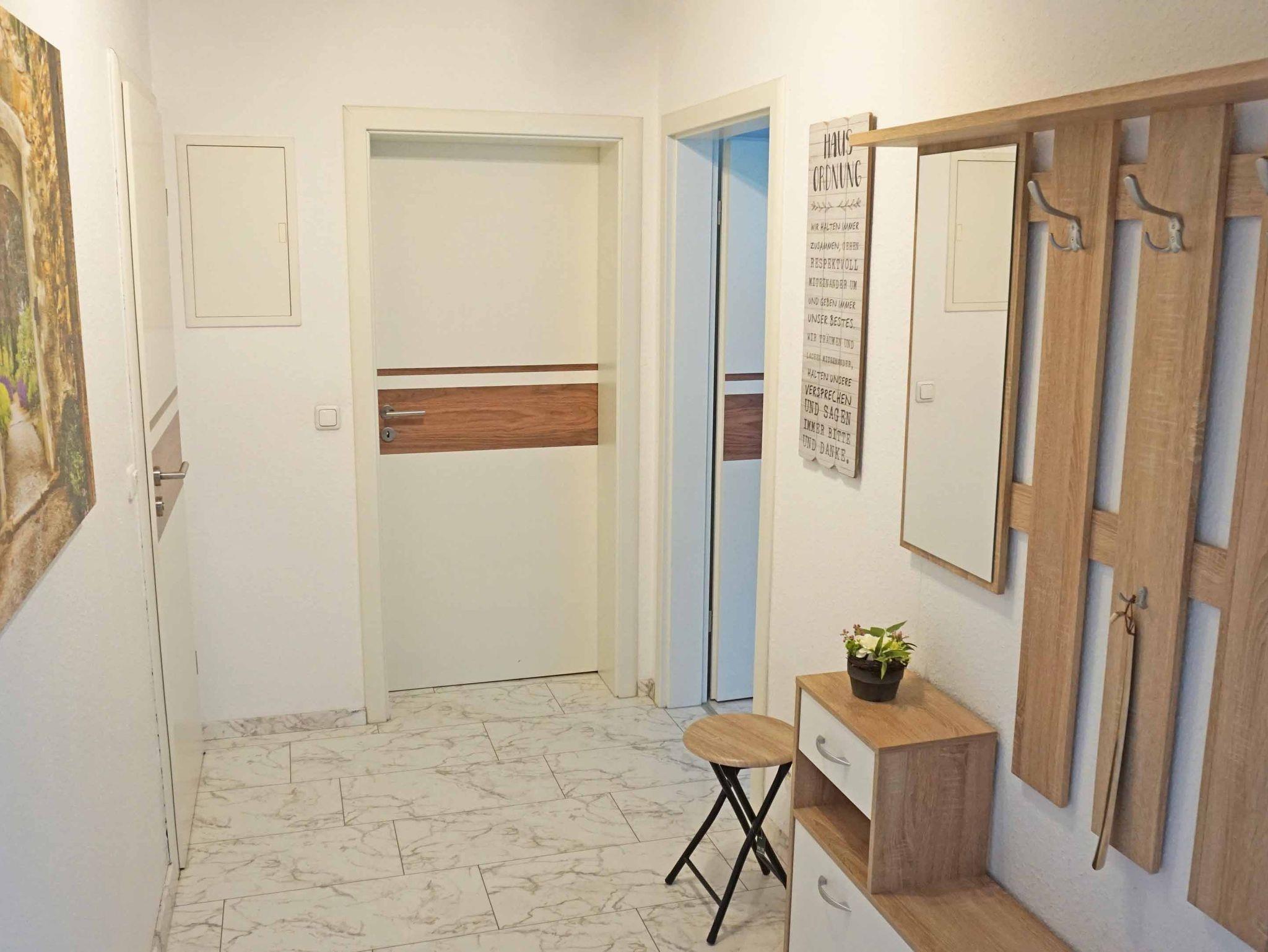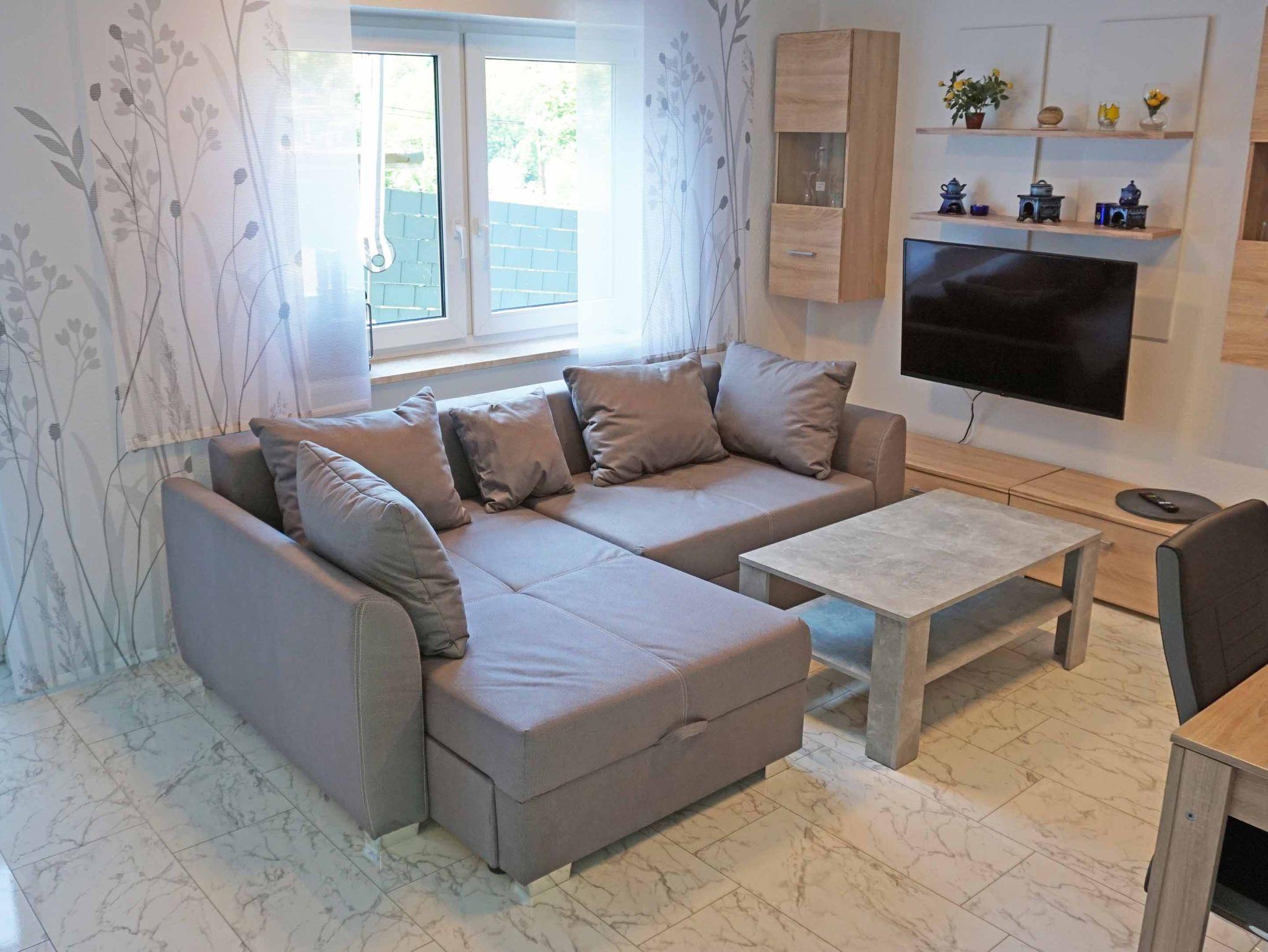 Die geräumige Ferienwohnung besteht aus einem Schlafzimmer mit einem komfortablen Doppelbett, einem Wohnzimmer mit einem Schlafsofa für zwei Personen und einer Essgruppe für vier Personen. Die hochwertige Küche ist mit Spülmaschine, Kaffeemaschine, Wasserkocher, Mikrowelle, Eierkocher und vielem mehr ausgestattet. Bei Ihrer Anreise sind die Betten bezogen und Handtücher liegen für Sie bereit. Das Badezimmer verfügt über Dusche und WC. Die lichtdurchflutete Wohnung bietet neben einer großzügigen Terrasse die Möglichkeit zur Mitnutzung des hauseigenen Whirlpools. Diesen können Sie in den Monaten Mai bis Oktober nutzen. Wir freuen uns auf Sie! Eine Waschmaschinen Nutzung ist bei längerer Buchung auf Anfrage möglich.