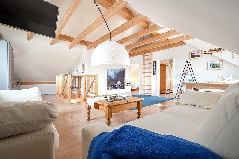 Die Ferienwohnung "Möwe" liegt im 1. Obergeschoss des 2012 neu erbauten Holzhauses "Himmelblau" und bietet für 2 bis max. 6 Personen ein modernes Ambiente im mediterranen Stil. Die offene Balkenlage verleiht dieser Wohnung ihren besonderen Charakter.
