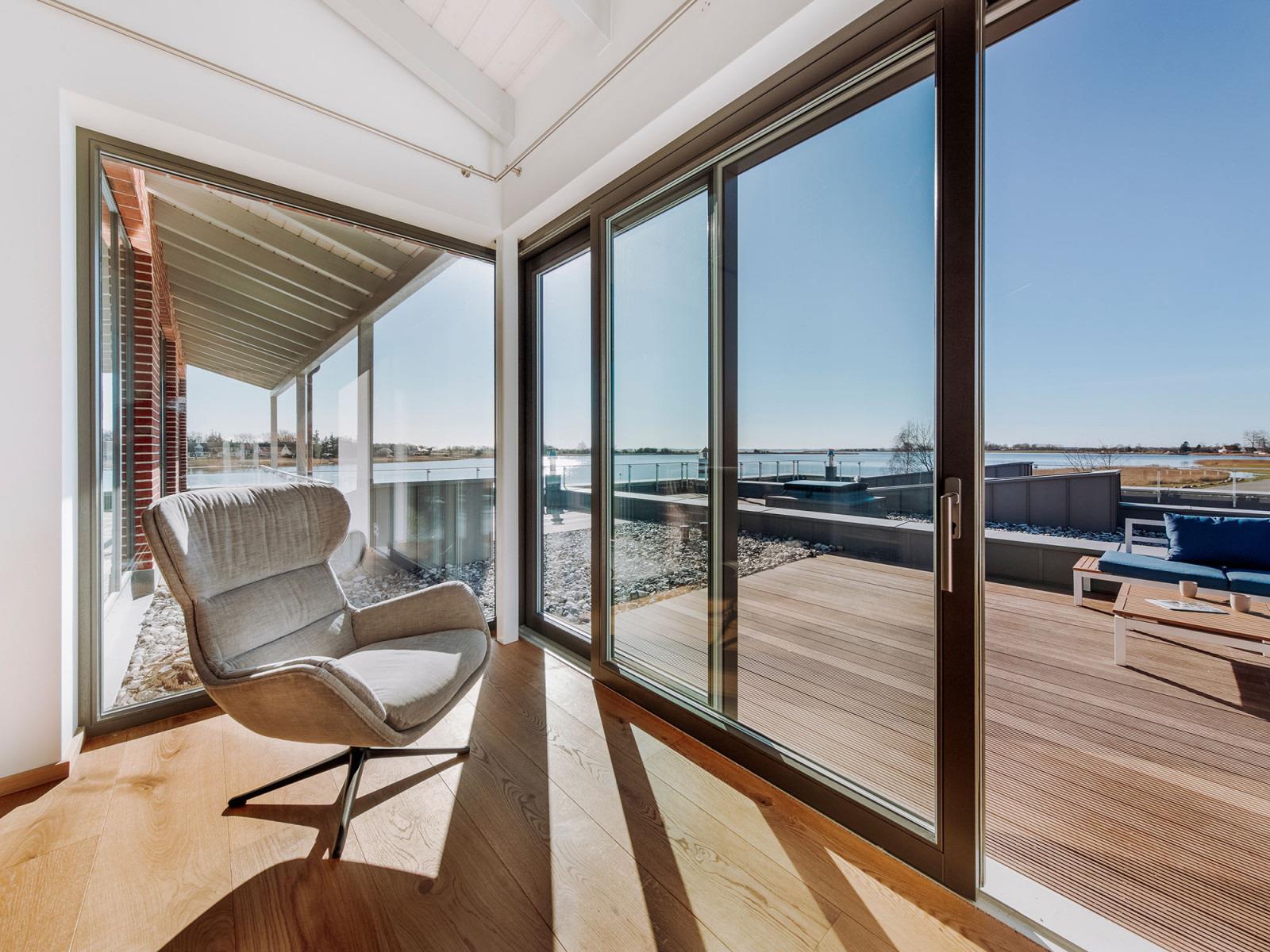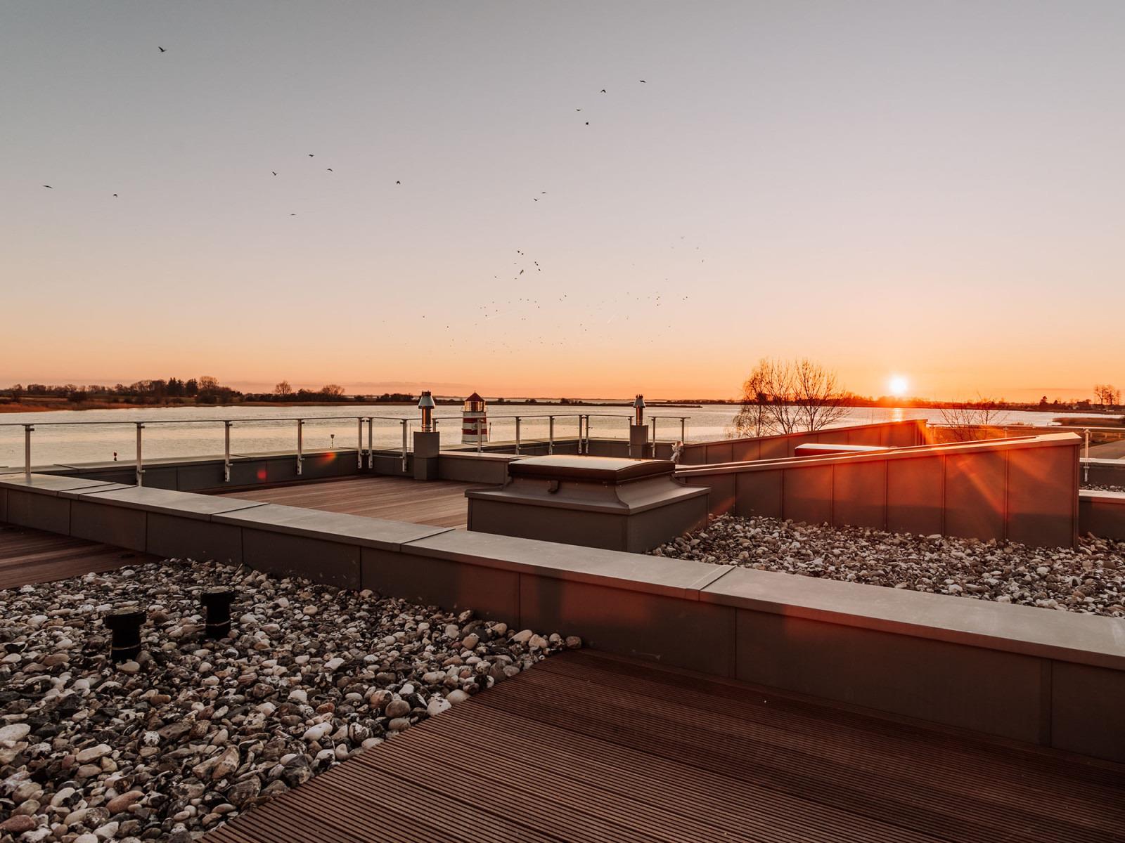 Die 22 qm große Sonnenterrasse thront über dem Wasser der Bucht. Bis abends spät können Sie hier durchgehend die Sonnen genießen. Auf dem warmen Holzdeck habe Sie eine fantastische Aussicht auf den Nationalpark Vorpommersche Boddenlandschaft. Die bequemen Loungemo¨bel laden zum Entspannen ein. Also machen Sie es sich mit einem Sun-Downer gemütlich!