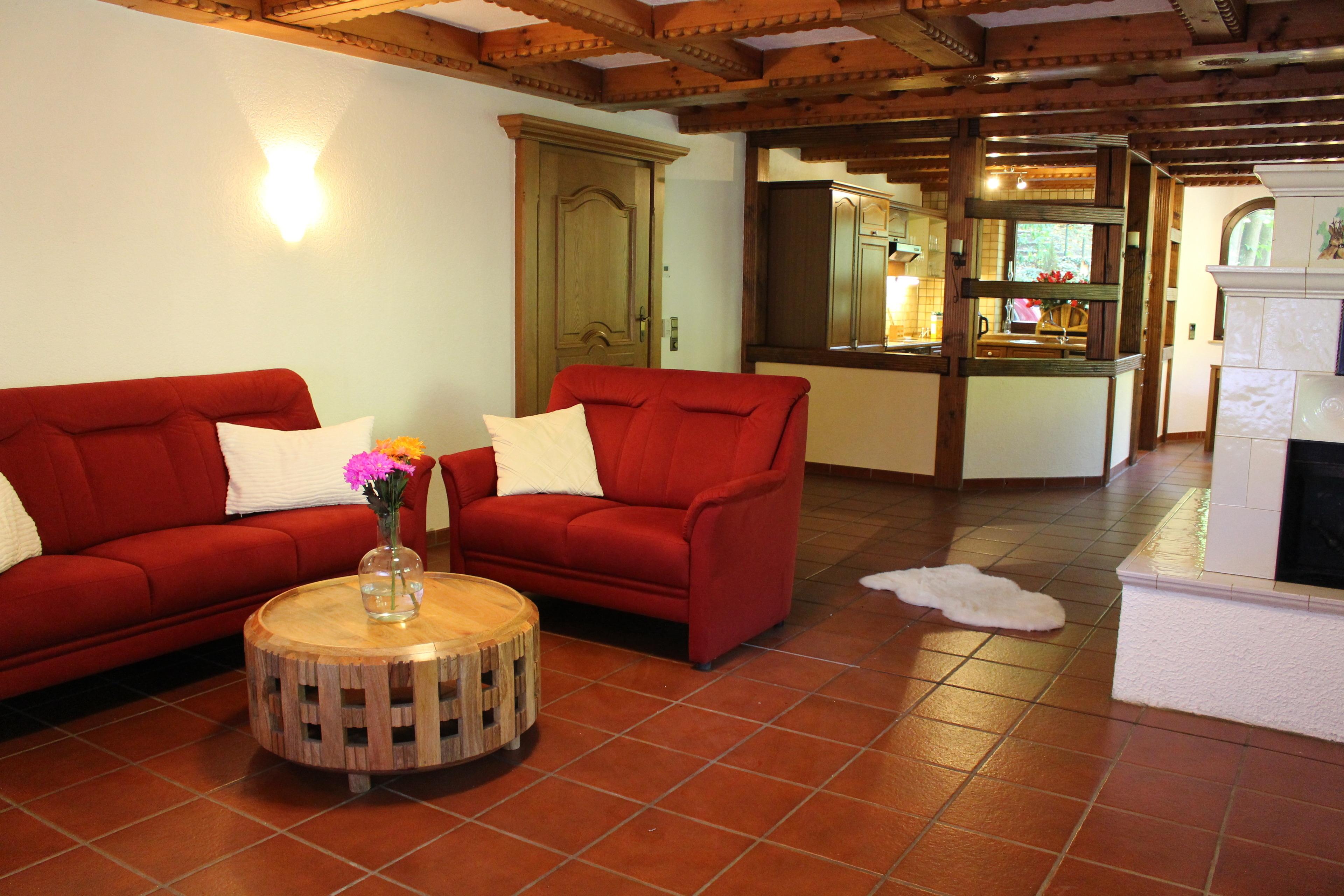 Im Zentrum des Wohnzimmers steht ein stylischer Kamin mit großem Sichtfenster, um an kalten Abenden viel knisterne, warme Gemütlichkeit im Wohnzimmer genießen zu können. Neben der gemütlichen Sofaecke mit rießigem LCD TV steht Ihnen hier auch eine Essecke zur Verfügung.