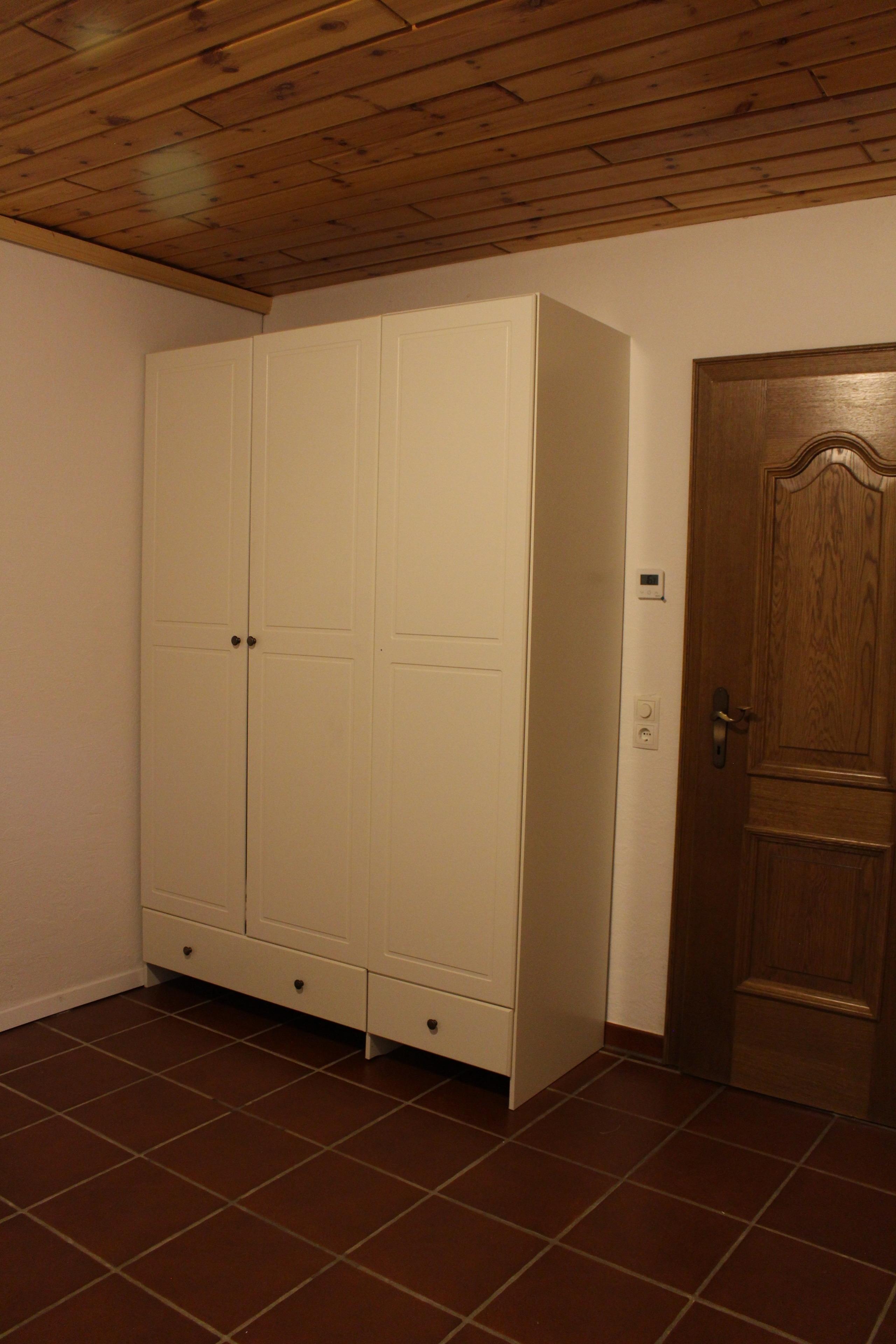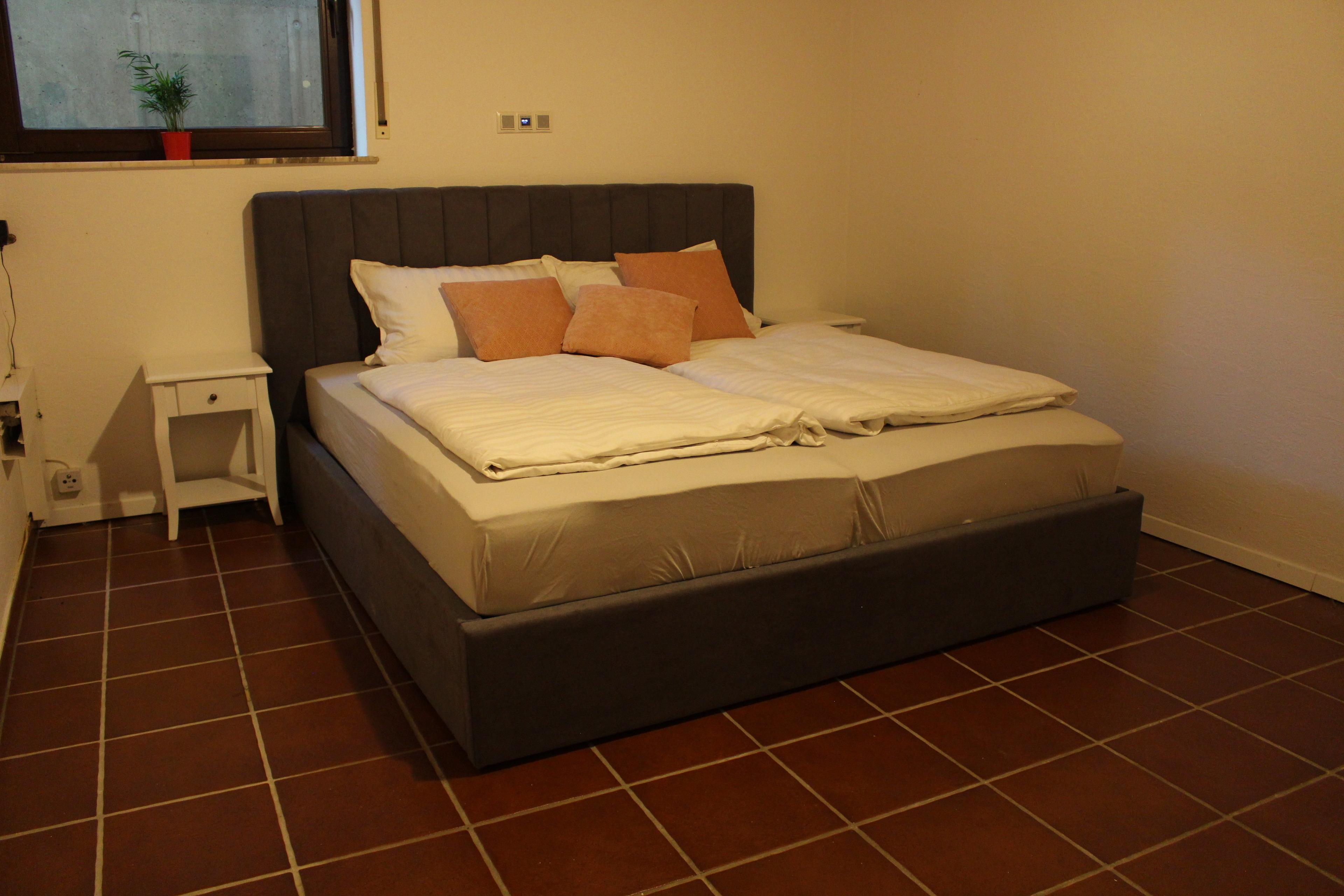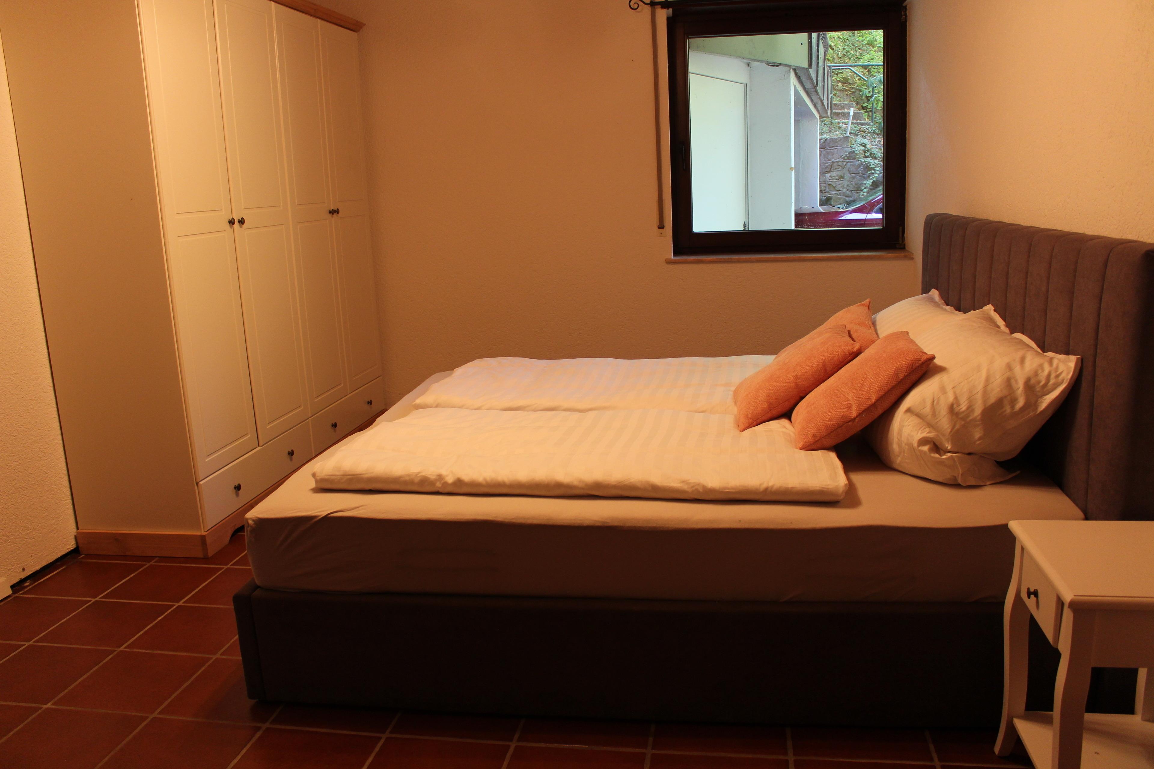 Das geräumige Schlafzimmer ist mit einem Doppelbett und einem Kleiderschrank eingerichtet und bietet Ihnen einen wunderschönen Ausblick auf den Pfälzer Wald.