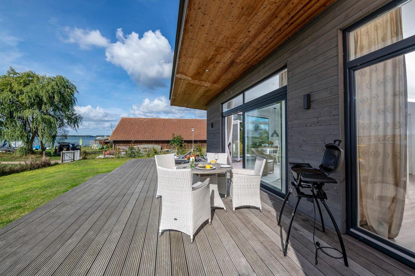 Die großzügige, 55 m² große Bankirai-Holzterrasse bietet ganztägig Sonne und lädt zum Entspannen ein.