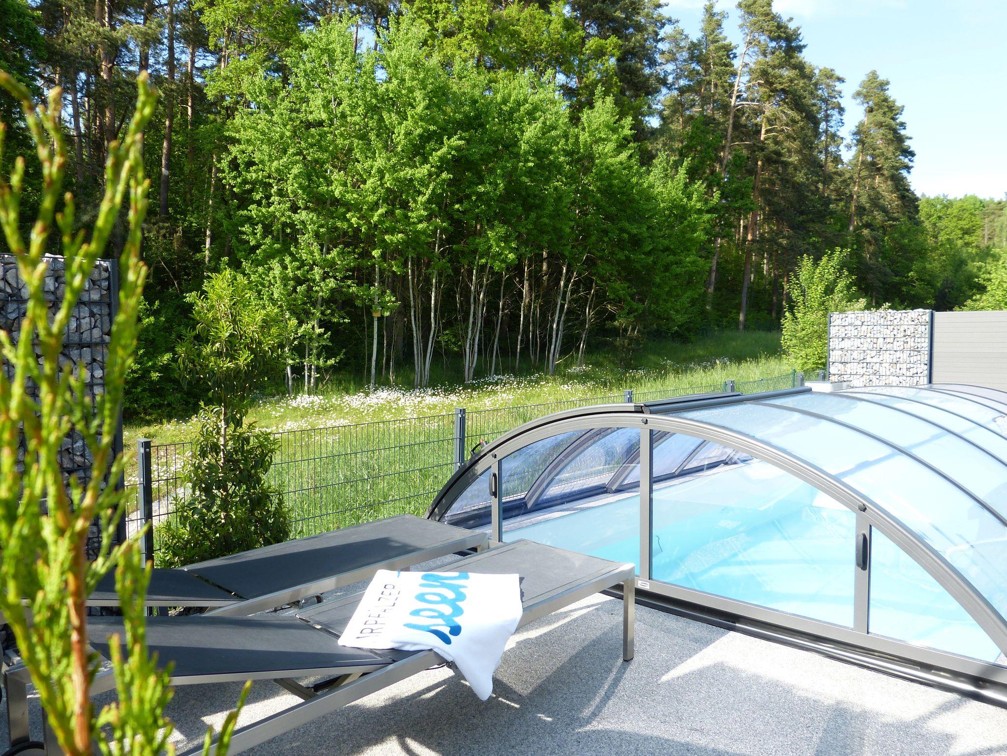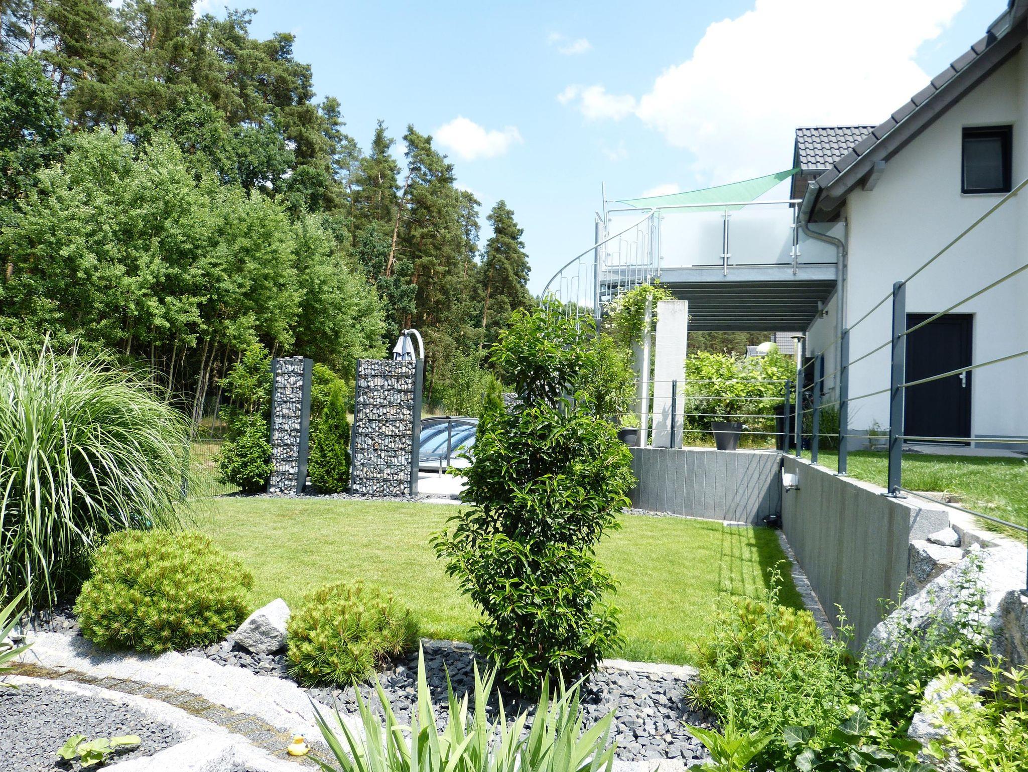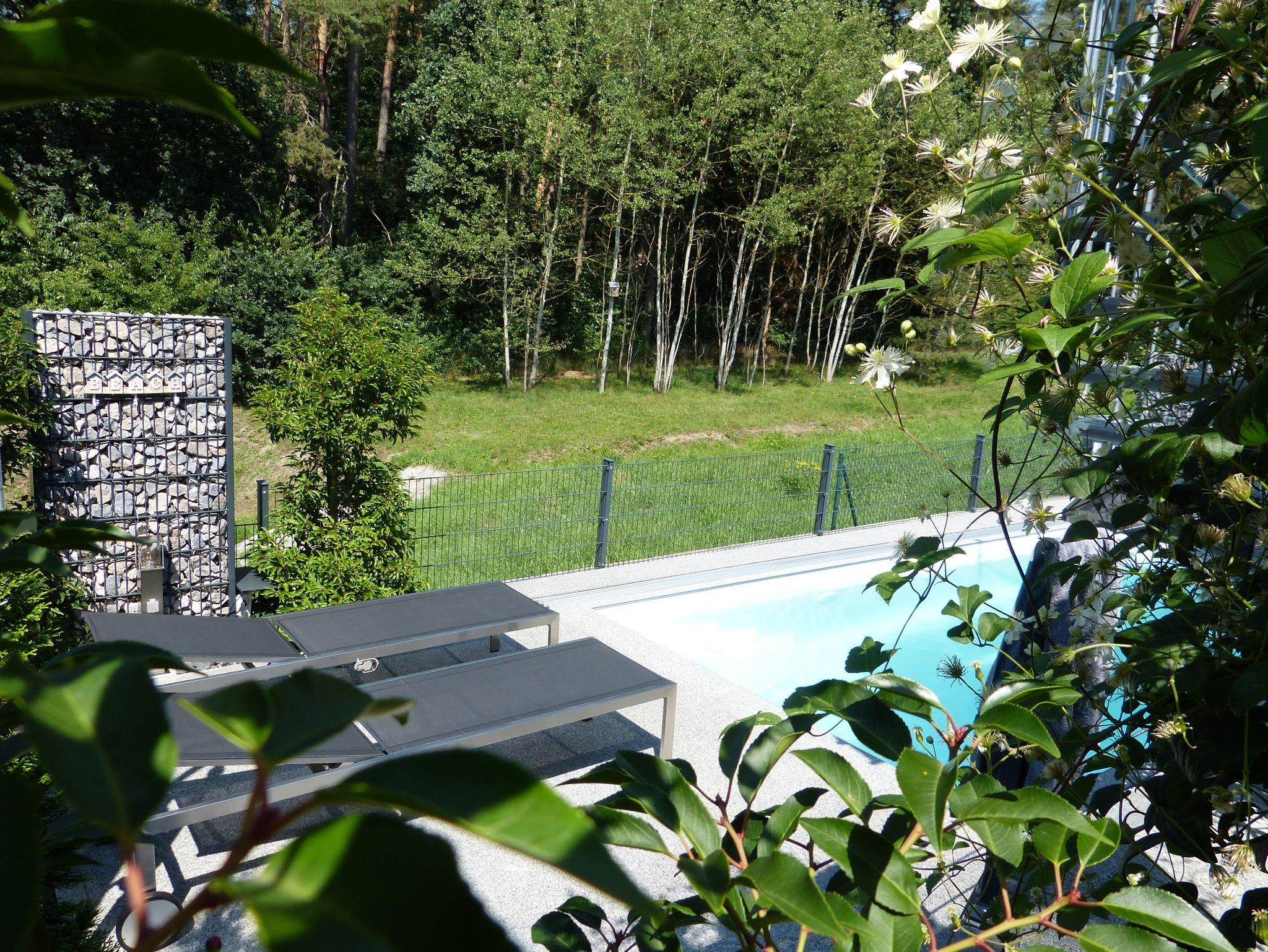 Das Urlaubsobjekt präsentiert sich als eine moderne, naturnahe und ruhige Ferienwohnung mit traumhaftem Ausblick in den liebevoll gestalteten Garten, die angrenzende Naturfläche und den Wald. Besonders die große Dachterrasse ist der perfekte Ort, um zu entspannen und die Natur zu genießen. Im Garten des Anwesens befindet sich ein, beheizter Außenpool mit Gegenstromanlage. Ein besonders praktisches Ausstattungsmerkmal ist die mobile Überdachung, dank der Sie auch an Regentagen den Wasserspaß von ca. Mai bis Oktober genießen dürfen. Ein anschließendes Sonnendeck mit zwei Liegen sowie einer Außendusche ergänzen dieses Areal. Der Wellness-Bereich mit 60-Grad-Wärmekabine – als ideale Alternative zur echten Sauna -, ein Sessel mit Massagefunktion, ein Minitrampolin sowie weiteren Interieurs befindet sich gleich nebenan und rundet das aktive und entspannende Angebot der Ferienwohnung ab.