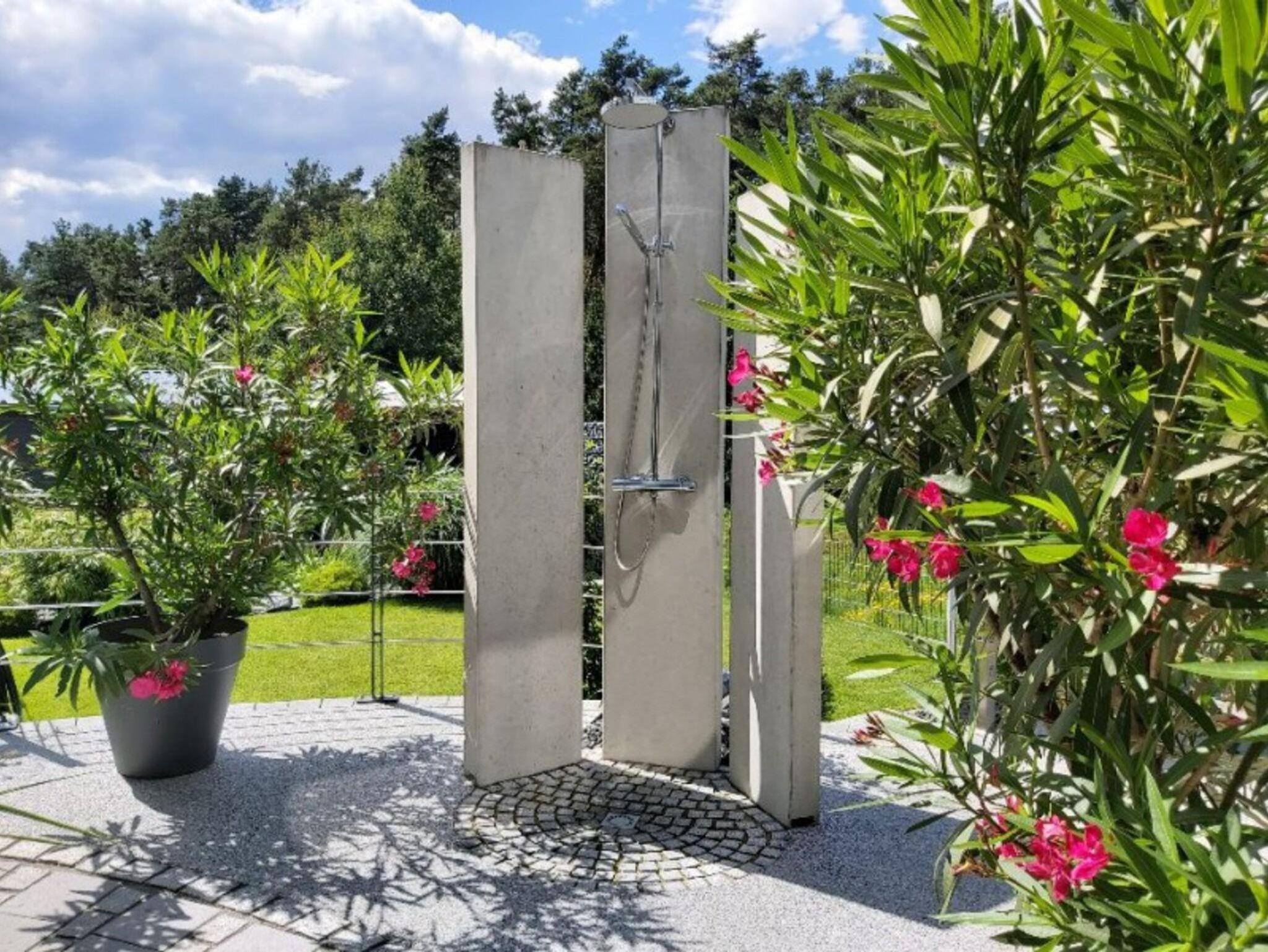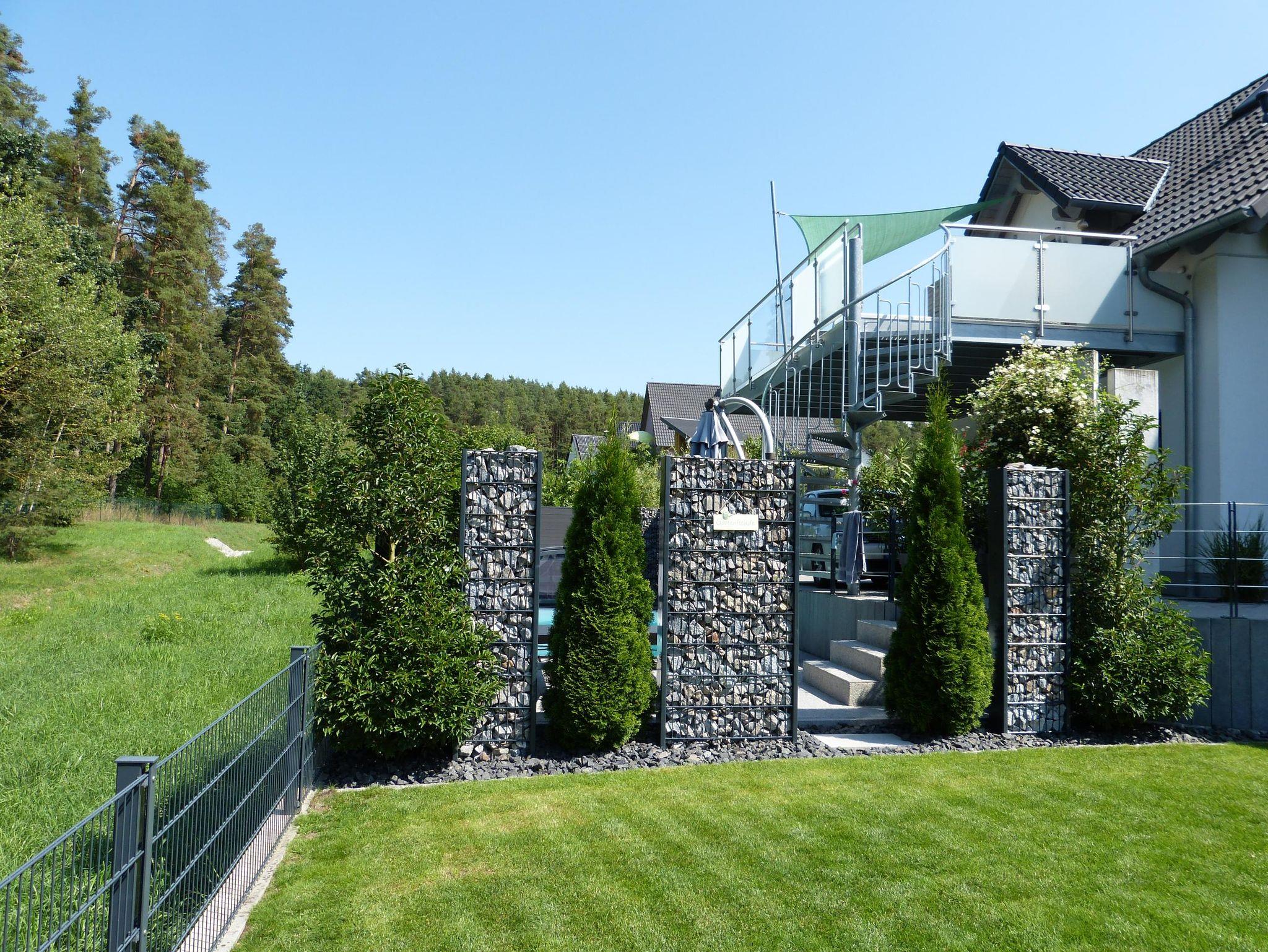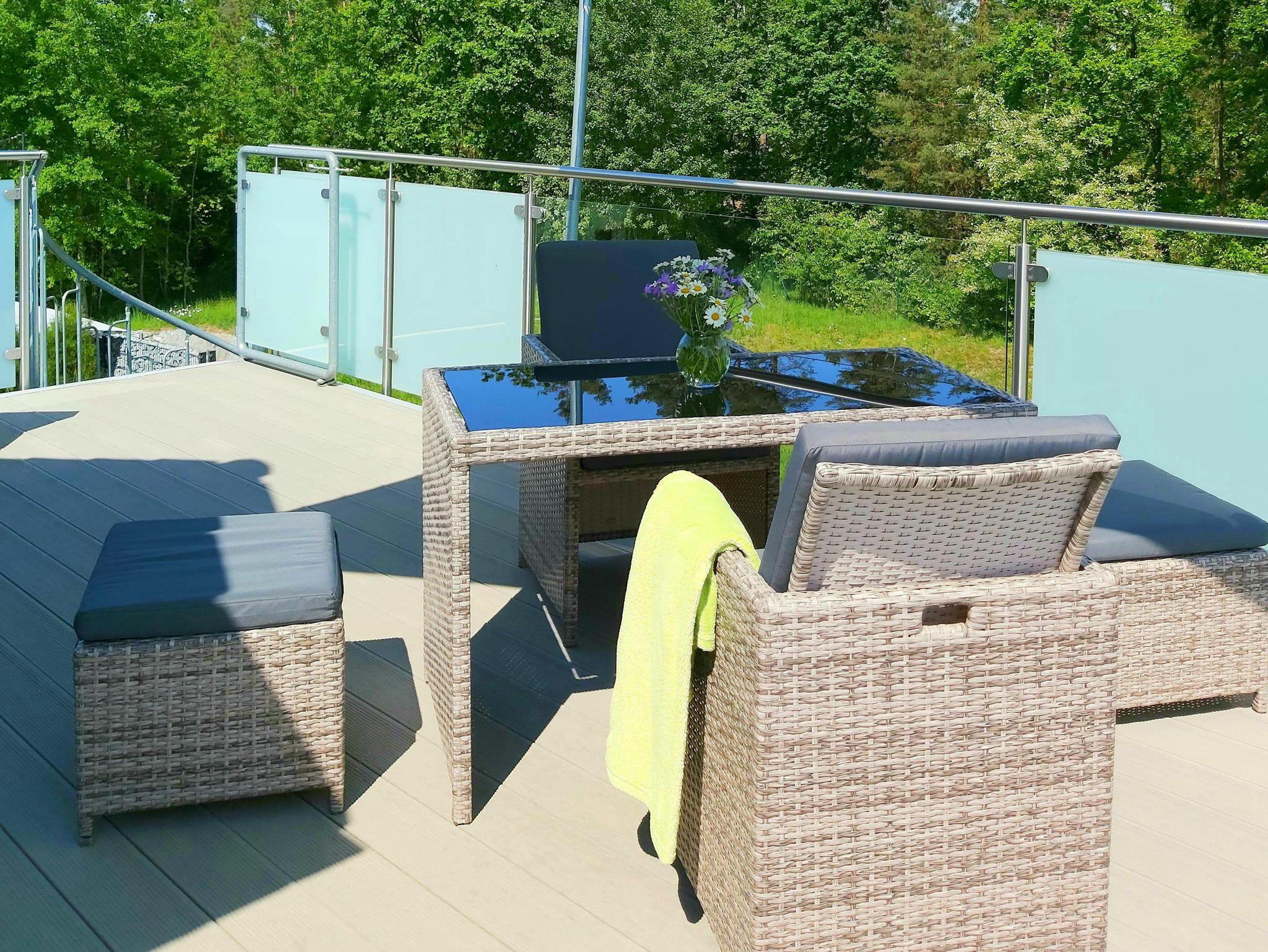 Das Urlaubsobjekt präsentiert sich als eine moderne, naturnahe und ruhige Ferienwohnung mit traumhaftem Ausblick in den liebevoll gestalteten Garten, die angrenzende Naturfläche und den Wald. Besonders die große Dachterrasse ist der perfekte Ort, um zu entspannen und die Natur zu genießen. Im Garten des Anwesens befindet sich ein, beheizter Außenpool mit Gegenstromanlage. Ein besonders praktisches Ausstattungsmerkmal ist die mobile Überdachung, dank der Sie auch an Regentagen den Wasserspaß von ca. Mai bis Oktober genießen dürfen. Ein anschließendes Sonnendeck mit zwei Liegen sowie einer Außendusche ergänzen dieses Areal. Der Wellness-Bereich mit 60-Grad-Wärmekabine – als ideale Alternative zur echten Sauna -, ein Sessel mit Massagefunktion, ein Minitrampolin sowie weiteren Interieurs befindet sich gleich nebenan und rundet das aktive und entspannende Angebot der Ferienwohnung ab.
