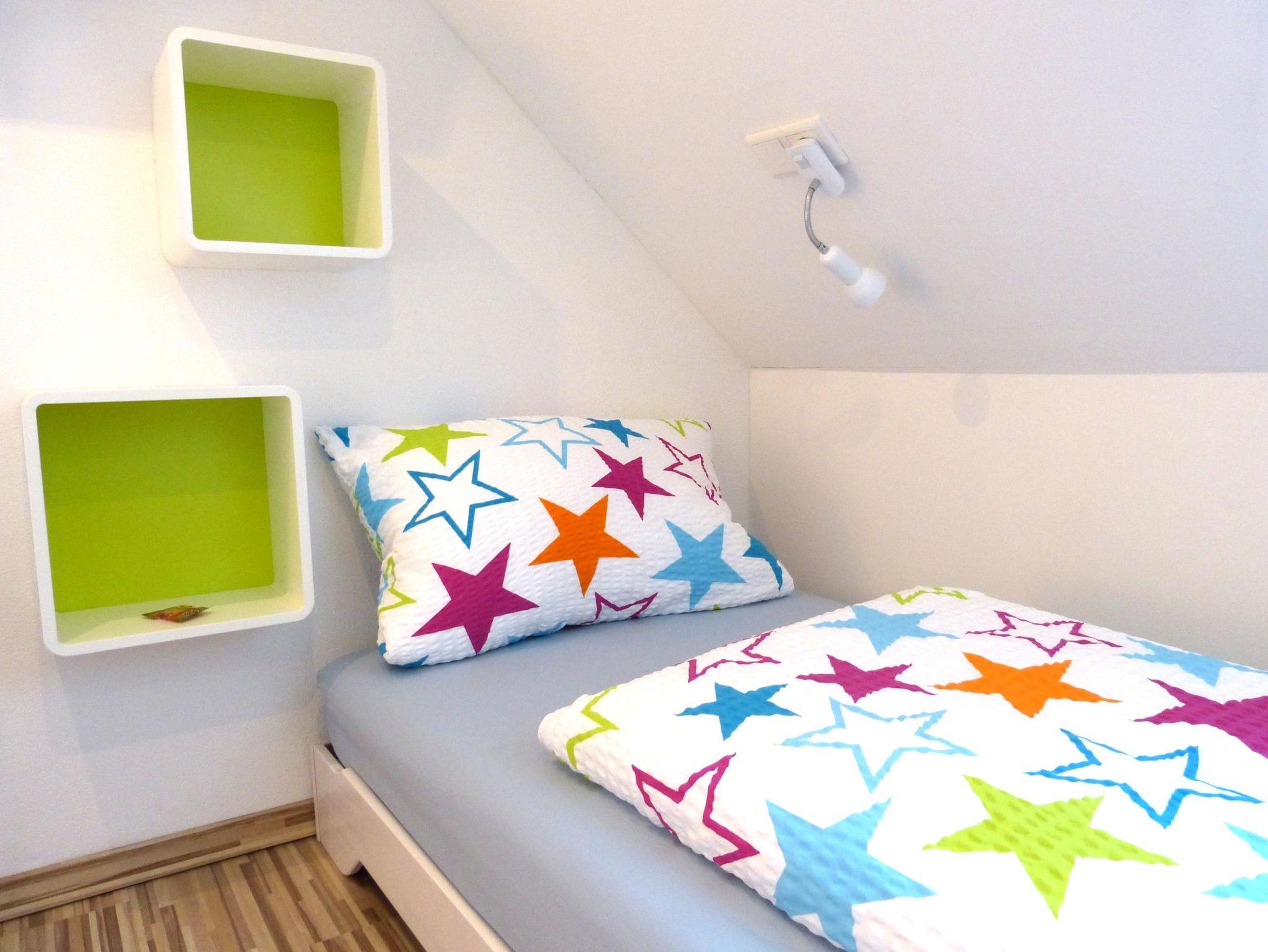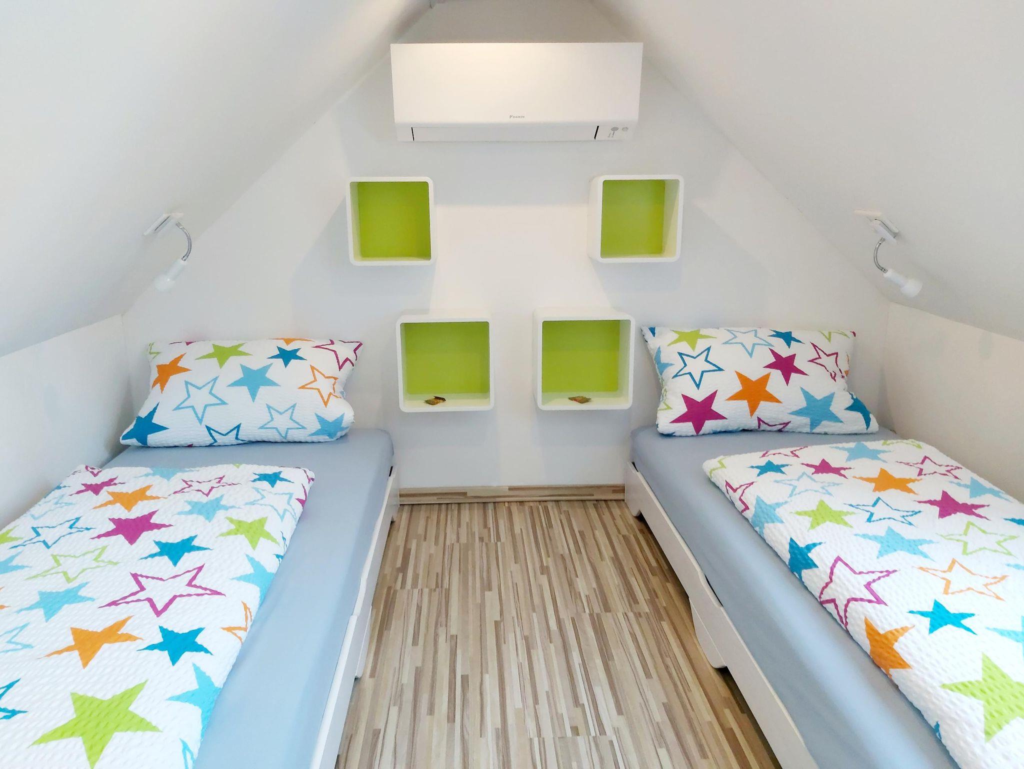 Das zweite Schlafzimmer in der oberen Ebene bietet speziell Kindern ein kleines eigenes Reich zum Wohlfühlen. Zwei flexible und flache Einzelbetten, eine praktische Kommode, kleine Regalwürfel und eine Klimaanlage sorgen für behaglichen Wohnkomfort. Eine vorgelagerte Galerie mit Kindertischgruppe und einer Auswahl an Spielmaterial lädt unsere kleinen Gäste zum Spielen und Entdecken ein. Auch Erwachsene können hier schlafen, jedoch aufgrund der charmanten Dachschräge ist dies besonders für kleinere, junggebliebene Erwachsene geeignet, die die einzigartige Atmosphäre lieben.