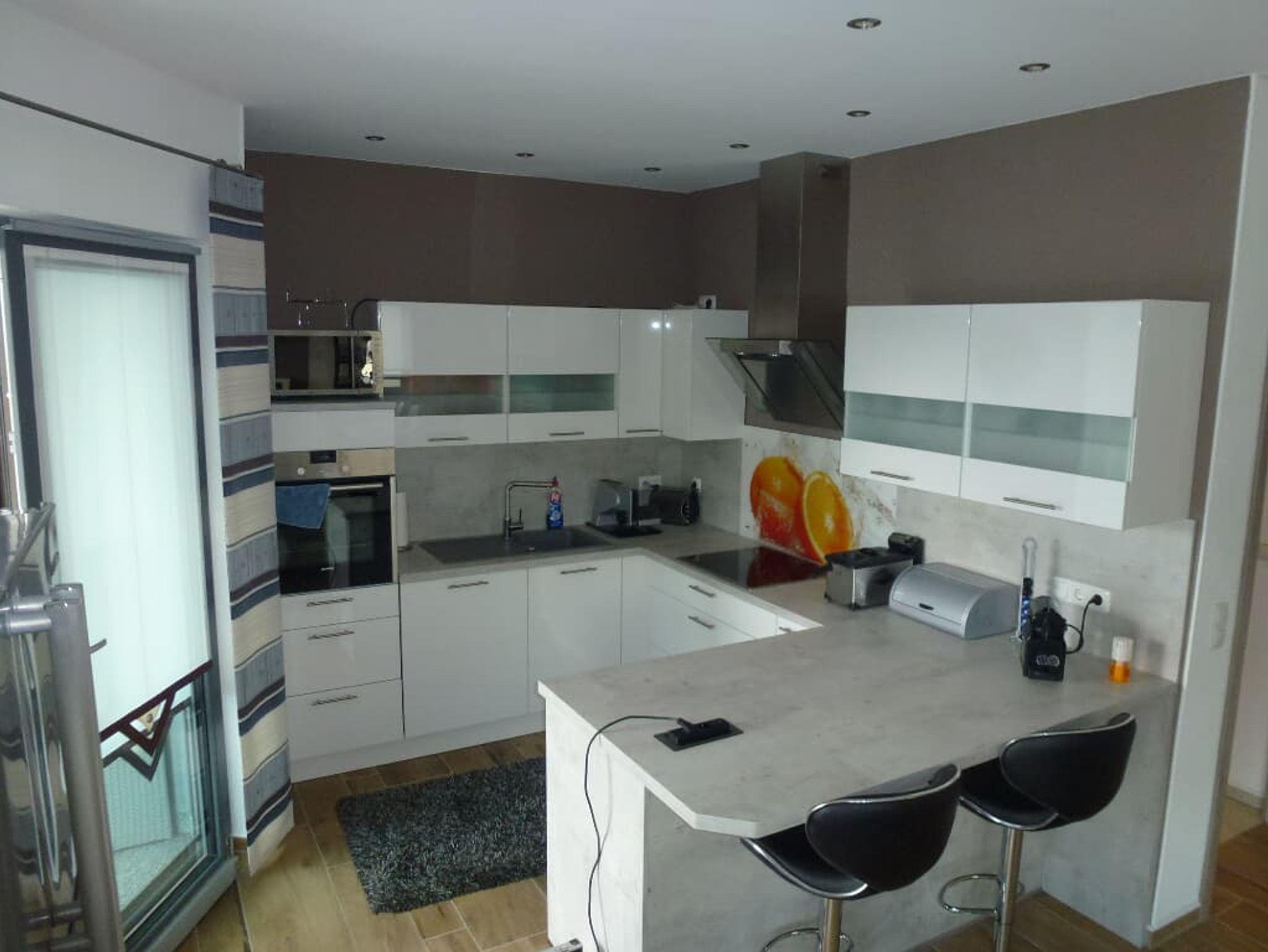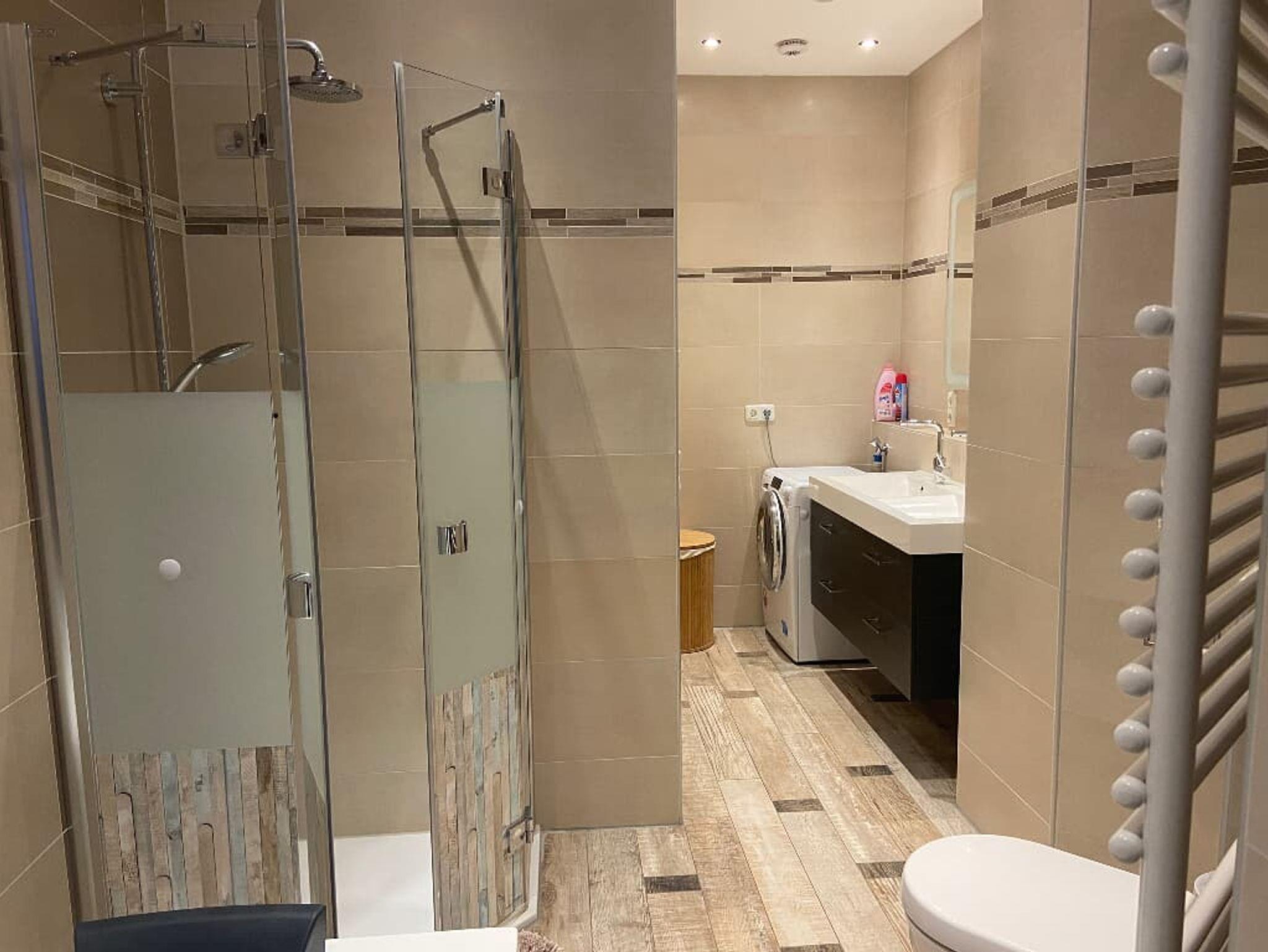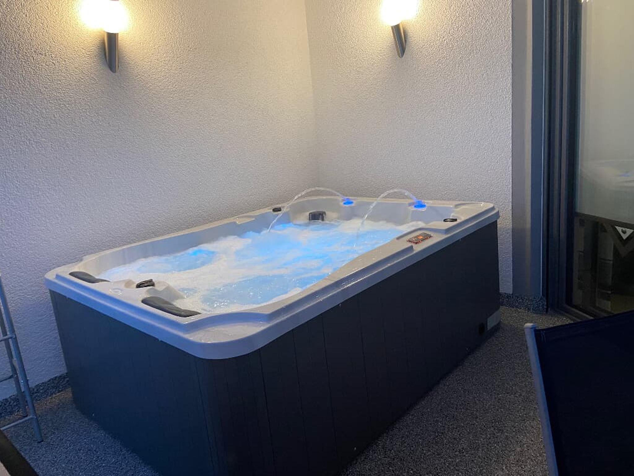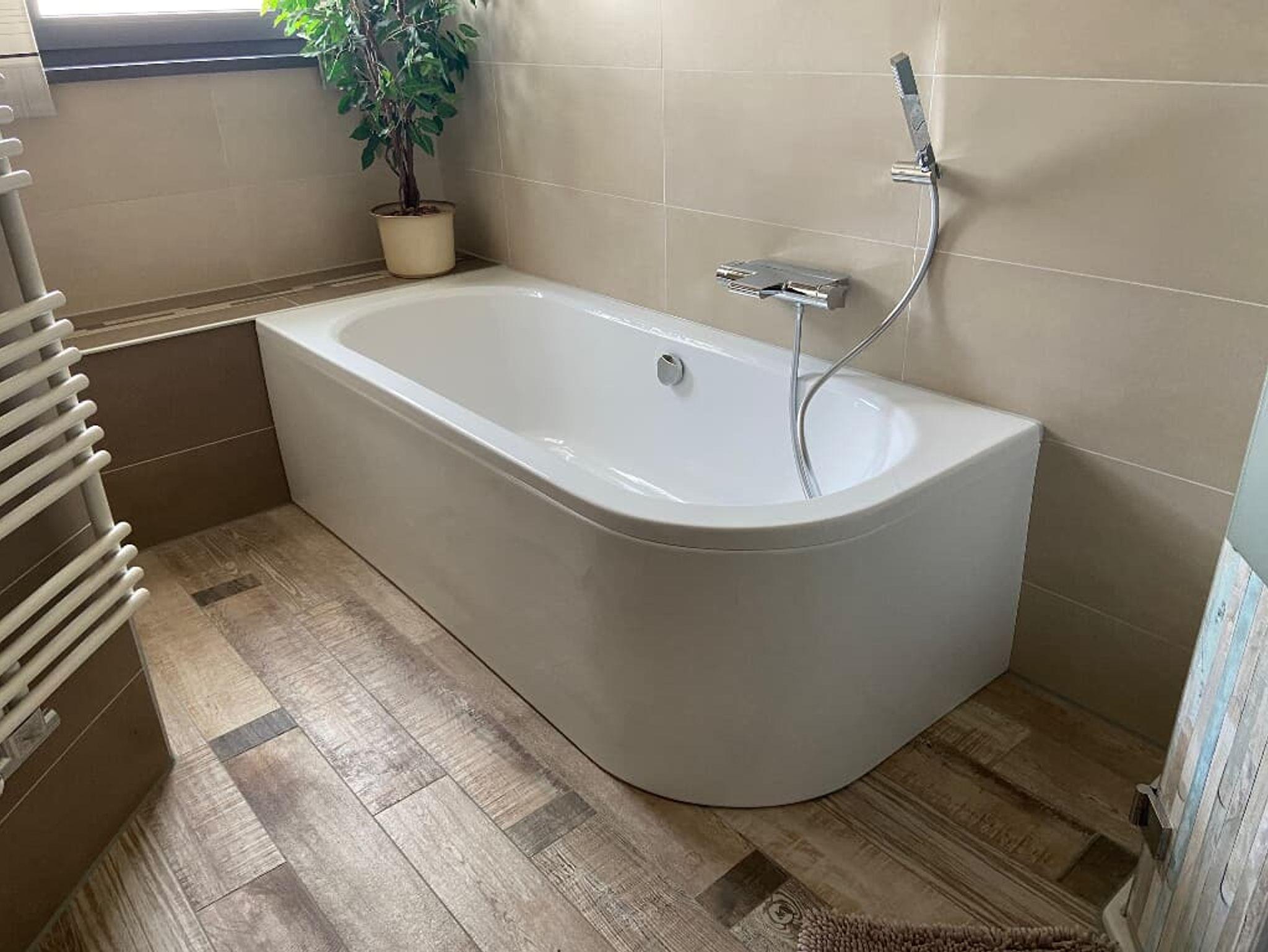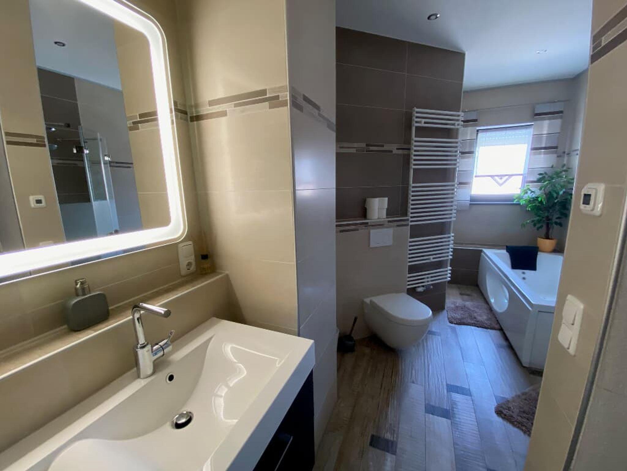 Das Badezimmer ist mit Dusche und einer Badewanne ausgestattet. Der Balkon der Wohnung ist auf dem Titelbild mit einem Pfeil markiert. Auf dem Balkon steht ein Whirlpool, der gegen einen Aufpreis von 30,00 € pro Tag aber mindestens 90,00 € dazugebucht werden kann. Das WLAN ist kostenfrei nutzbar.
