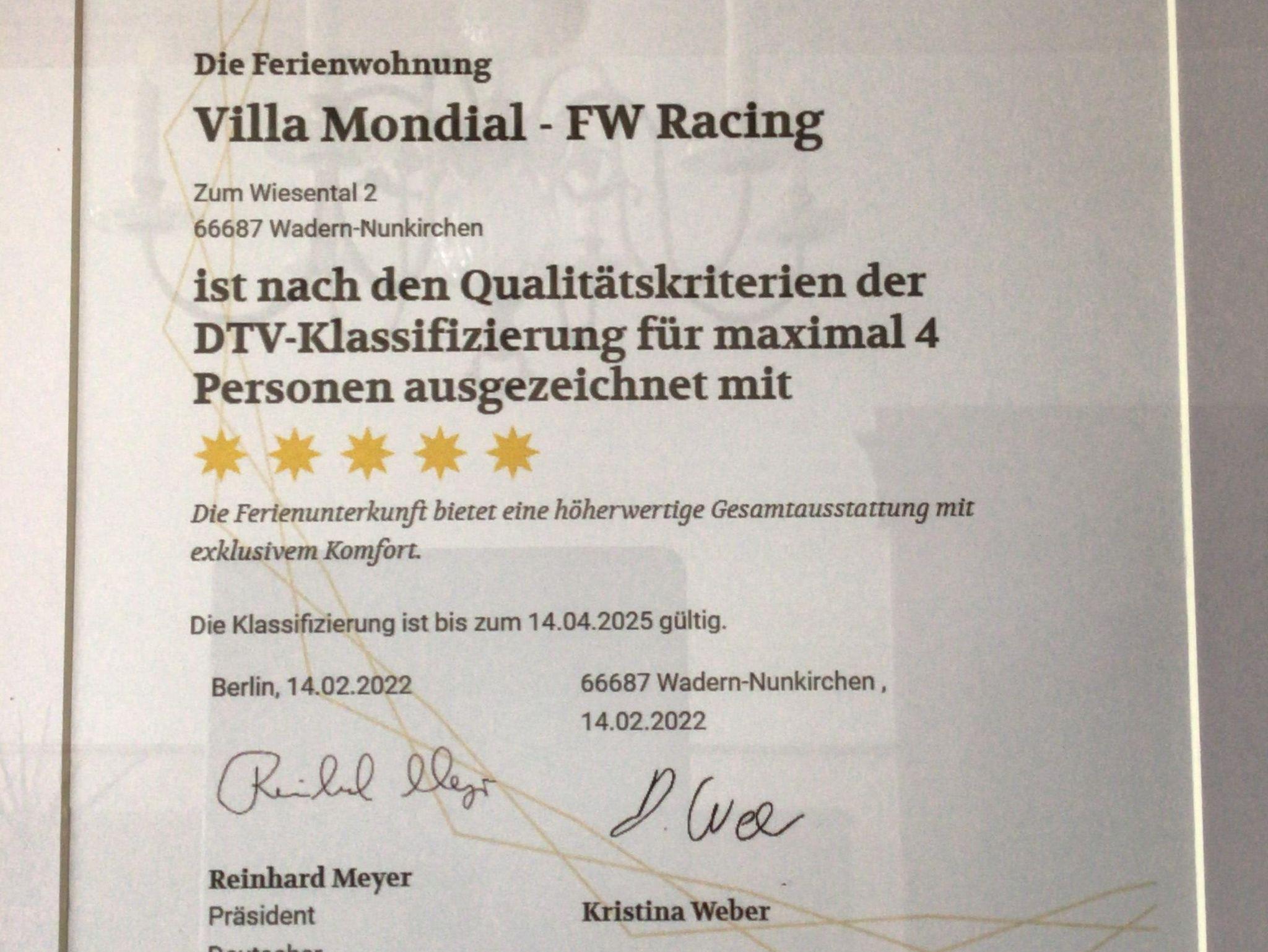 ? NEU ? Unsere Ferienwohnung Racing ist vom Deutschen Tourismusverband mit Fünf-Sternen klassifiziert worden!