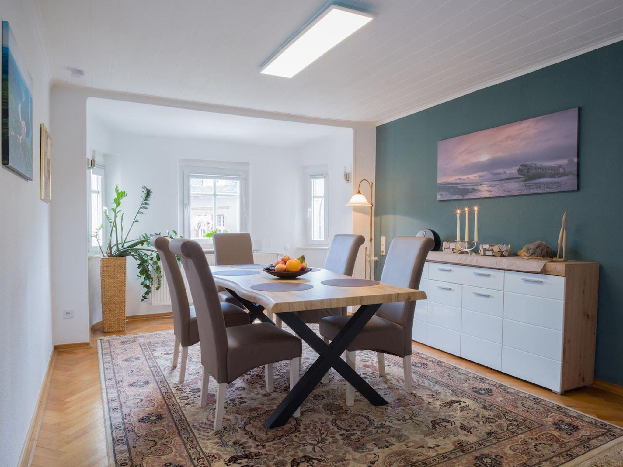 Das große Wohnzimmer mit 65 Zoll TV, sowie ein Esszimmer mit romantischem Erker laden zum Verweilen ein.