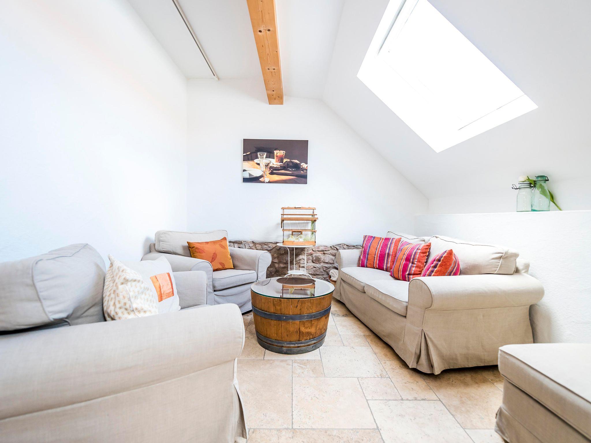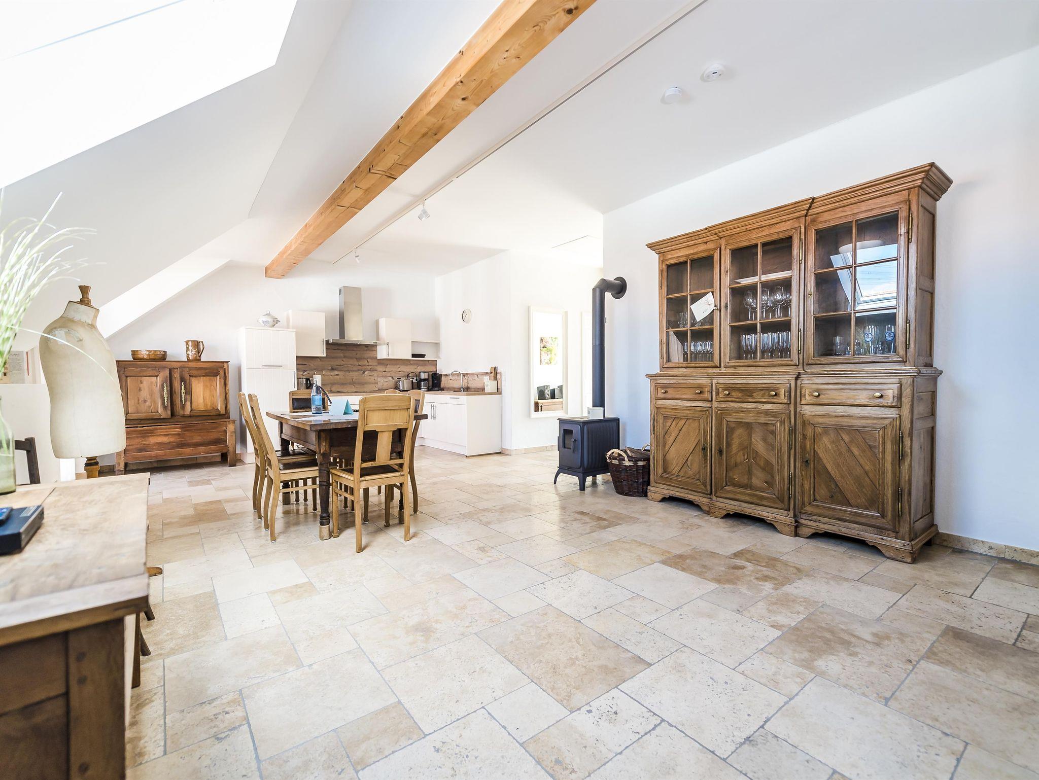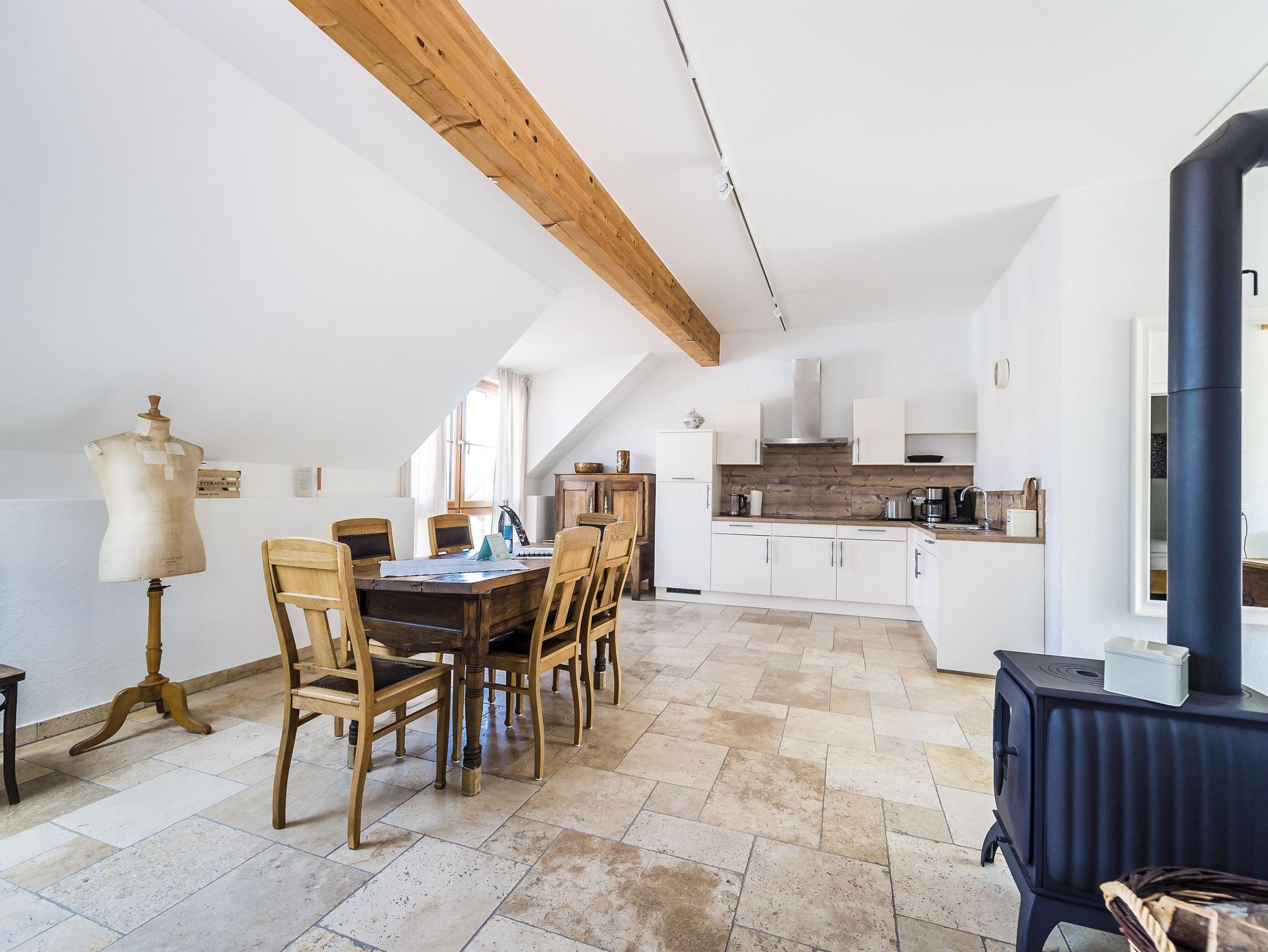 Genießen Sie auf der großzügigen Sonnenterrasse erholsame, gemütliche Abende und den Blick ins Grüne. Der offene Wohn-Essraum bietet viel Flair mit antiker Möbilierung, einem stilechten Kaminofen und sichtbarem Bruchsteinmauerwerk. Die Mischung aus liebevollen historischen Details und hochwertigem, modernem Ausbau der Räume wird auch bei Ihnen zu einem sofortigen Wohlgefühl führen.
