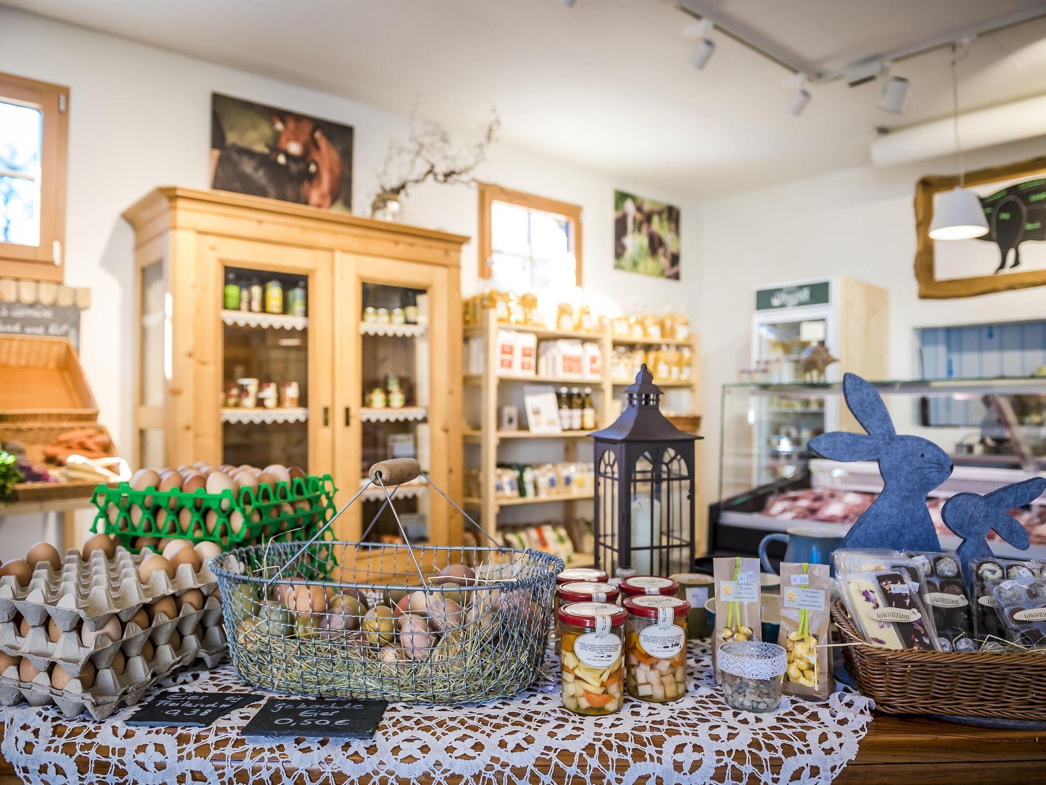 In unserem Hofladen erhalten Sie frische regionale Lebensmittel. Im Angebot erwarten Sie ausschließlich Fleisch- und Wurstprodukte von hofeigenen Tieren und aus Schlachtung in unserer hofeigenen Metzgerei. Das Hochwälder LandEi stammt von unseren Hühnern aus dem Mobilstall. Aus unseren eigenen Eiern bieten wir Ihnen Nudelvariationen und selbstgemachten Eierlikör an. Selbstgemachte Marmeladen, Chutneys o.ä. runden das Angebot ab. Daneben finden Sie ein Vollsortiment besonderer regionaler und Bio-Lebensmittel wie Gemüse, Obst, Backwaren und Milchprodukte. Hofladen geöffnet Freitag und Samstag sowie auf Anfrage.