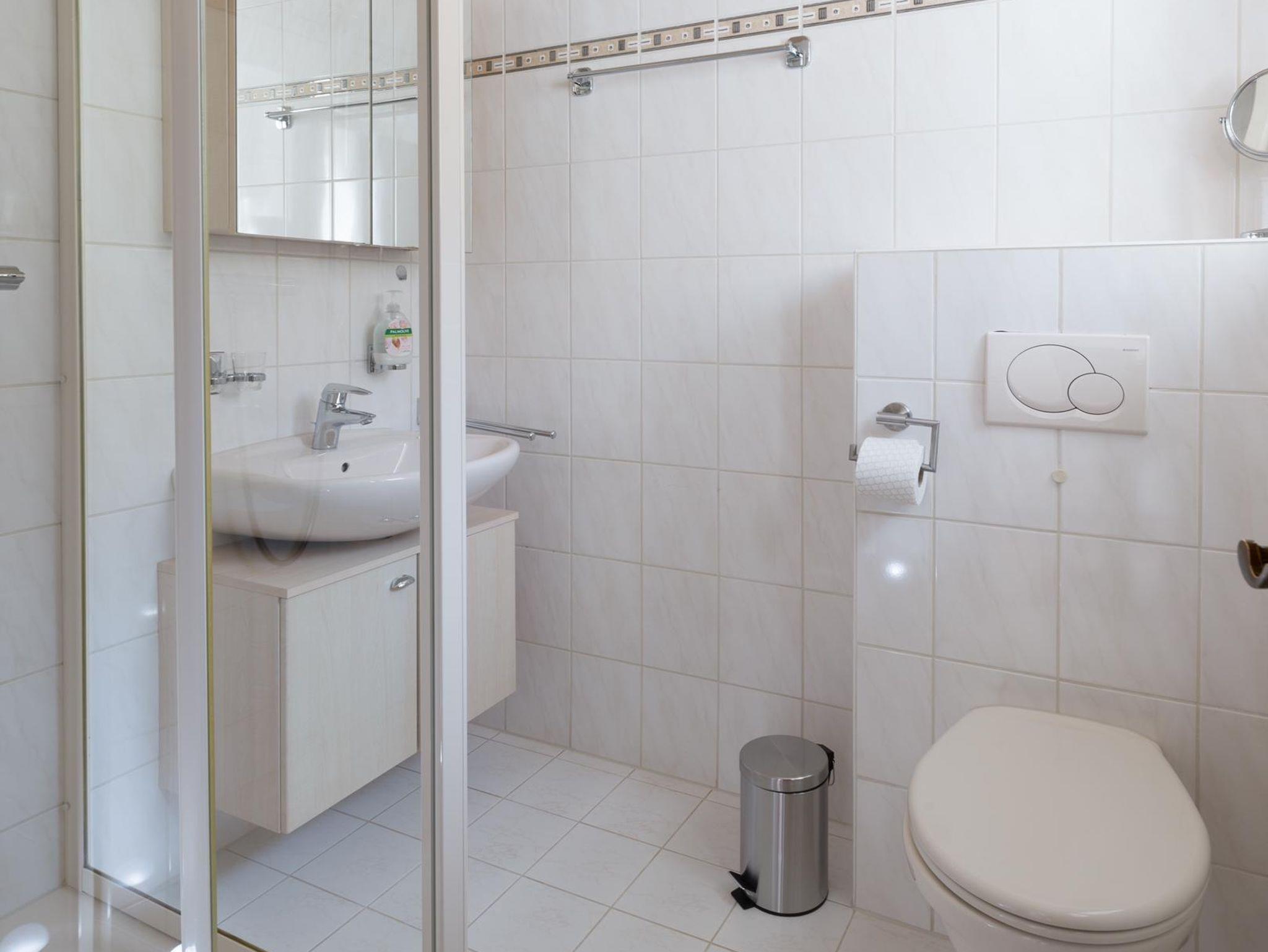 Das Tageslichtbad ist mit einem Waschbecken, Dusche und WC ausgestattet.