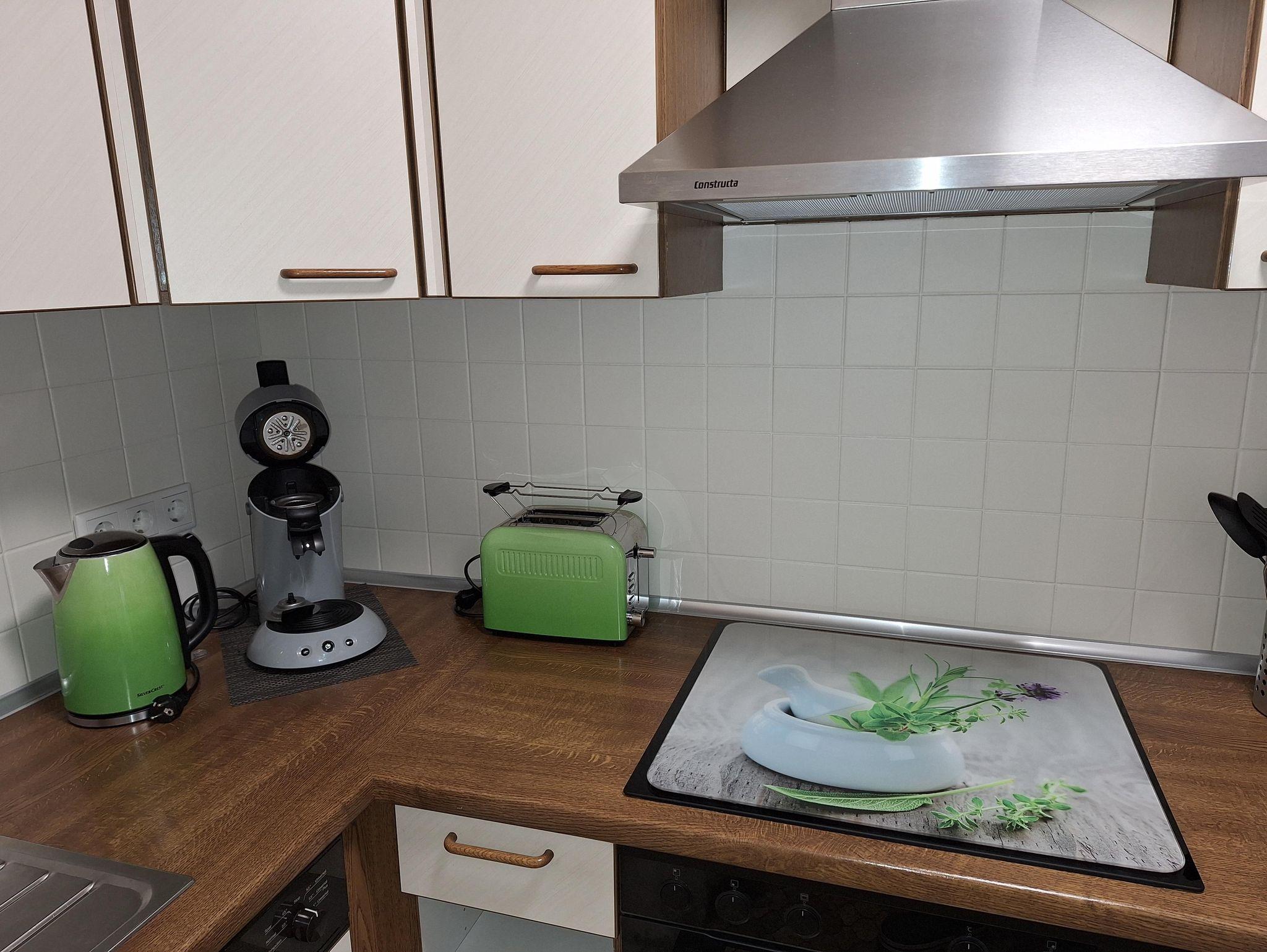 Die gemütliche Küche ist voll ausgestattet mit Allem was man für kulinarische Genüsse braucht. Außerdem eine Senseo + Espressi Kaffeemaschine, Sodastream mit Glasflaschen, Toaster und Wasserkocher.