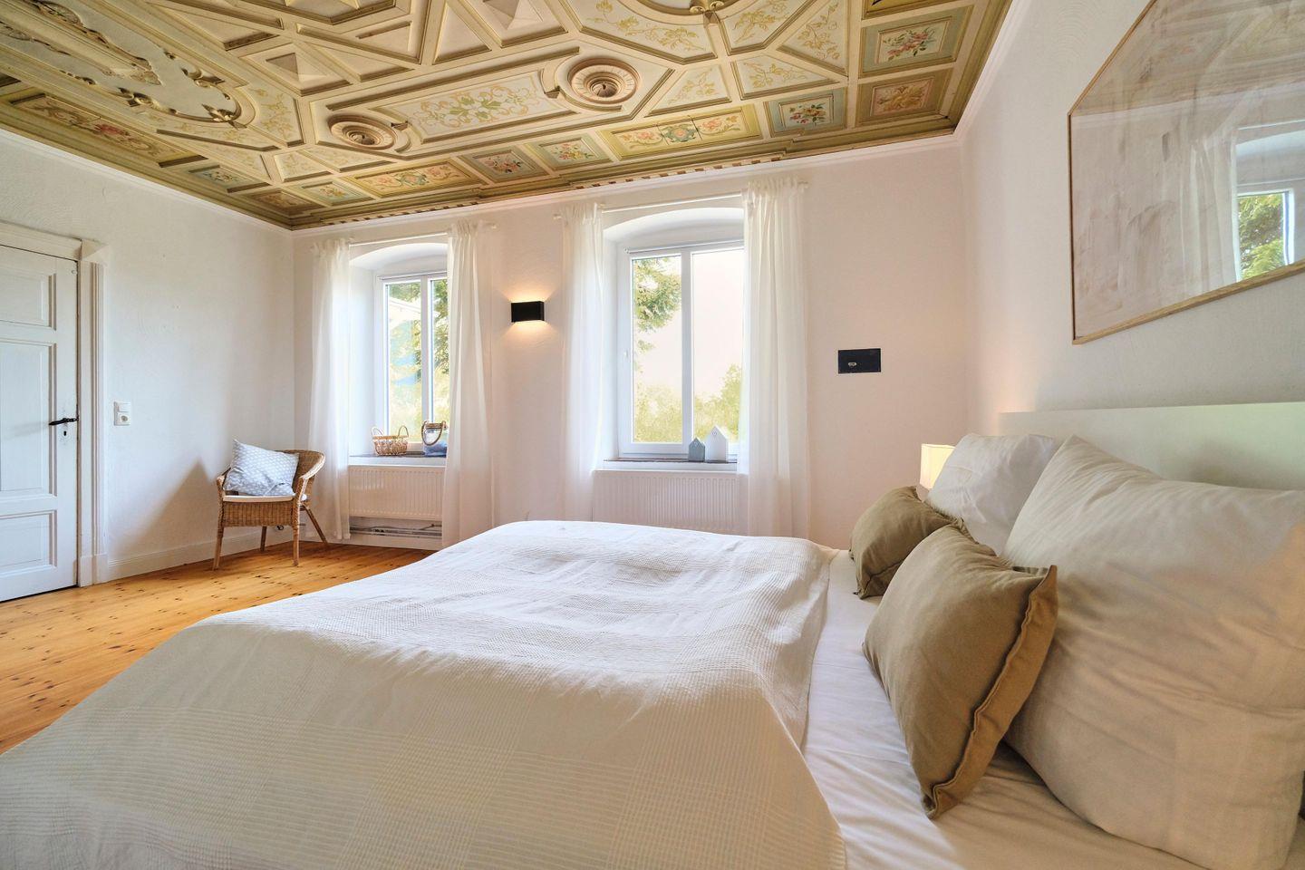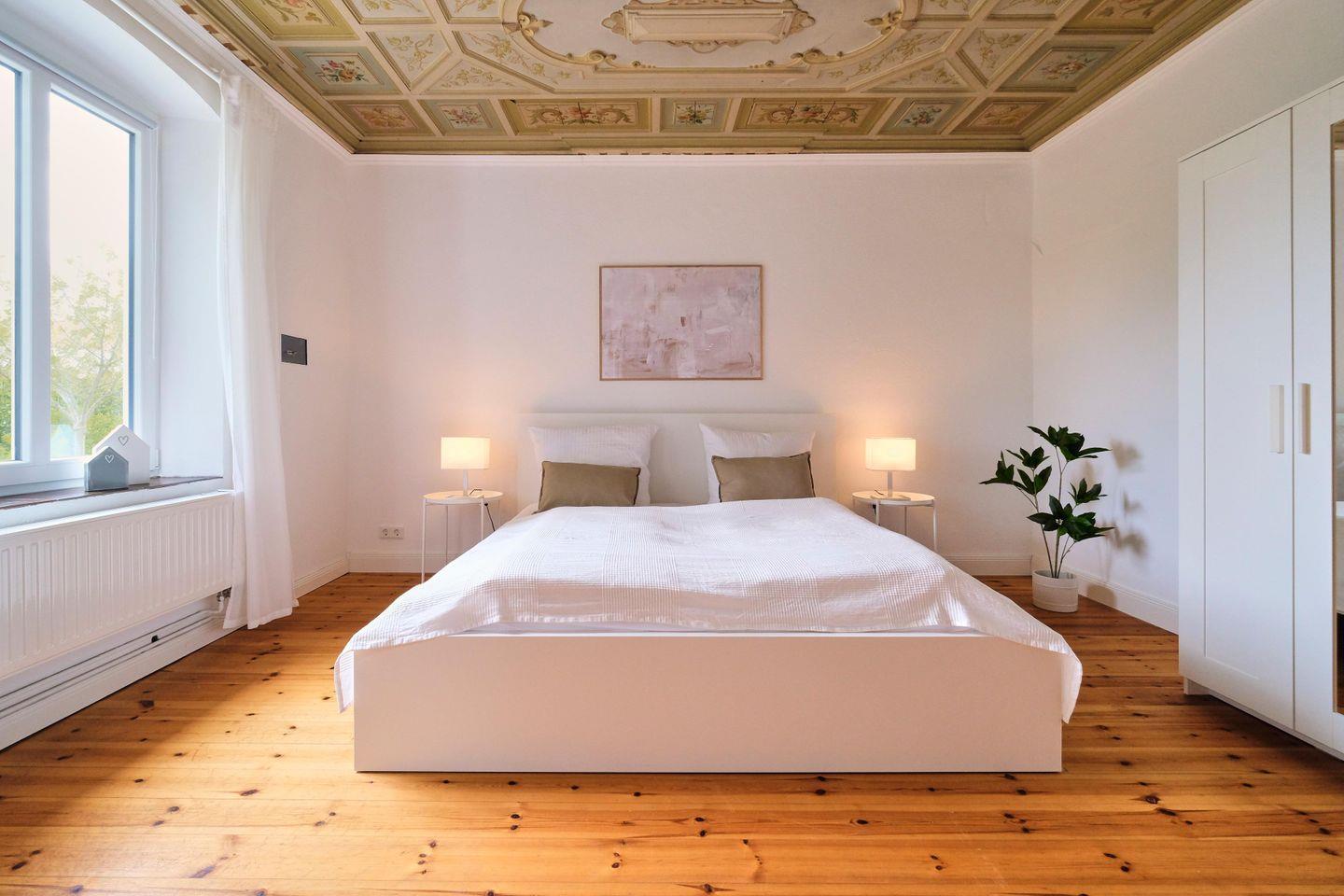 Der Charme der Wohnung wird durch sorgfältig restaurierten Stuck, antike Deckenmalerei und hohe Fenster geprägt, die eine ganz besondere Atmosphäre verleihen.