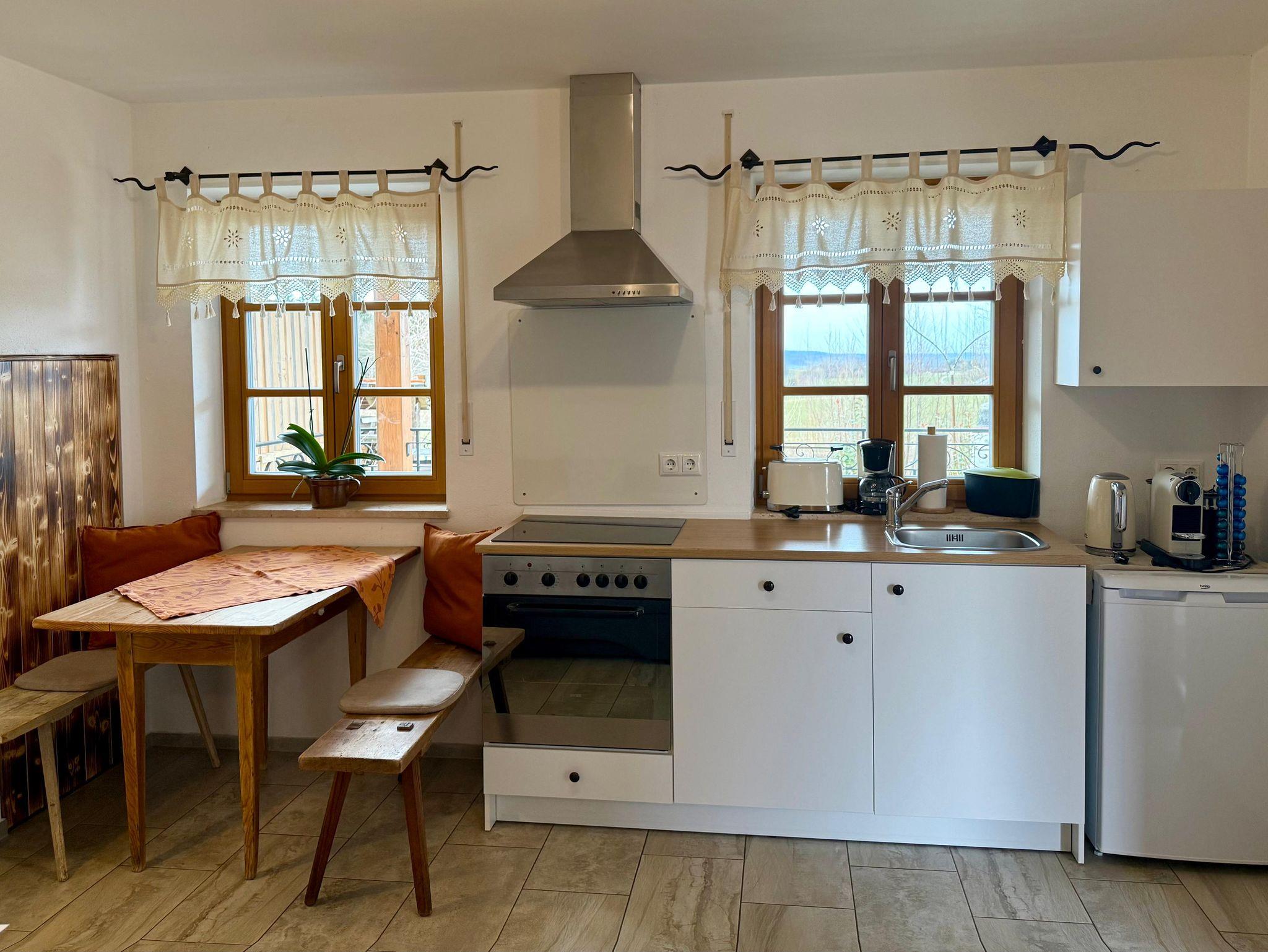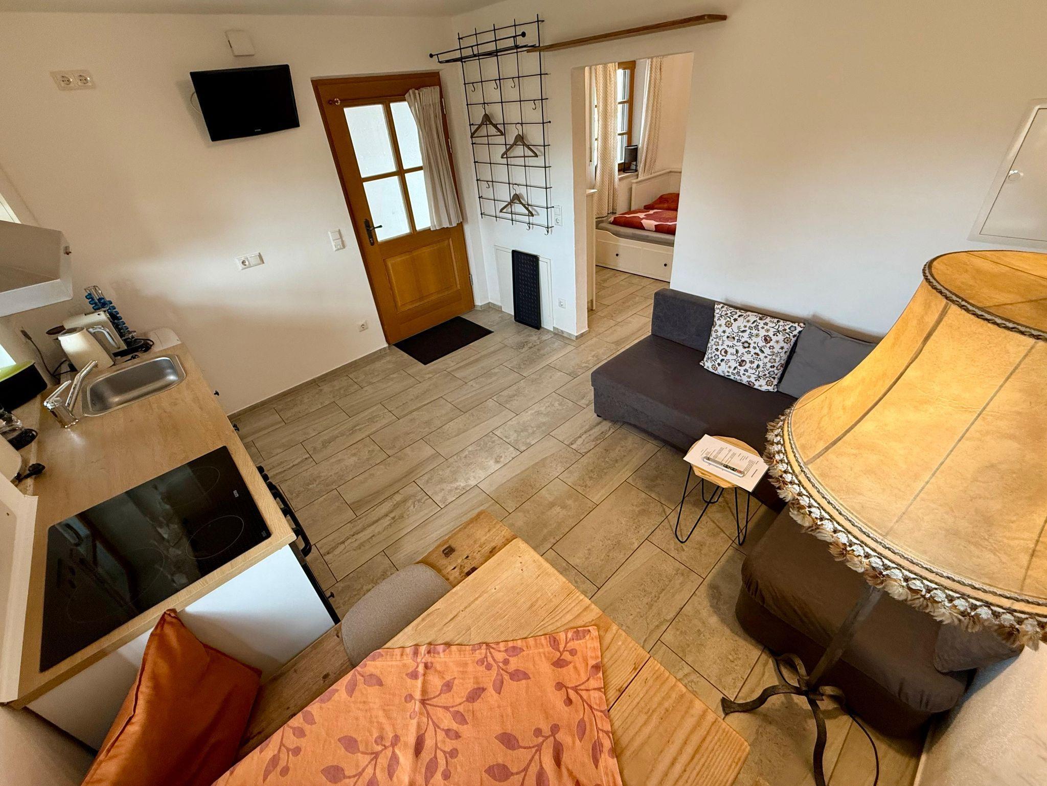 Die Ferienwohnung liegt im EG, hat einen eigenen Eingang und bietet Platz für bis 2 Personen. Das heißt es steht Ihnen ein Doppelbett und eine Ausziehcouch zur Verfügung. Geheizt wird mit Fußbodenheizung. Küche komplett eingerichtet, Wlan, Sat-TV. Der Schlafraum ist mit Mauern abgegrenzt, jedoch offen zur Wohnküche mit Ausziehcouch.