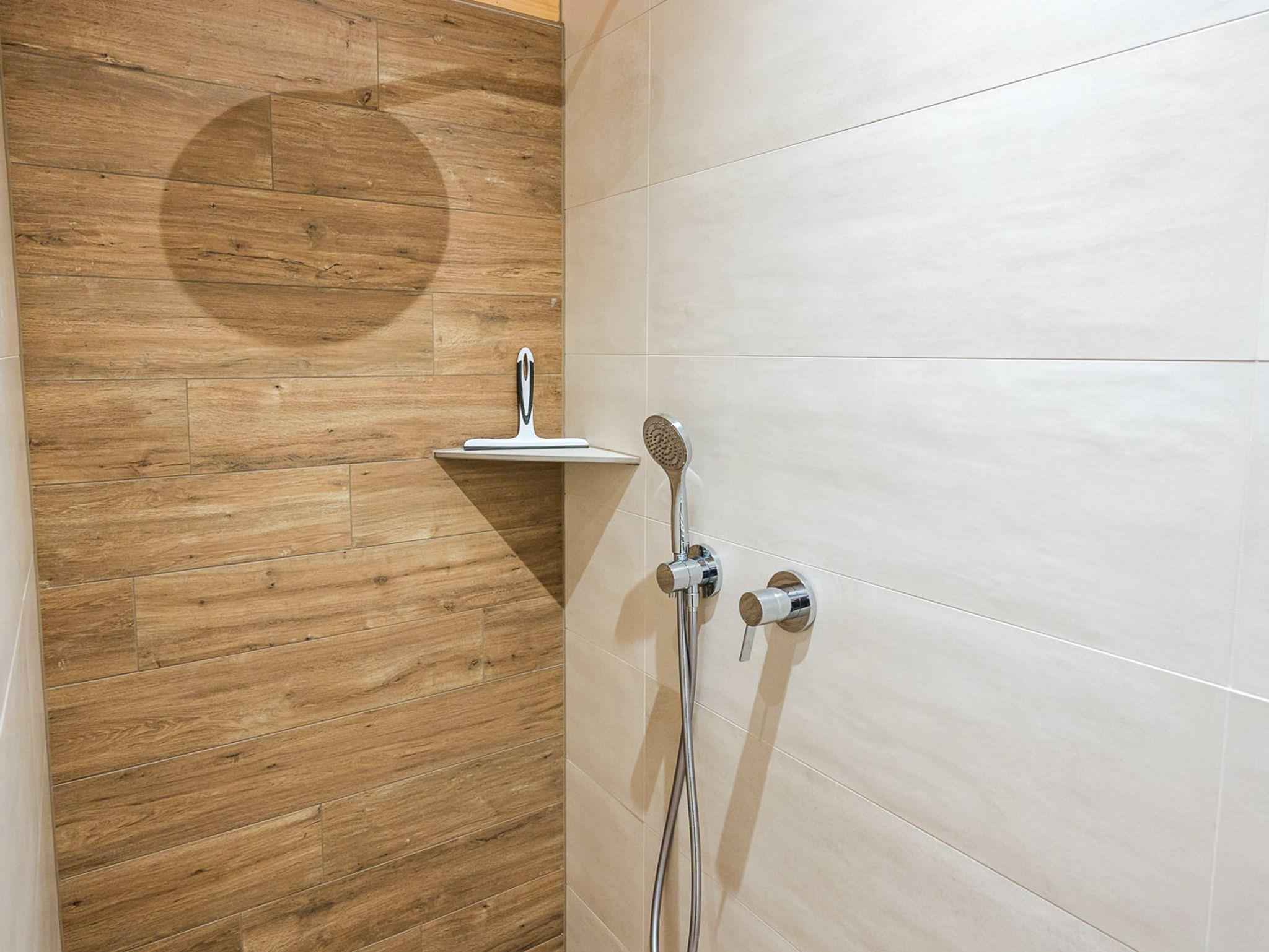 • Badezimmer: Ein modernes Bad mit Regenwalddusche, Waschbecken, Handtuchtrockner und WC.