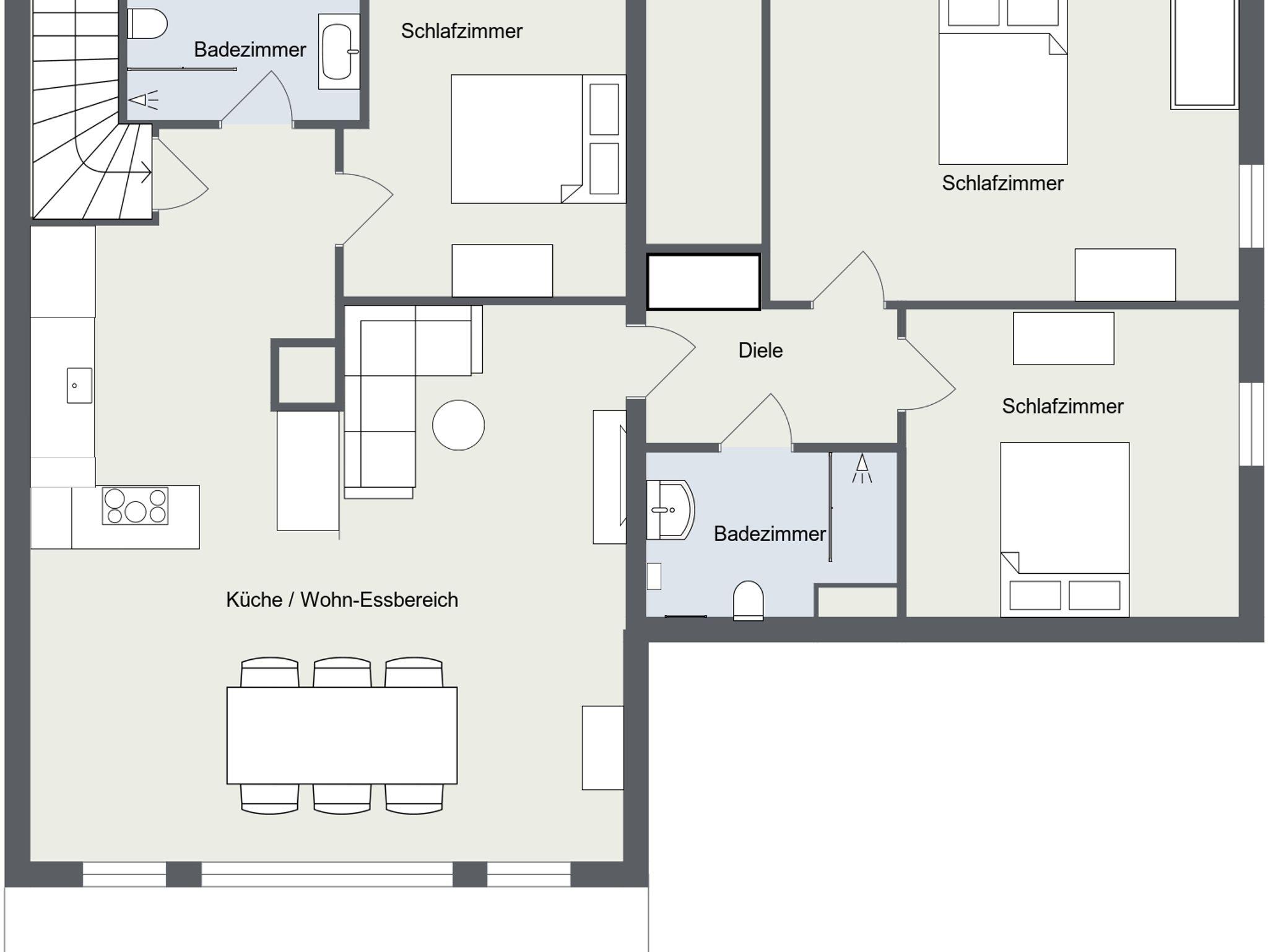 Herzlich willkommen in unserer geräumigen und gut ausgestatteten Ferienwohnung! Die Wohnung befindet sich im 1. Stock, hat eine Größe von rund 100 m² und bietet Platz für bis zu 6 Personen. 3 Schlafzimmer, 2 Duschen mit WC, ein großer Wohnbereich mit Küche und einen Balkon bietet Ihnen unsere Ferienwohnung. Im Garten wartet ein eigener Grillplatz auf Sie. Waschmaschine, Trockner und ein überdachter Parkplatz inklusive.