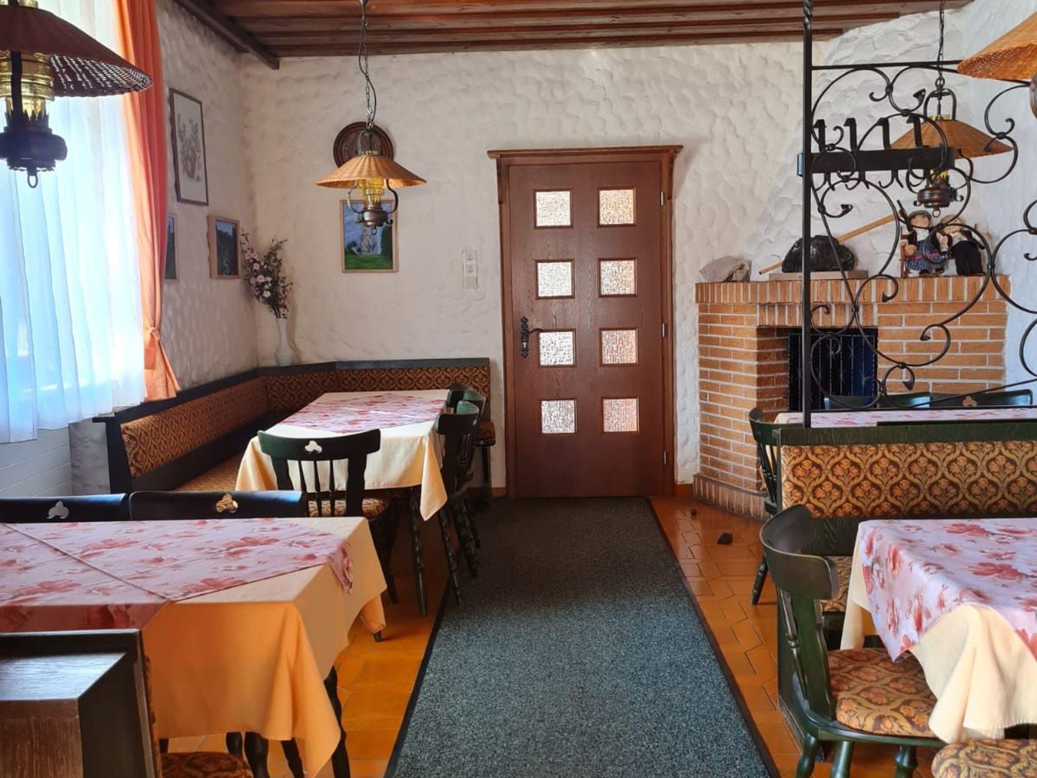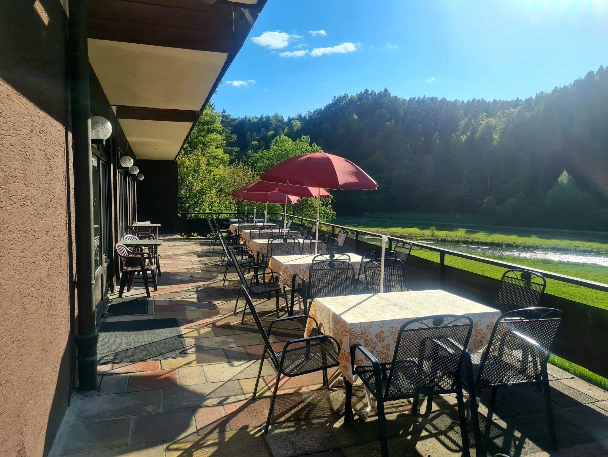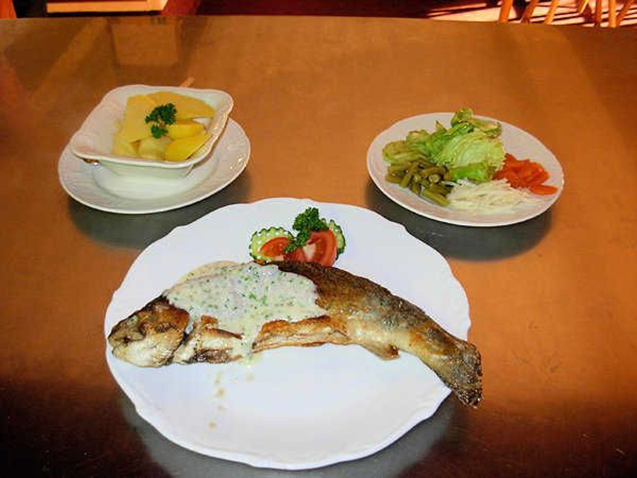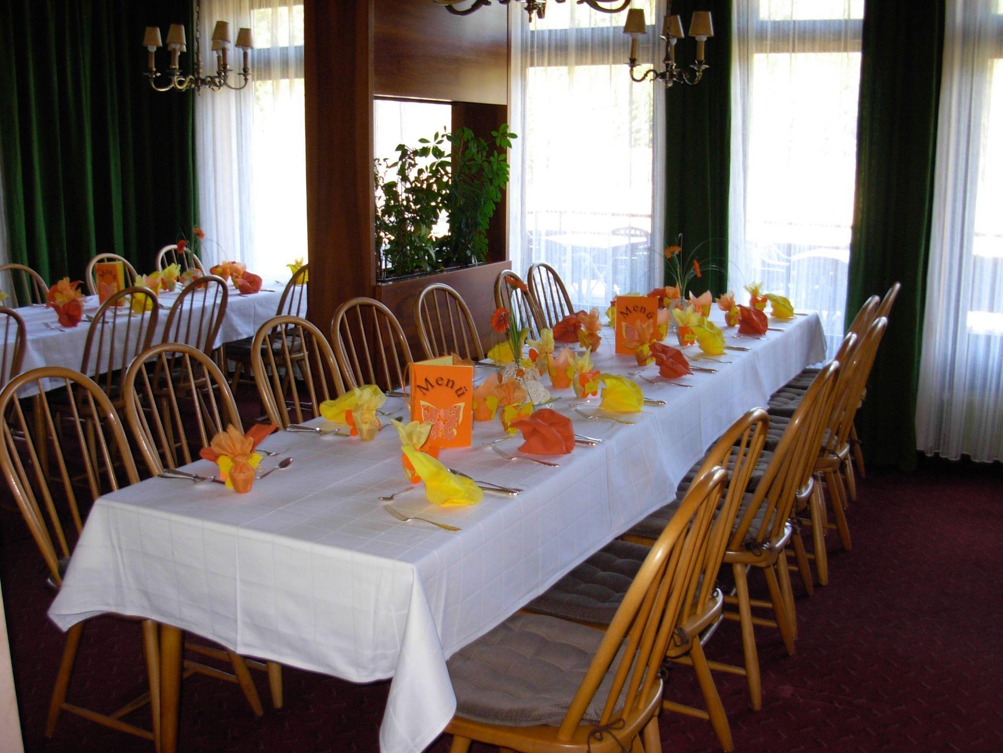 Im Parterre befindet sich das Restaurant. Hier können Sie zu jeder Tageszeit eine entsprechende Mahlzeit einnehmen. Morgens bedienen Sie sich selbst am reichhaltigen Frühstücksbuffet, nachmittags können Sie auf unserer Sonnenterrasse frische Torten und Kuchen aus eigener Herstellung genießen und abends wählen Sie aus der Karte, die Speisen aus der guten fränkischen Küche, sowie fangfrische Forellen und Wildgerichte umfasst. In unserem Kaminzimmer finden Sie immer ein beschauliches Plätzchen in wohliger Atmosphäre.