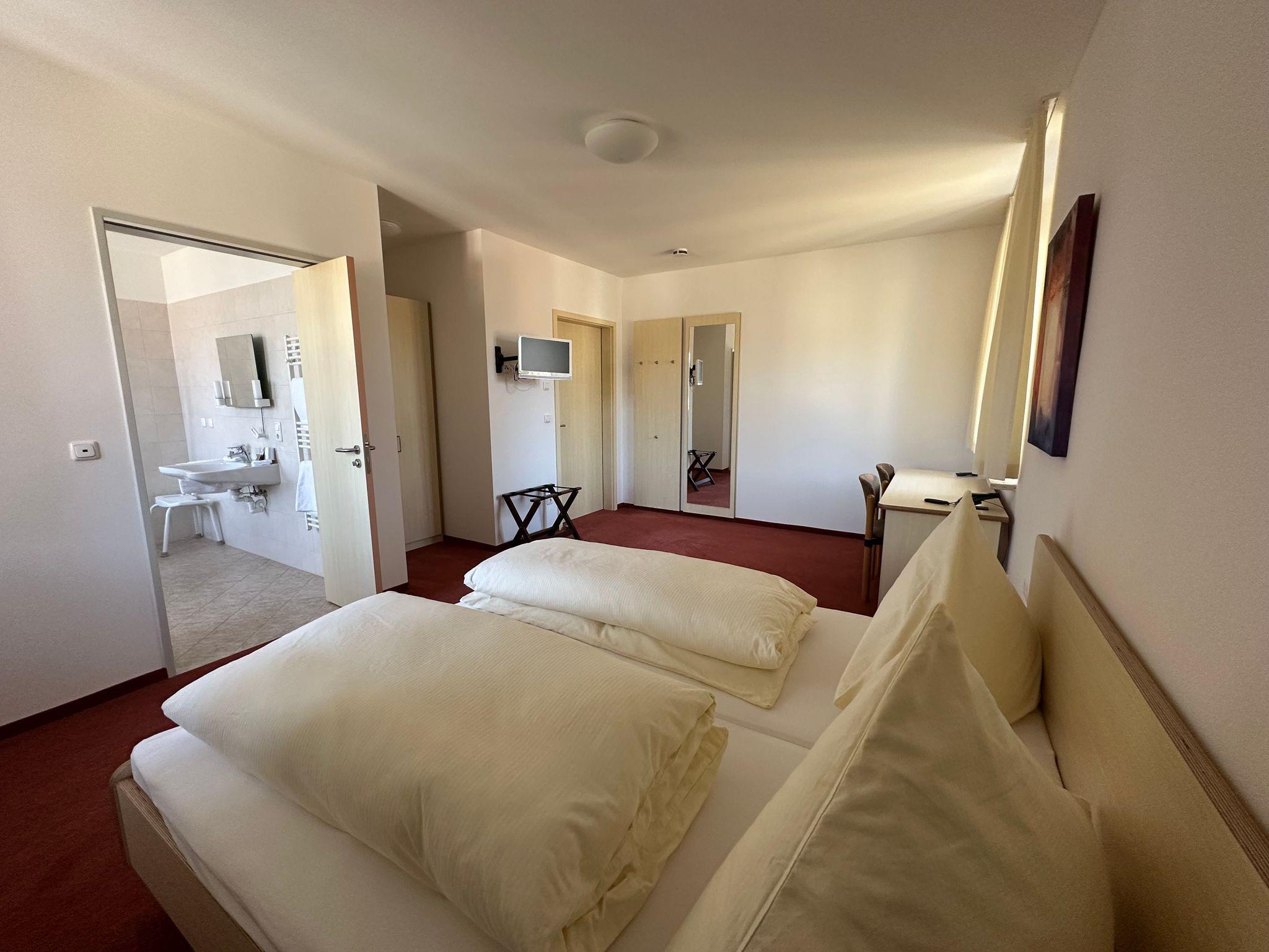 Barrierefreies Komfort Doppelzimmer: Wohlfühlraum für eine Auszeit in der Natur, Tagungen und Seminare oder für ein temporäres Büro, verbunden mit Urlaub in herrlicher Umgebung (Workation: Verschmelzung von Work und Vacation)