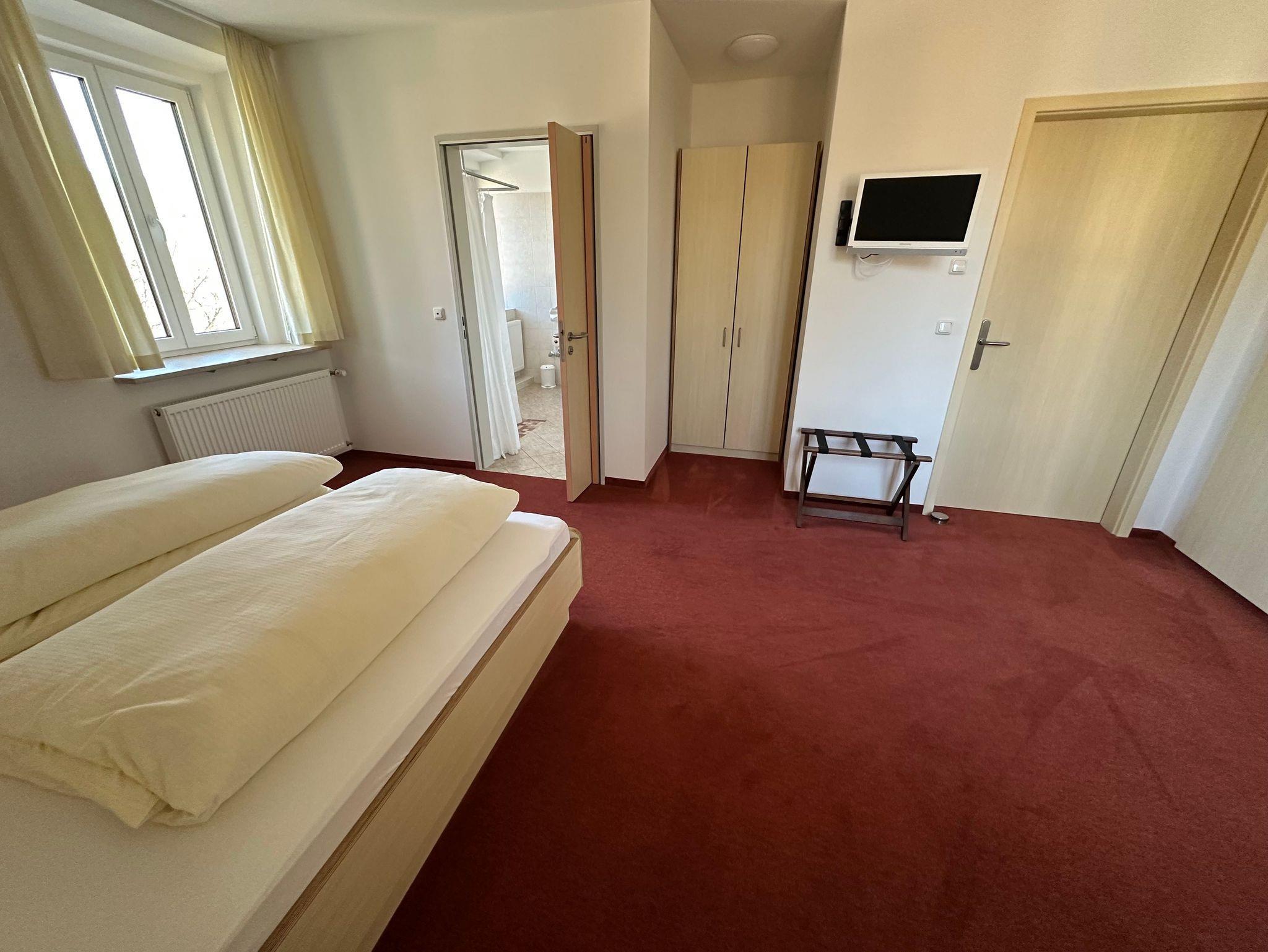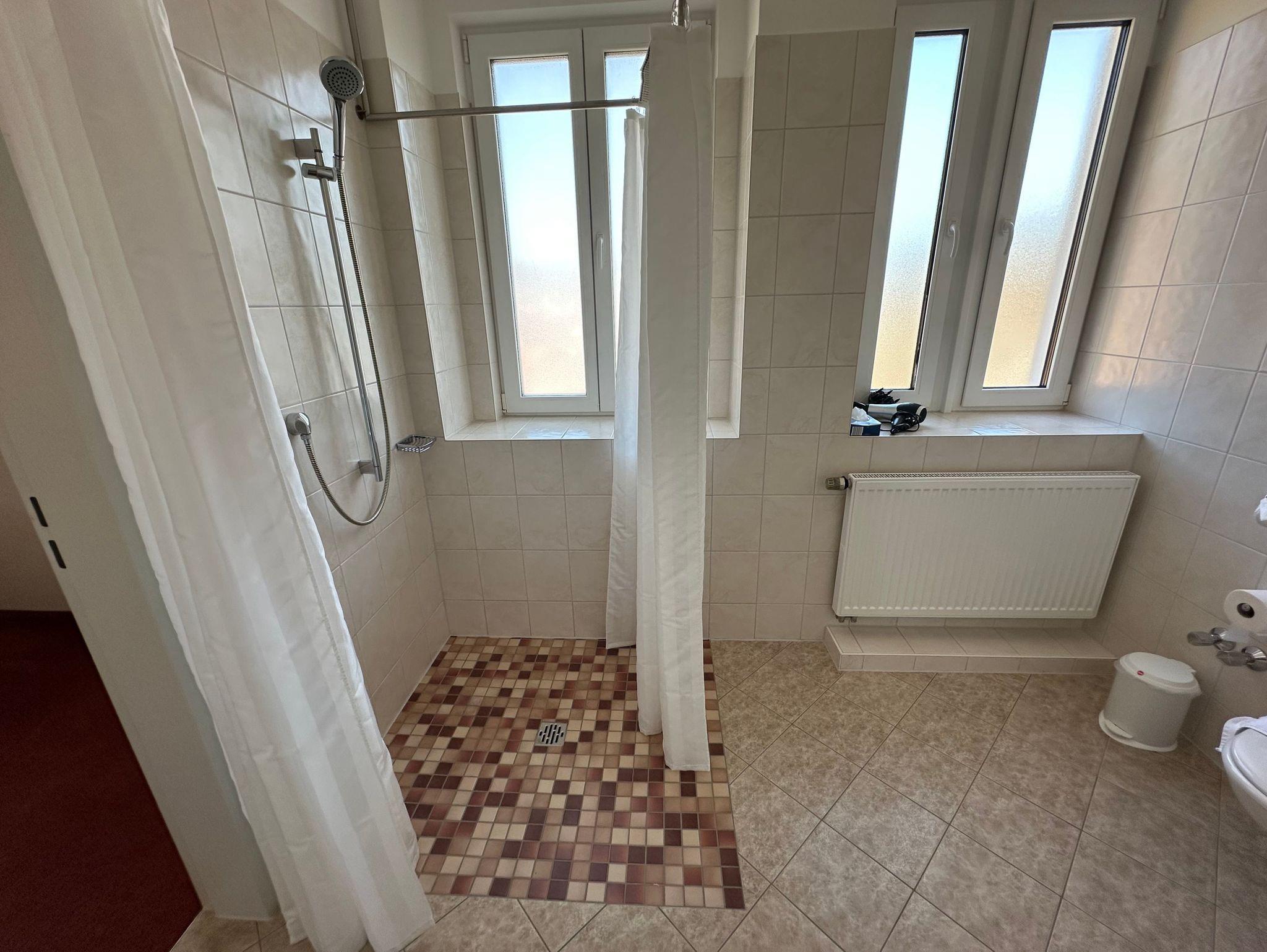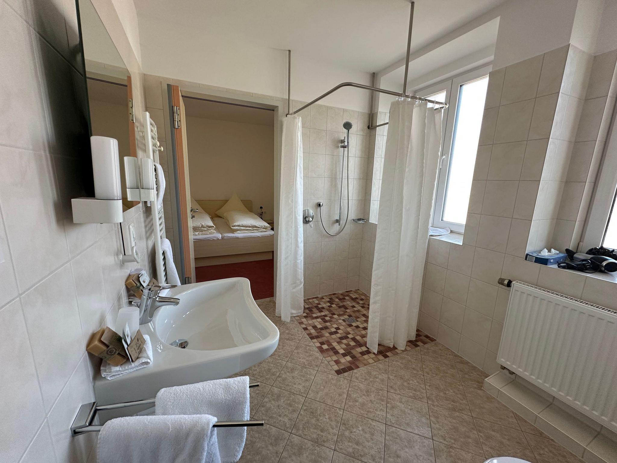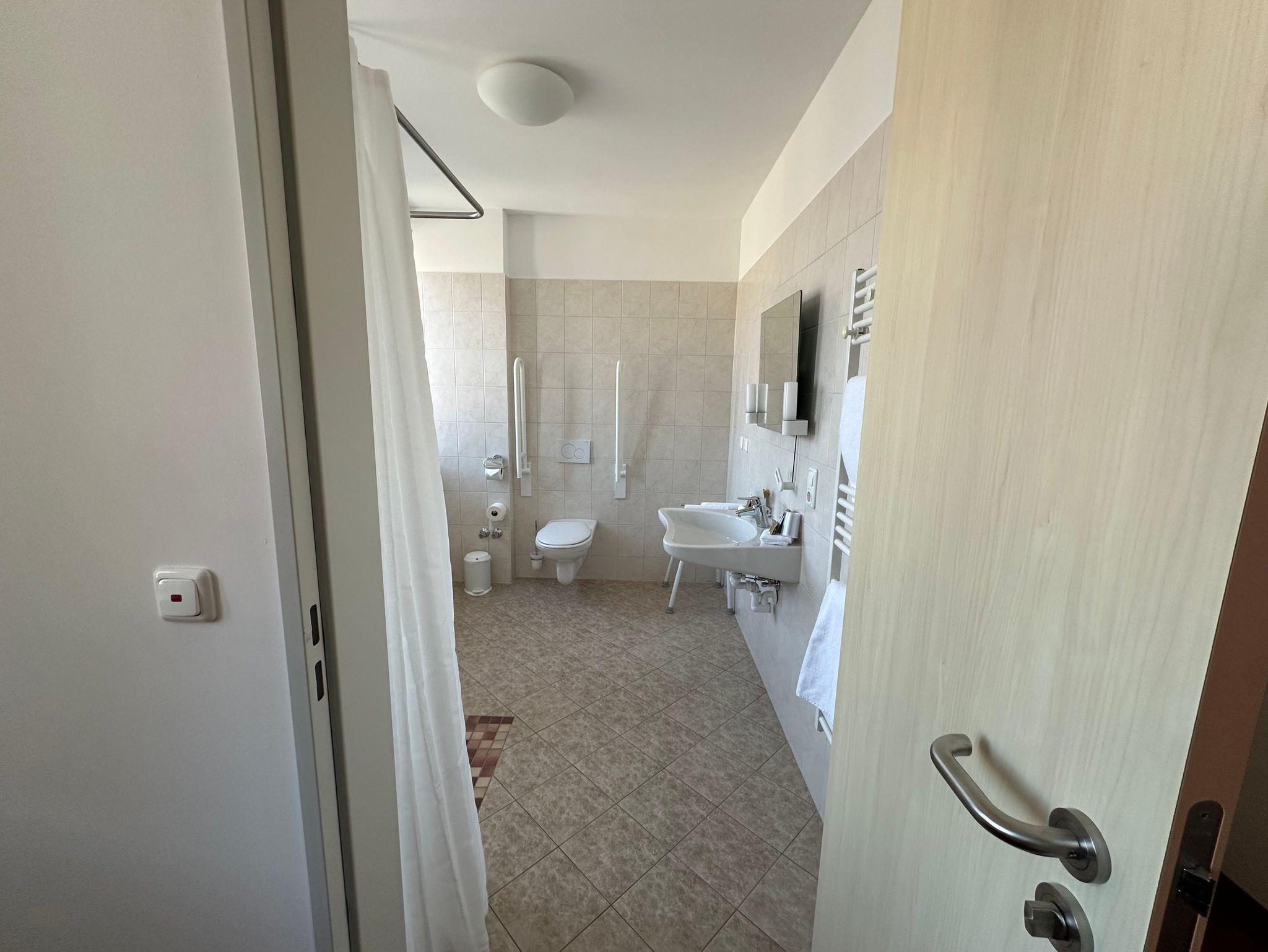 Das Zimmer ist speziell auf die Bedürfnisse mobilitätseingeschränkter Gäste ausgerichtet: Das Badezimmer verfügt über eine begehbare, schwellenlose Dusche, eine höhenangepasste Toilette mit Haltegriffen, einen unterfahrbaren Waschtisch mit neigbarem Spiegel sowie einen rutschfesten Boden. Ein Handtuchwärmer rundet den Komfort ab.