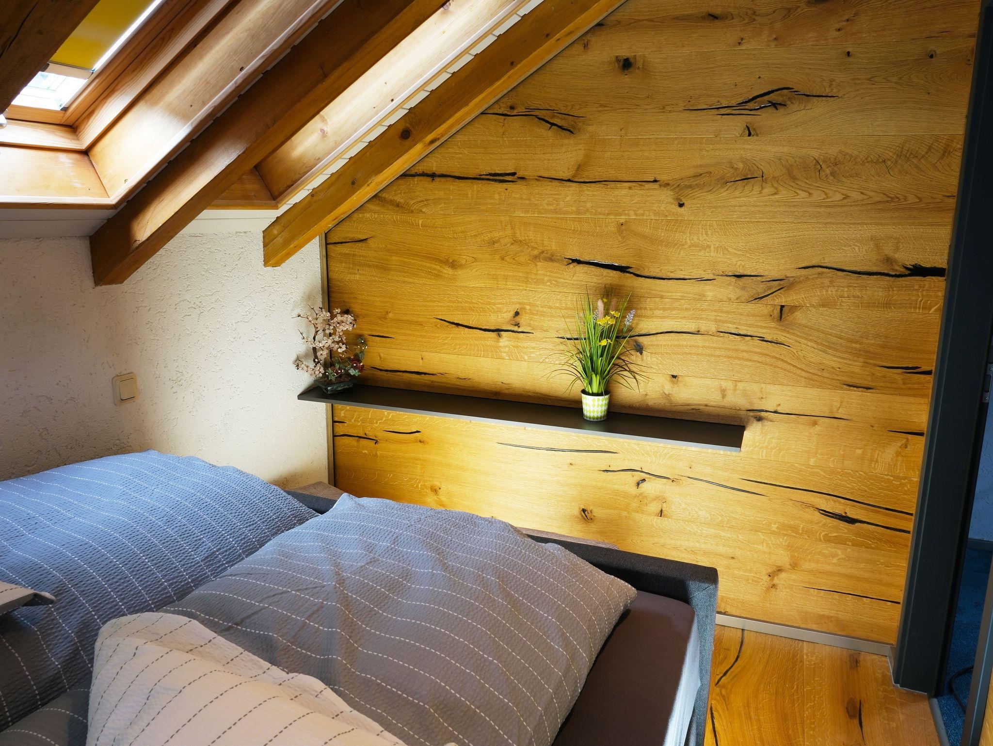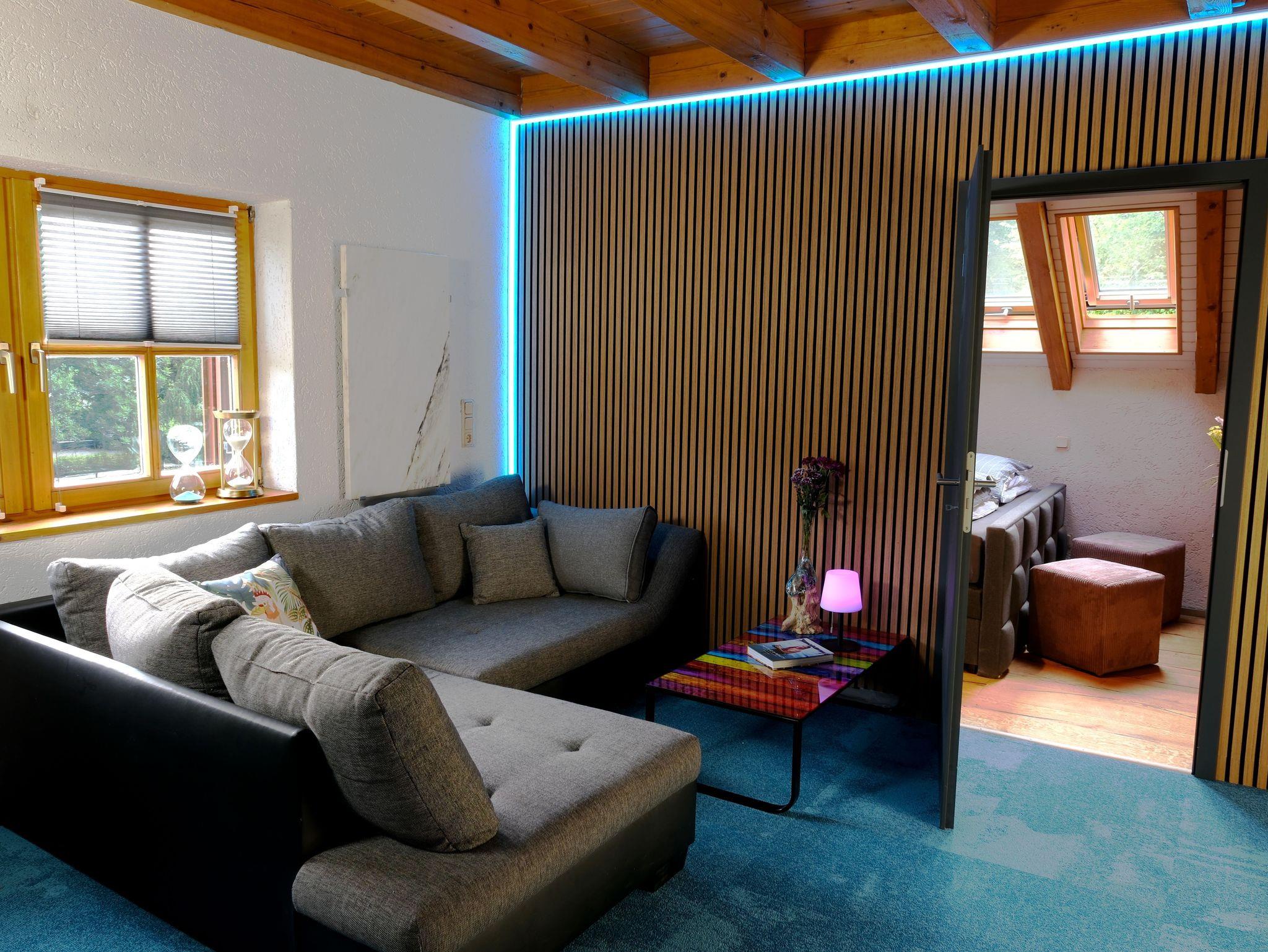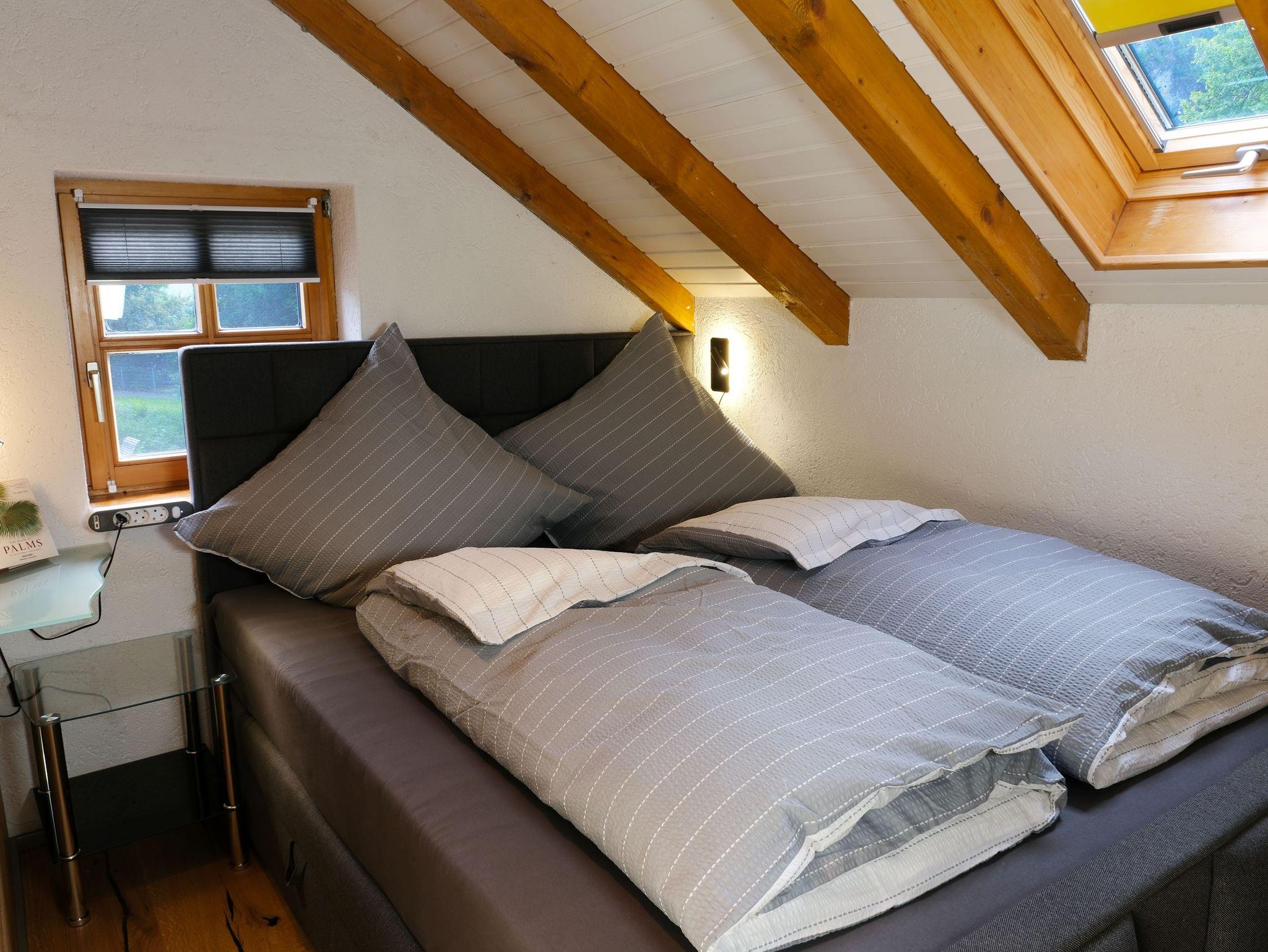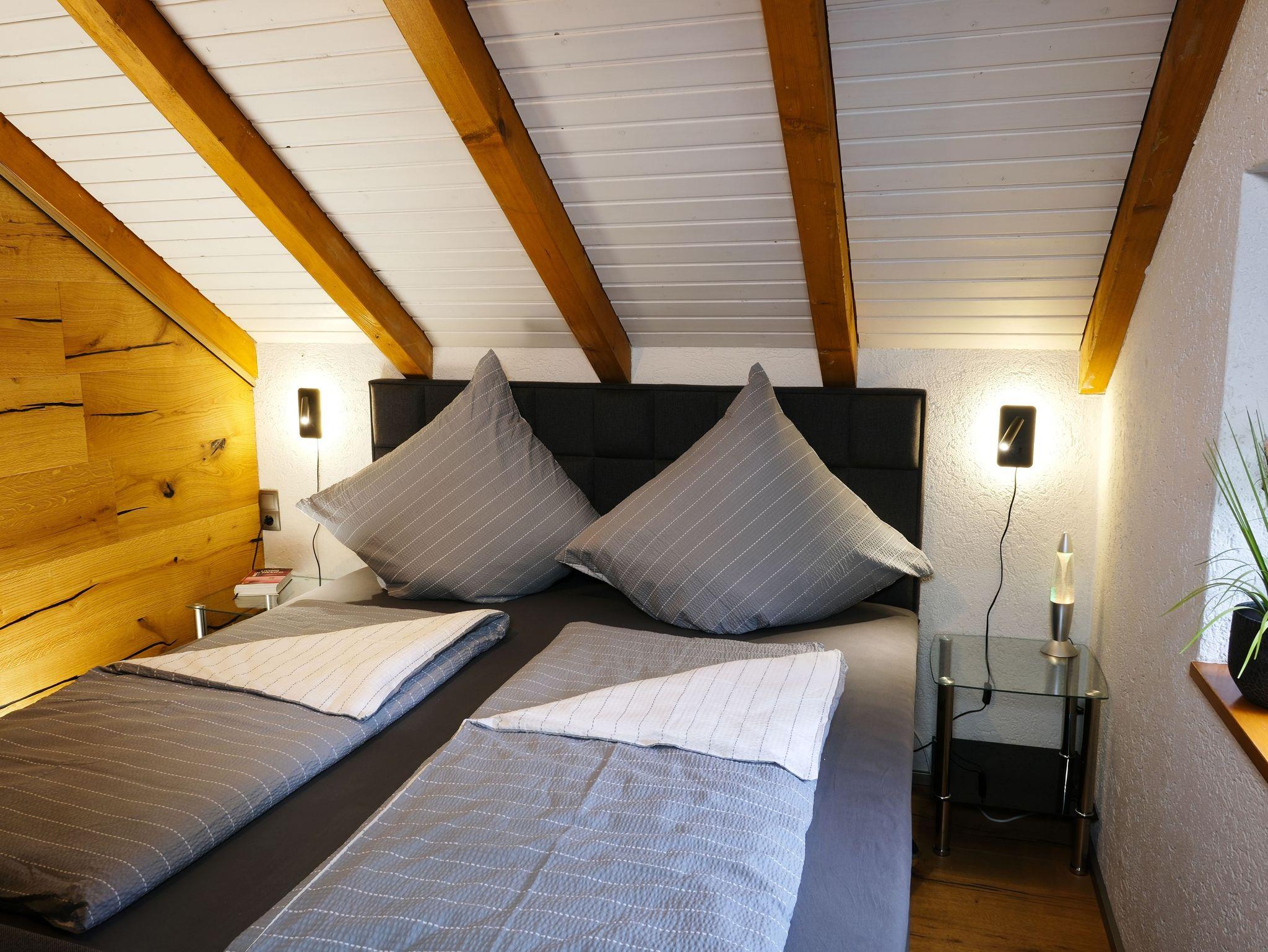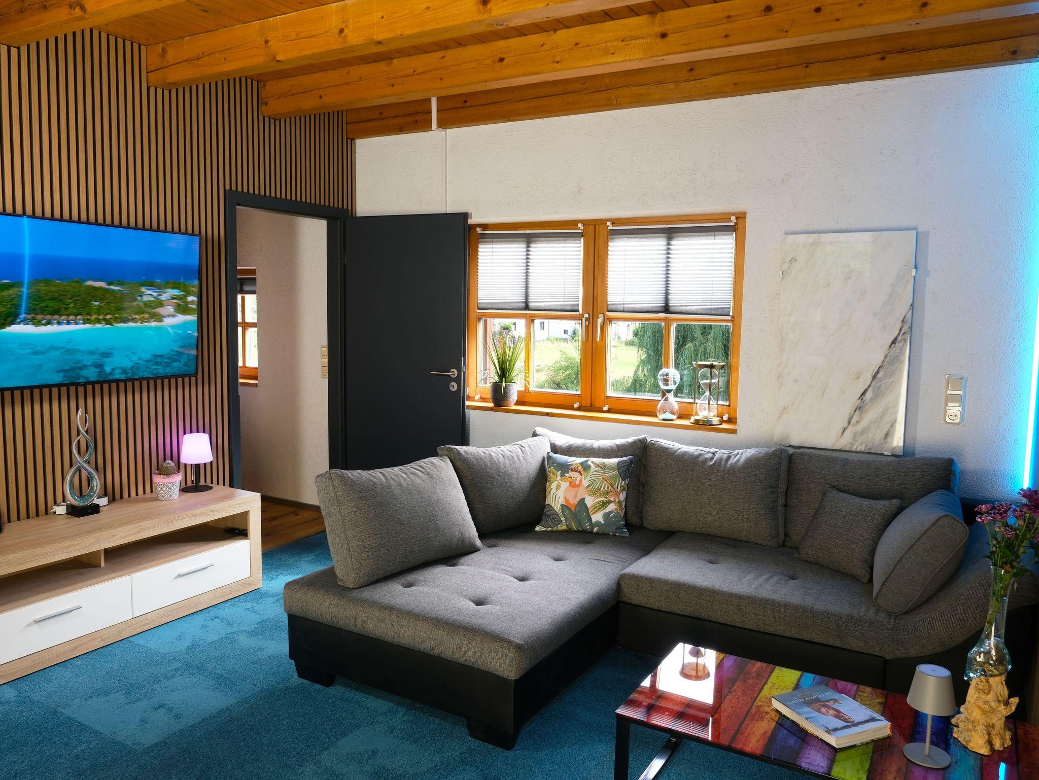 Über eine Holztreppe gelangt man ins 1. OG. Es erwartet Sie ein zentraler Wohn- und Aufenthaltsraum mit Sofa- und Sitzecke sowie einem großzügigen 55-Zoll Flatscreen-TV. Vom Wohnraum gelangt man in die beiden Schlafzimmer.