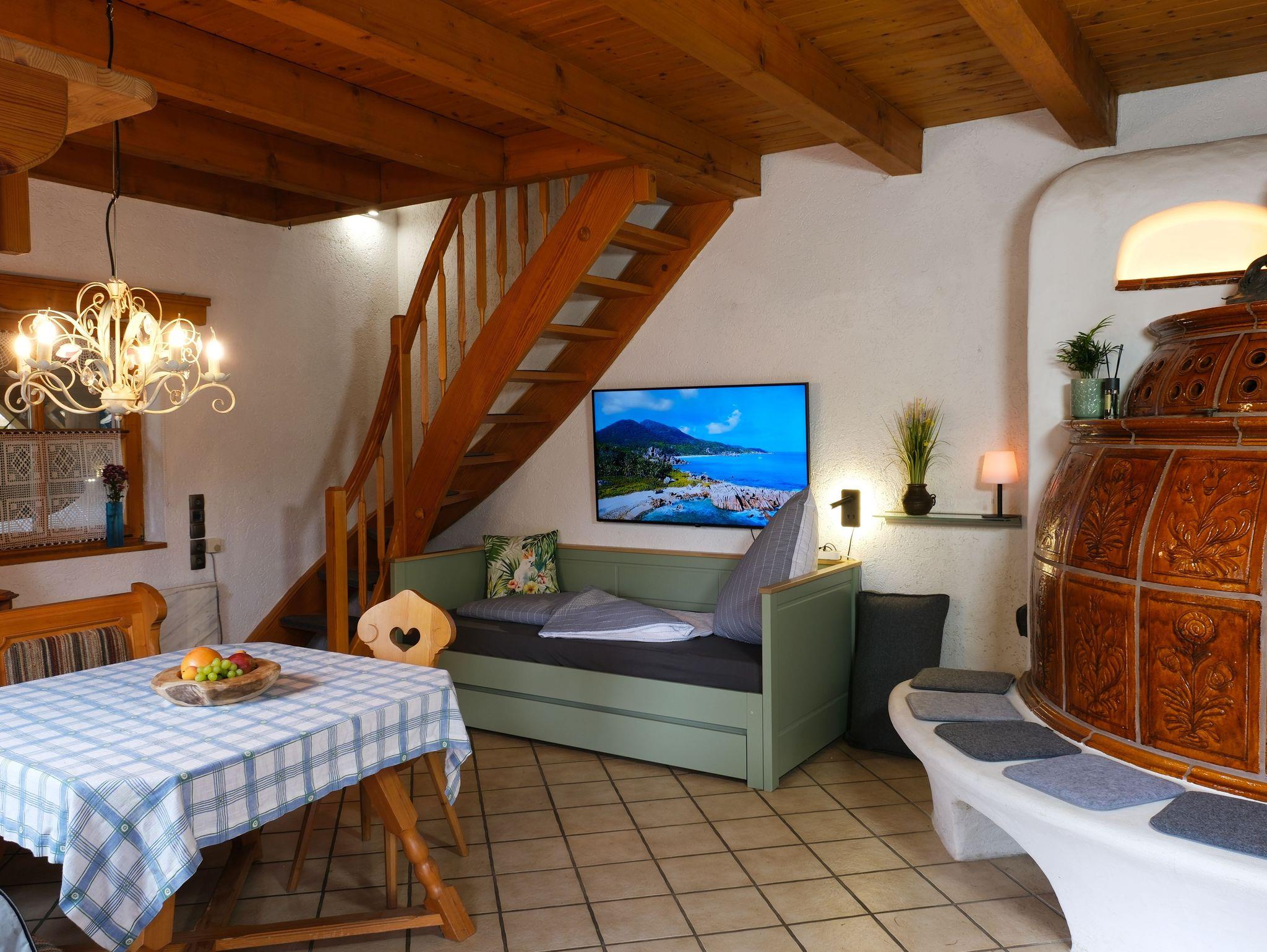 Ein sehr gemütlicher holzbeheizbarer Kachelofen sorgt bei kühleren Temperaturen für ein behagliches Raumklima.