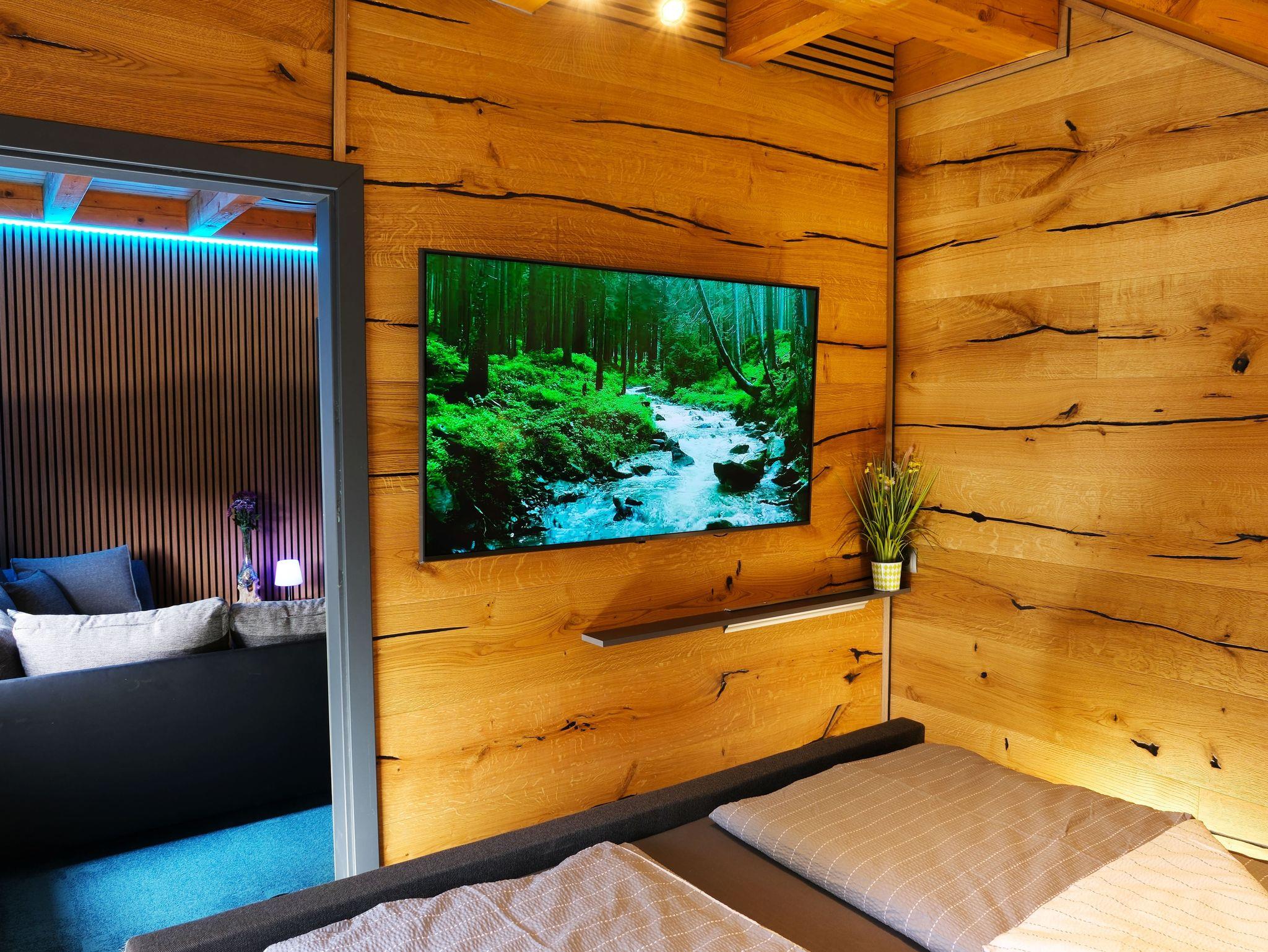 Neben dem Kachelofen befindet sich ein ausziehbares Einzelbett. Das Bett kann auch als Doppelbett genutzt werden. Darüber ist ein großer 55-Zoll Flatscreen-TV angebracht.