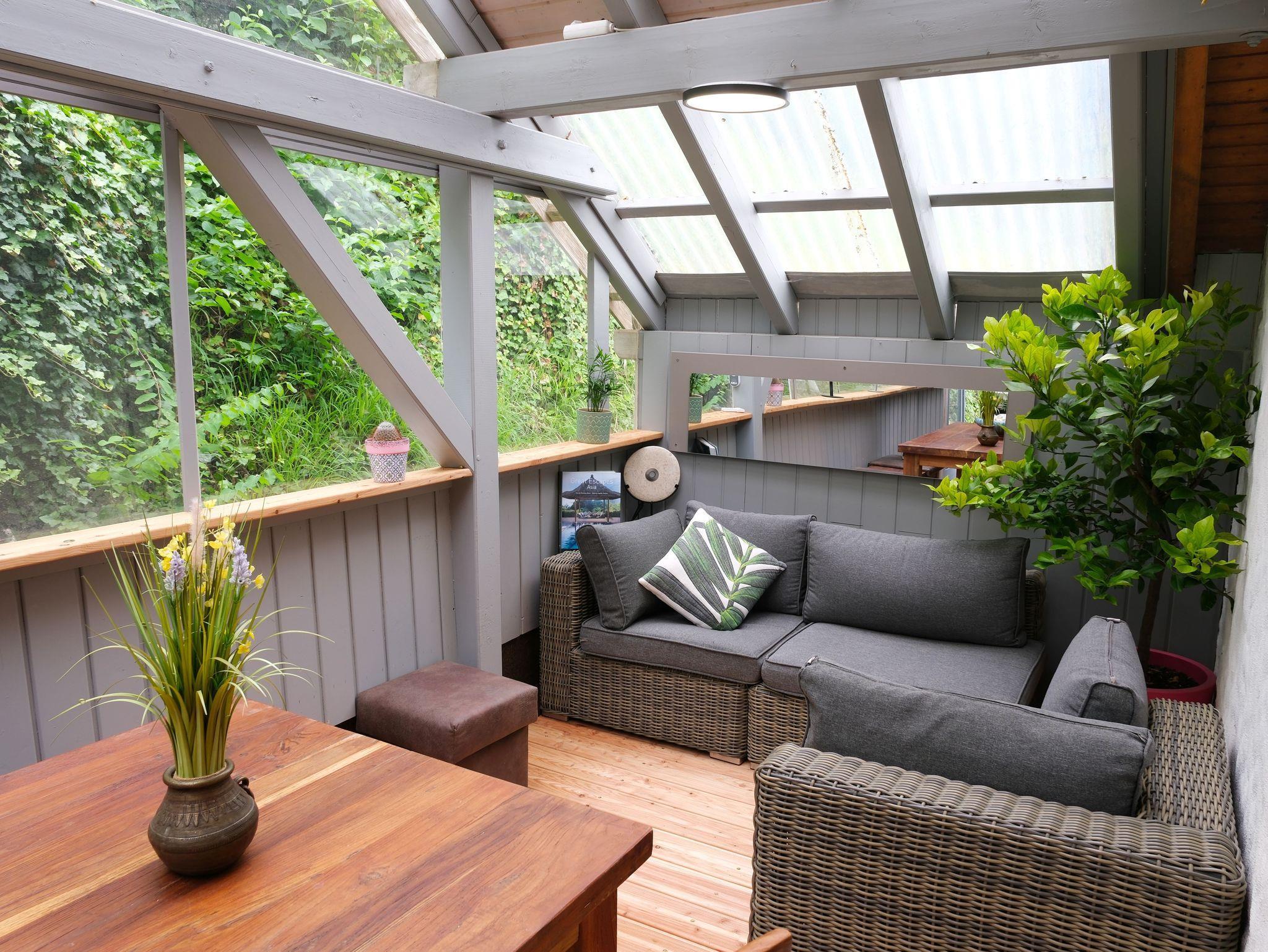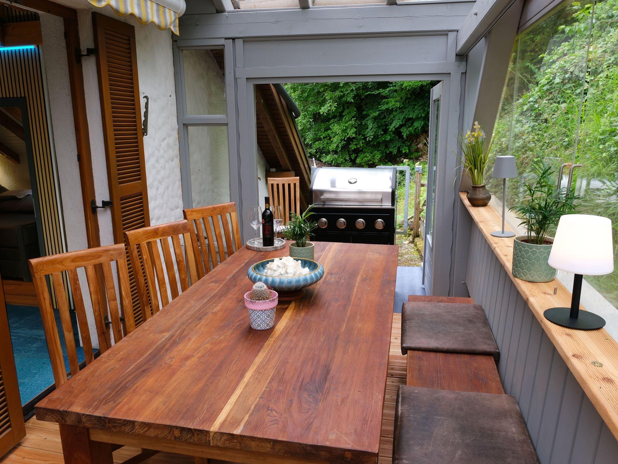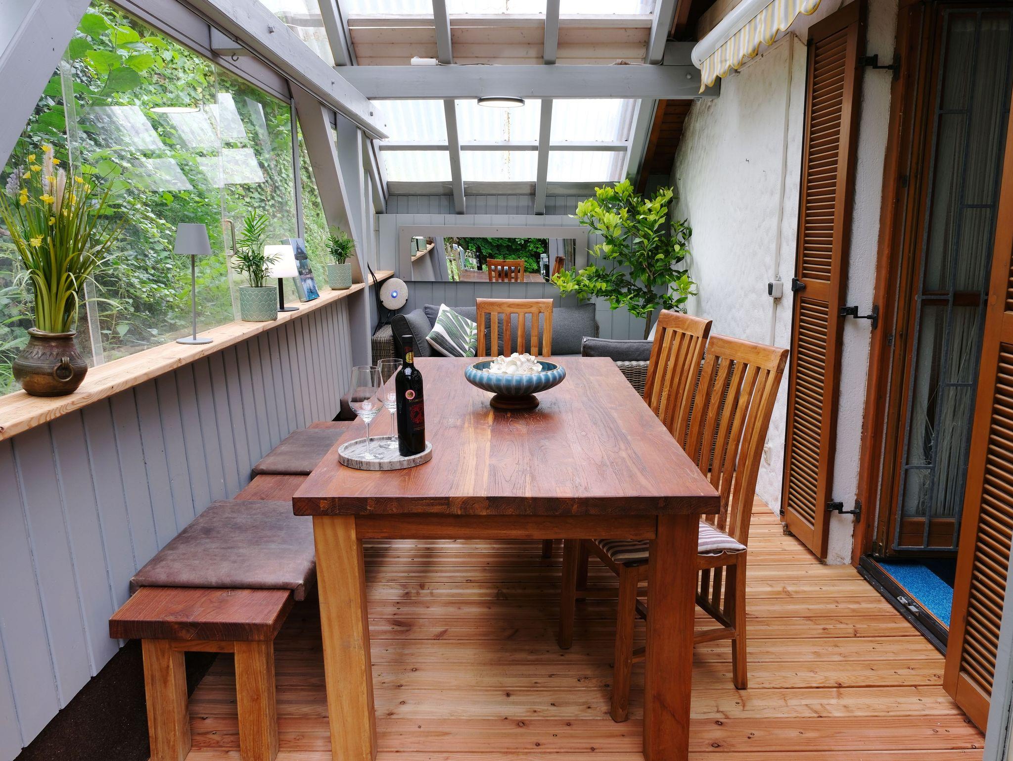 Zur Gebäuderückseite führt eine Türe in einen Wintergarten. Dieser bietet neben einem großen Teakholz Esstisch mit 4 Stühlen und einer Teakholzbank genügend Platz für Sie!