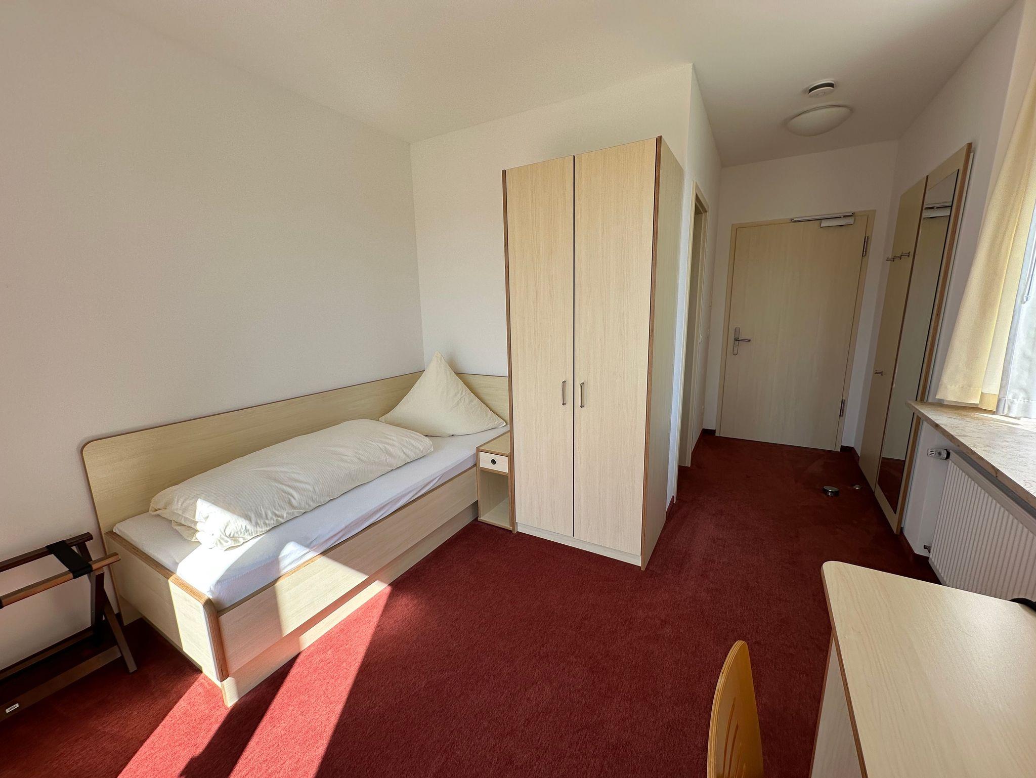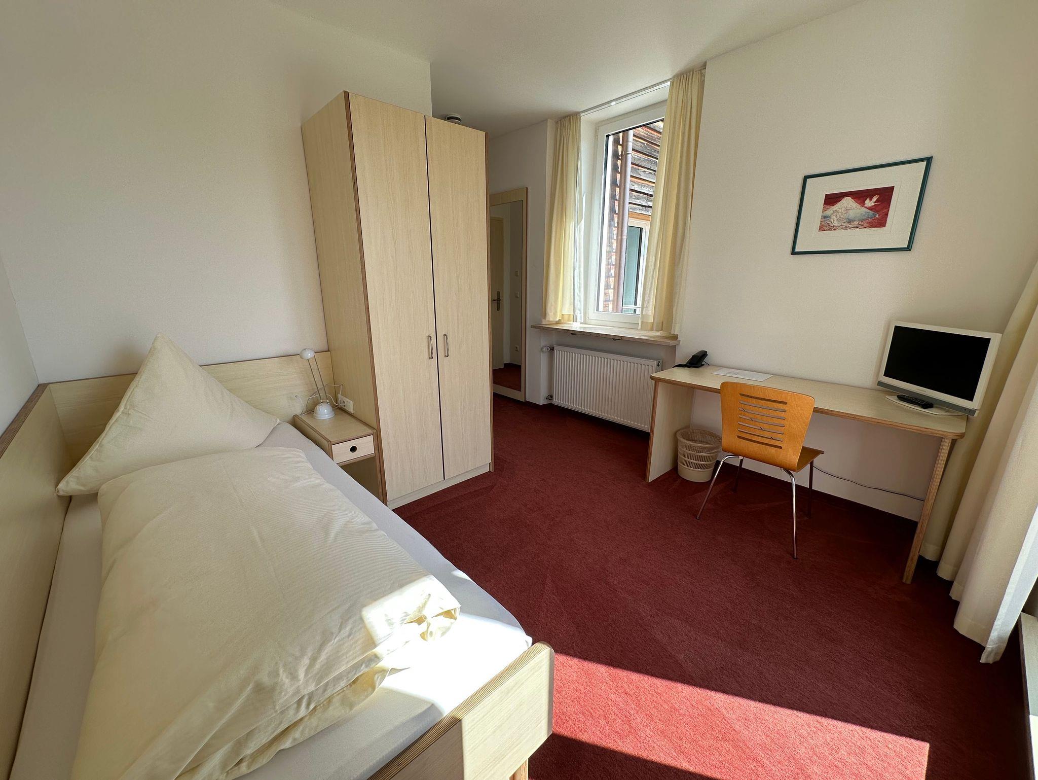 Unser gemütliches Einzelzimmer mit Balkon bietet den perfekten Rückzugsort für Erholungssuchende und Geschäftsreisende gleichermaßen. Ausgestattet mit einem komfortablen Einzelbett, einem Badezimmer mit Dusche und WC, sowie einem praktischen Schreibtisch, ist das Zimmer optimal für konzentriertes Arbeiten oder entspannte Tage geeignet.