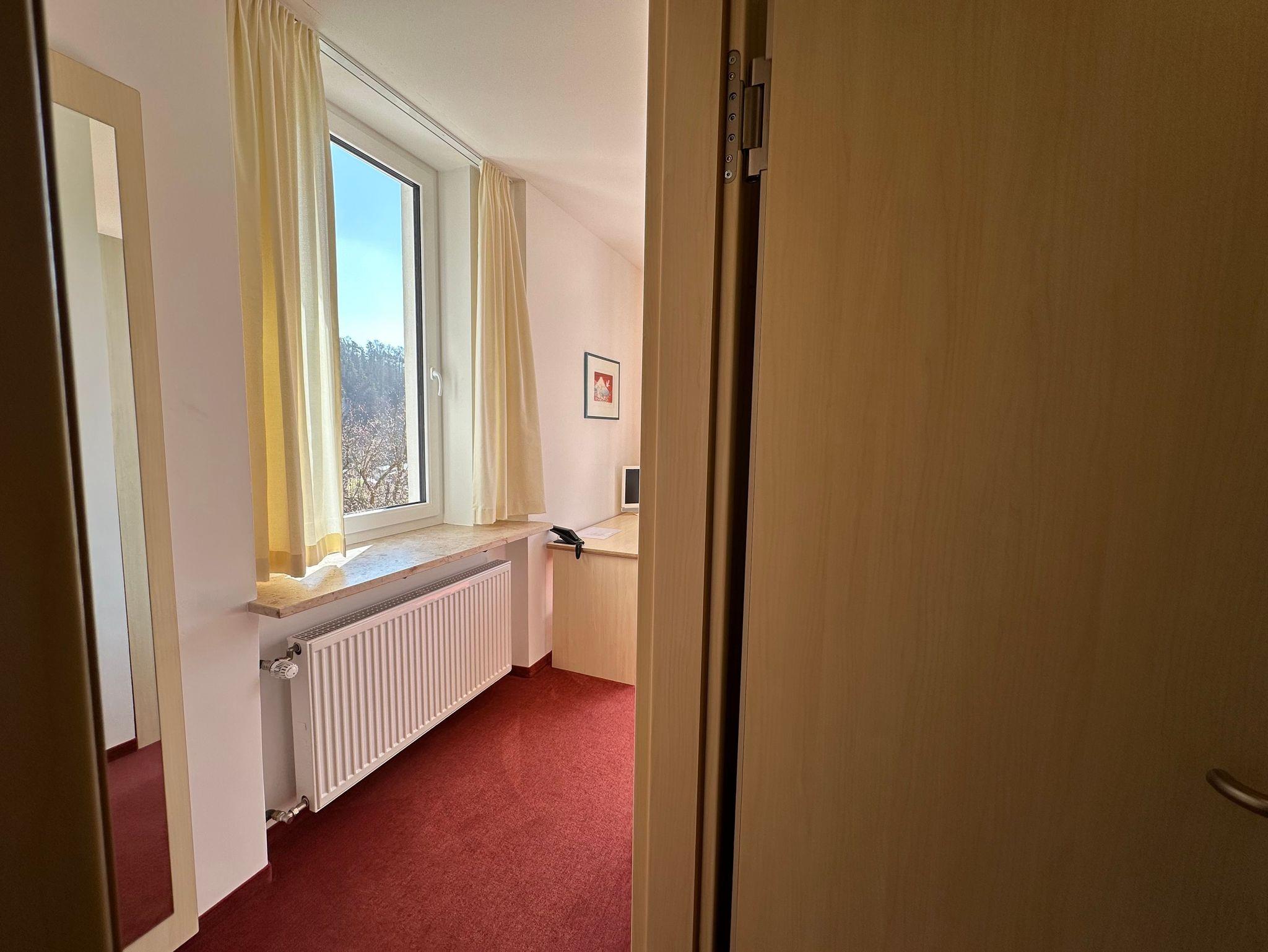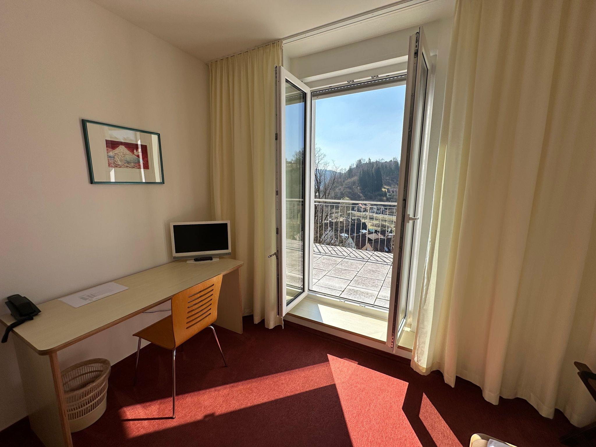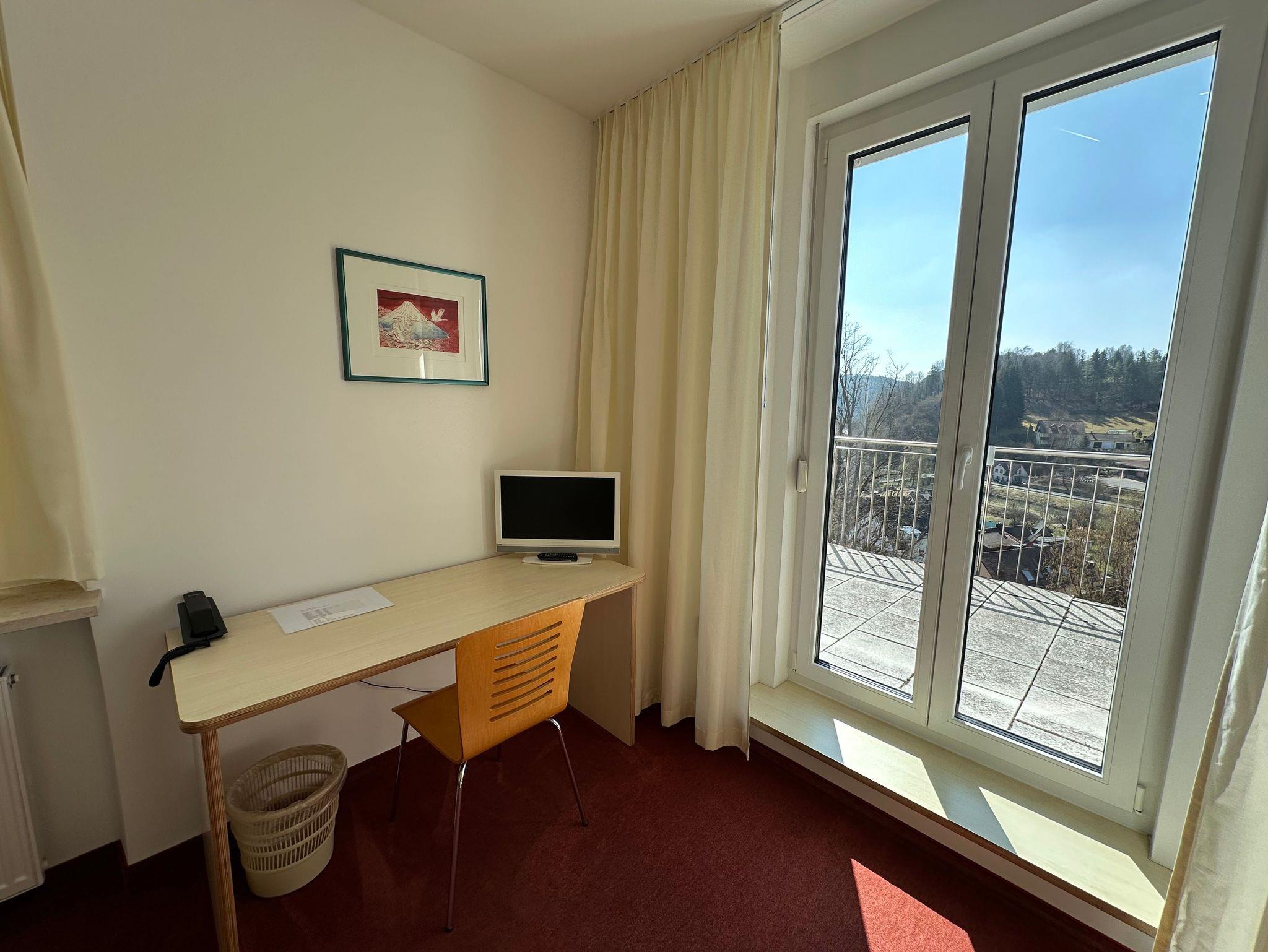 Einzelzimmer mit Balkon: ideal für Ihre Auszeit in der Natur, für Tagungen & Seminare oder für ein temporäres Büro, verbunden mit Urlaub in herrlicher Umgebung (Workation: Verschmelzung von Work und Vacation)