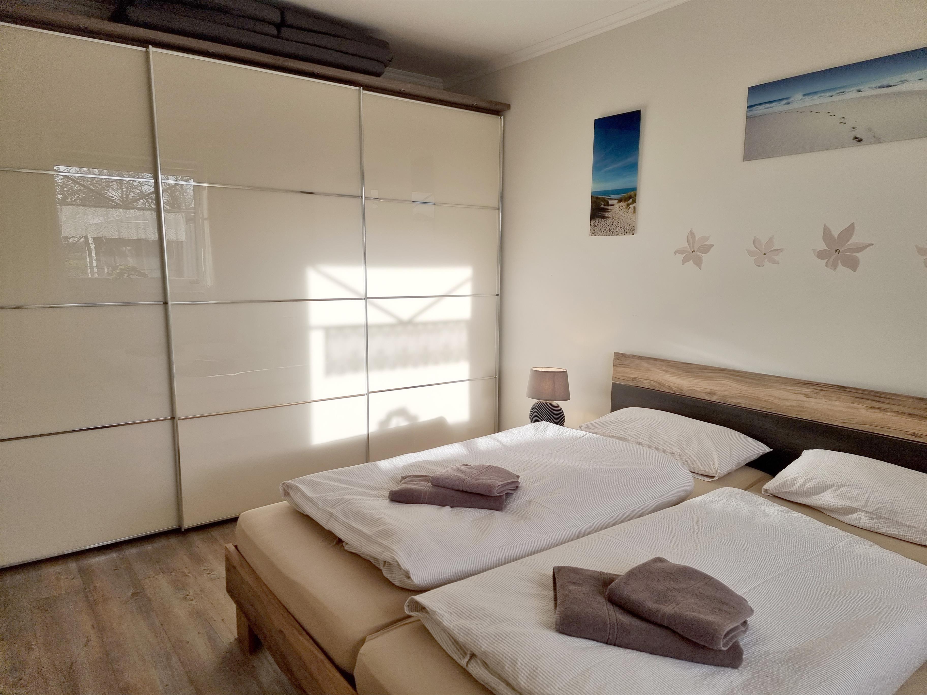 Das Schlafzimmer bietet ein großes Doppelbett/Boxspringbett und einen sehr geräumigen Kleiderschrank.