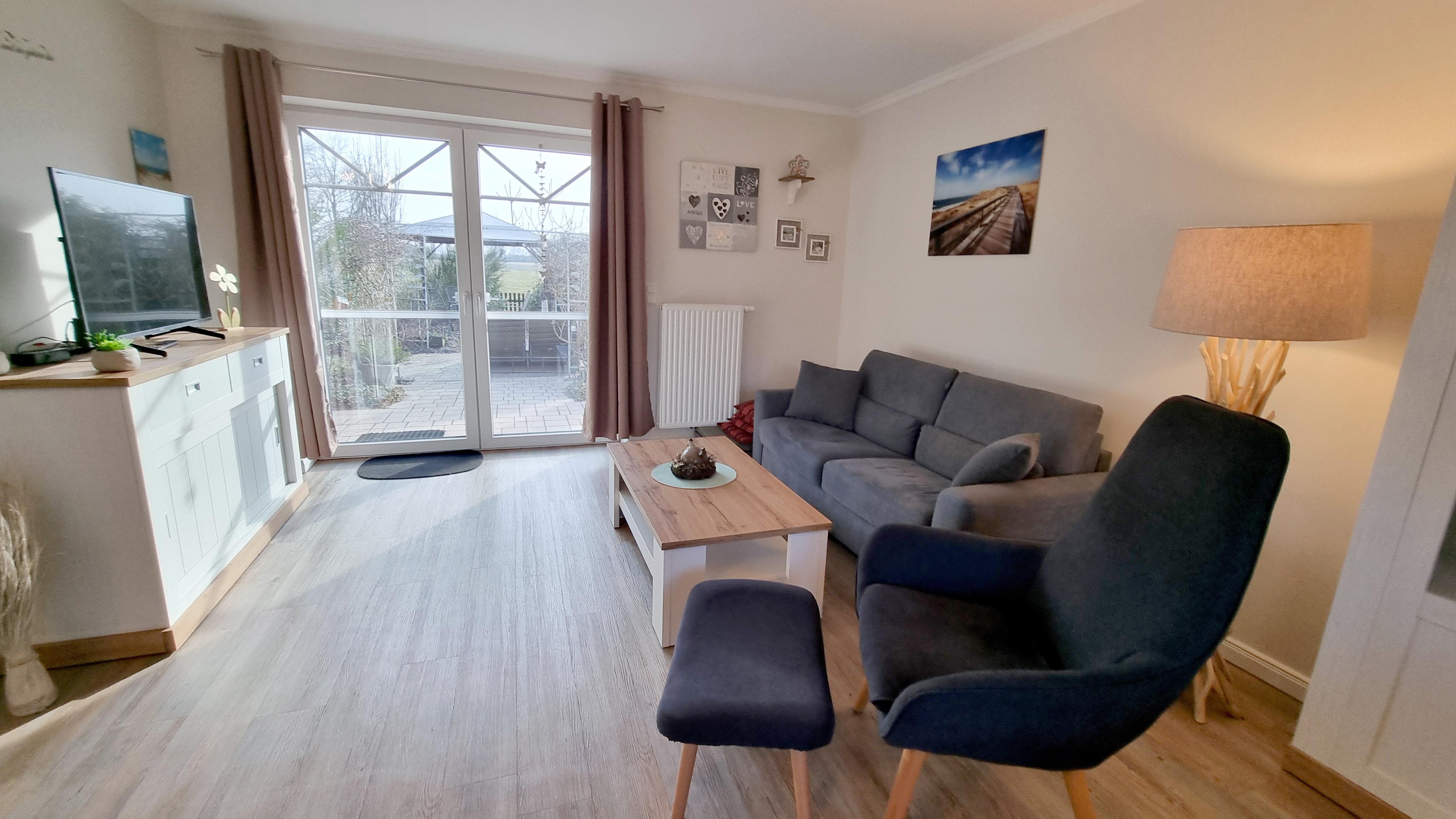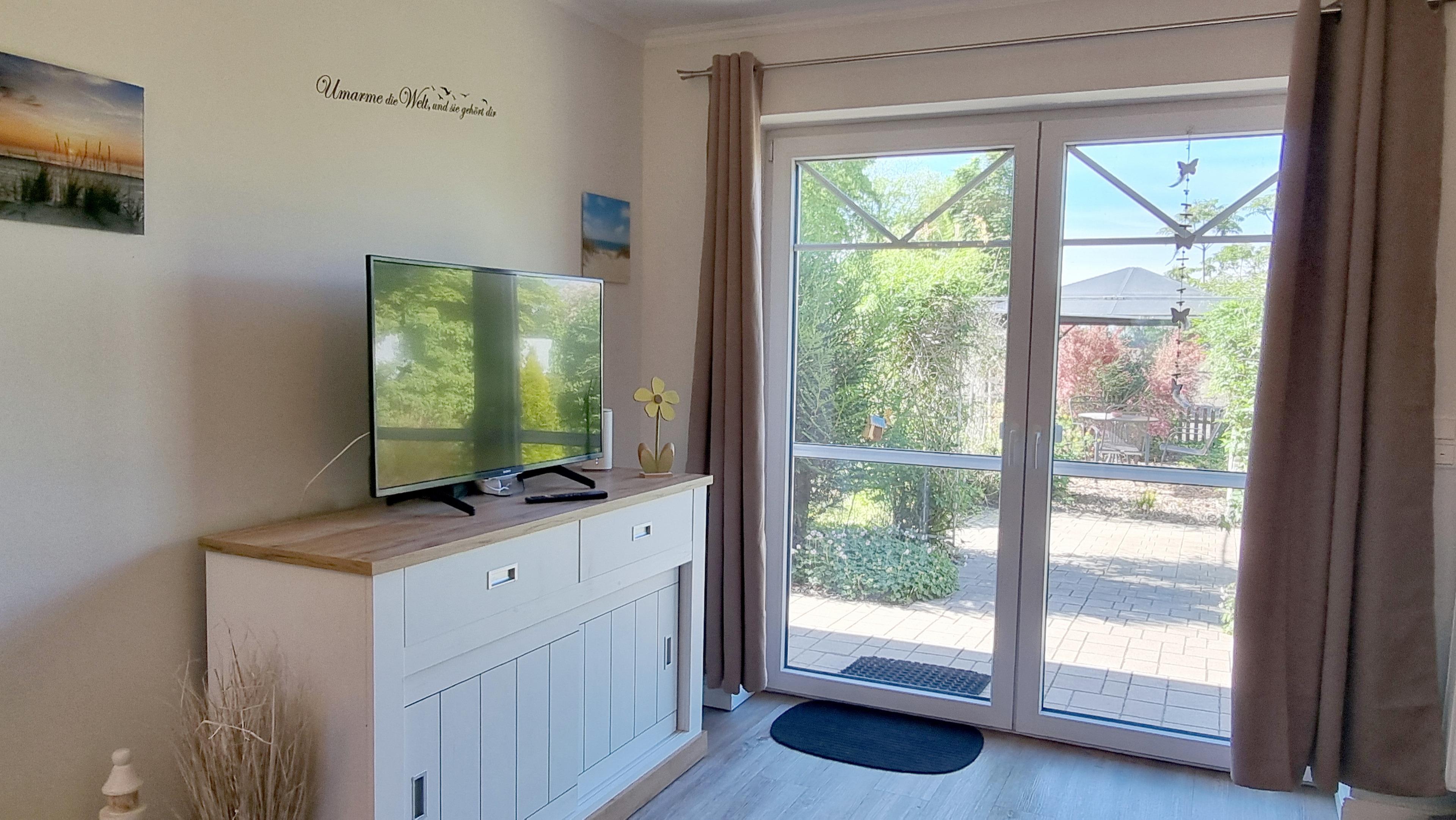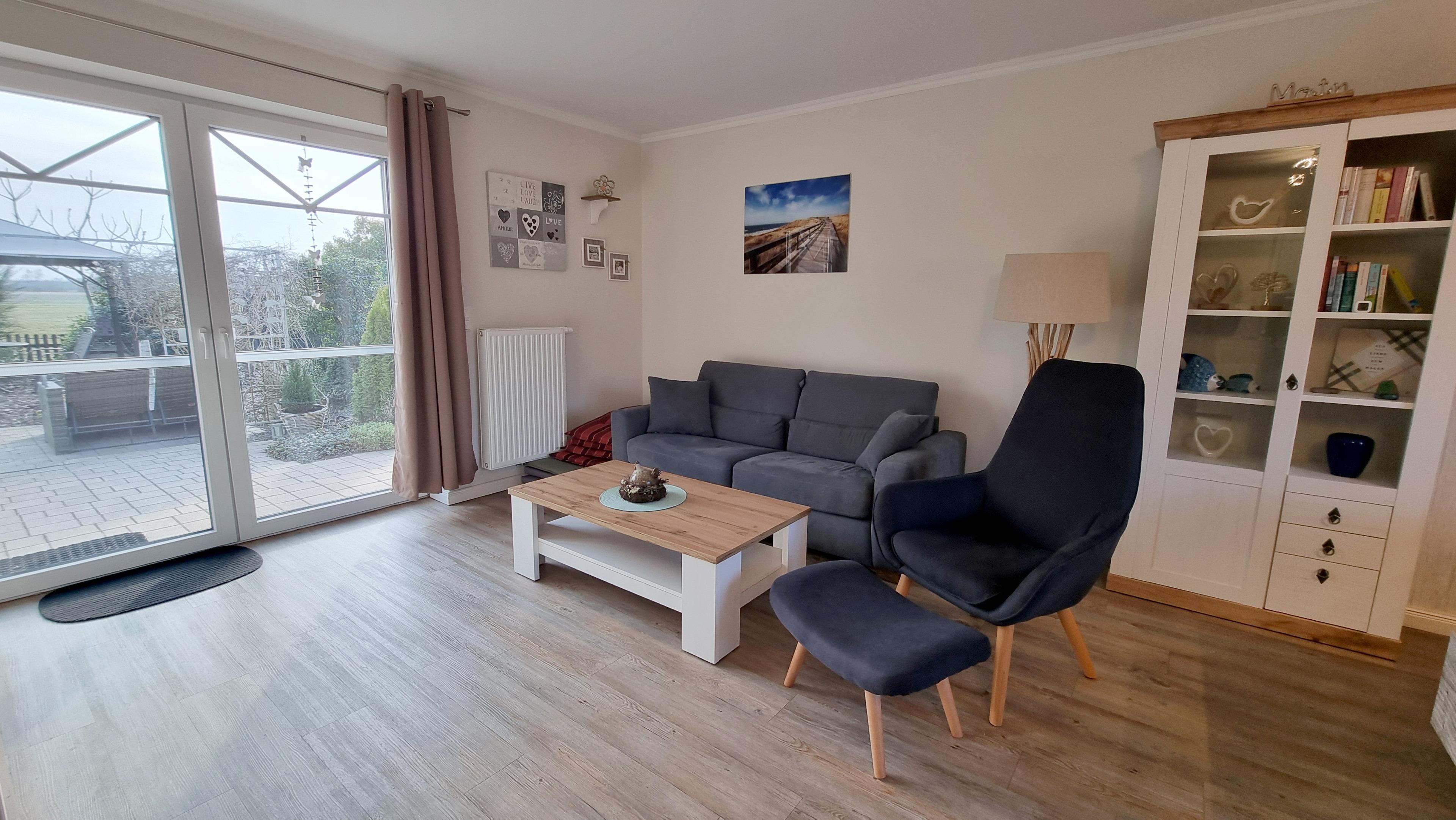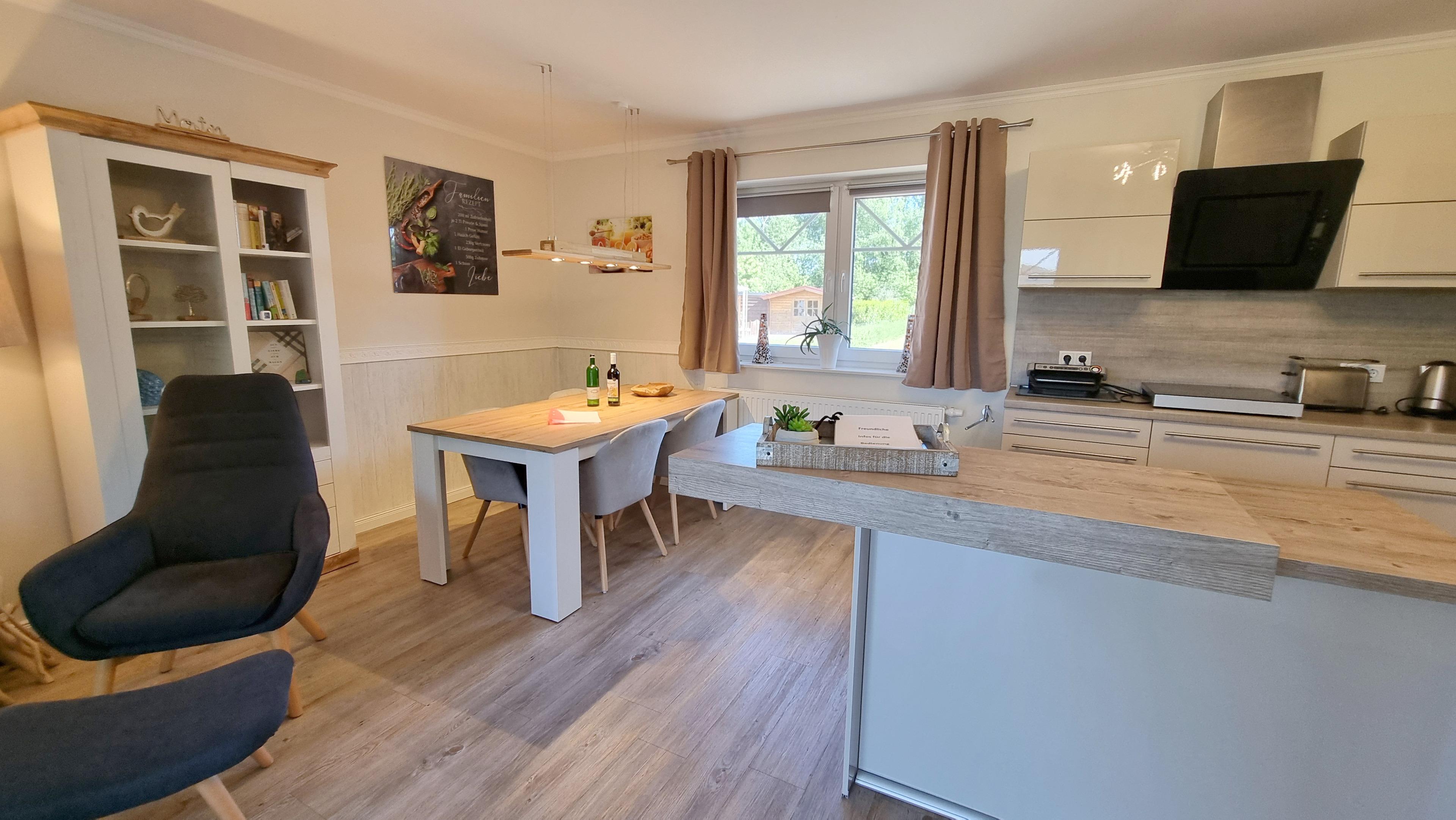 Das ebenerdige Ferienhaus verfügt über ein großes Wohnzimmer mit Essbereich und offener Küche. Vom Wohnzimmer aus schauen Sie in den Staudengarten mit Pavillon.