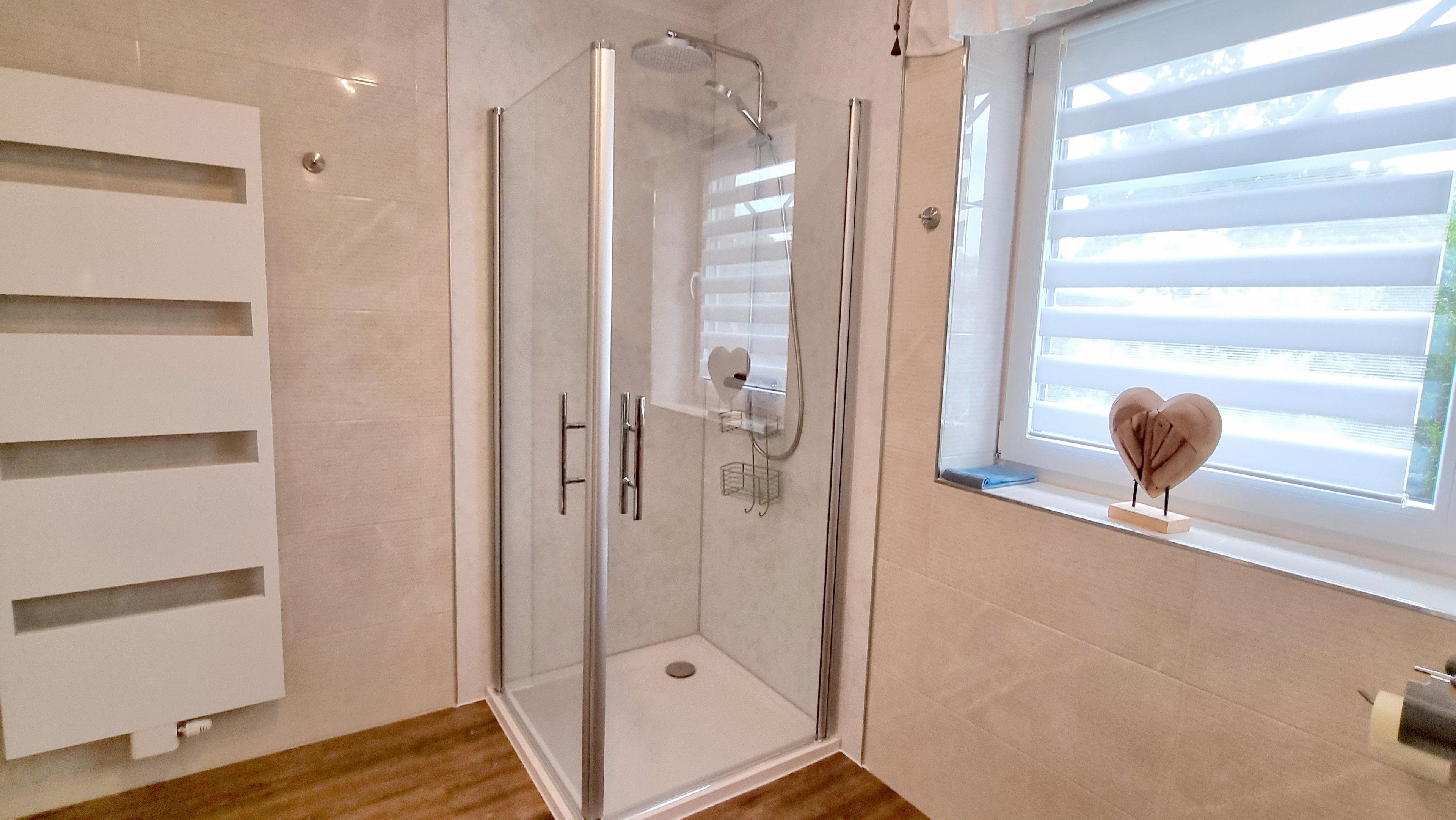 Das mediterrane Bad verfügt über eine Dusche mit weit öffnenden Glastüren. Am Boden befindet sich nur eine kleine Schwelle.