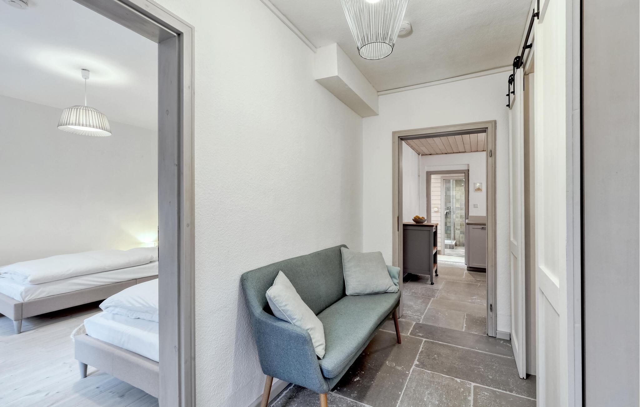 Tag en velfortjent pause og rejs som par eller med den lille familie til udkanten af Glücksburg, hvor I finder denne charmerende lejlighed i skønne, rolige omgivelser. Boligen er nydeligt indrettet med lyse træpaneler, gode møbler og et veludstyret køkken, hvor I kan tilberede jeres livretter efter en aktiv feriedag. Senere kan I rykke over i sofaen eller lænestolen med snacks og hver jeres bog, mens I lægger planer for de kommende dage.