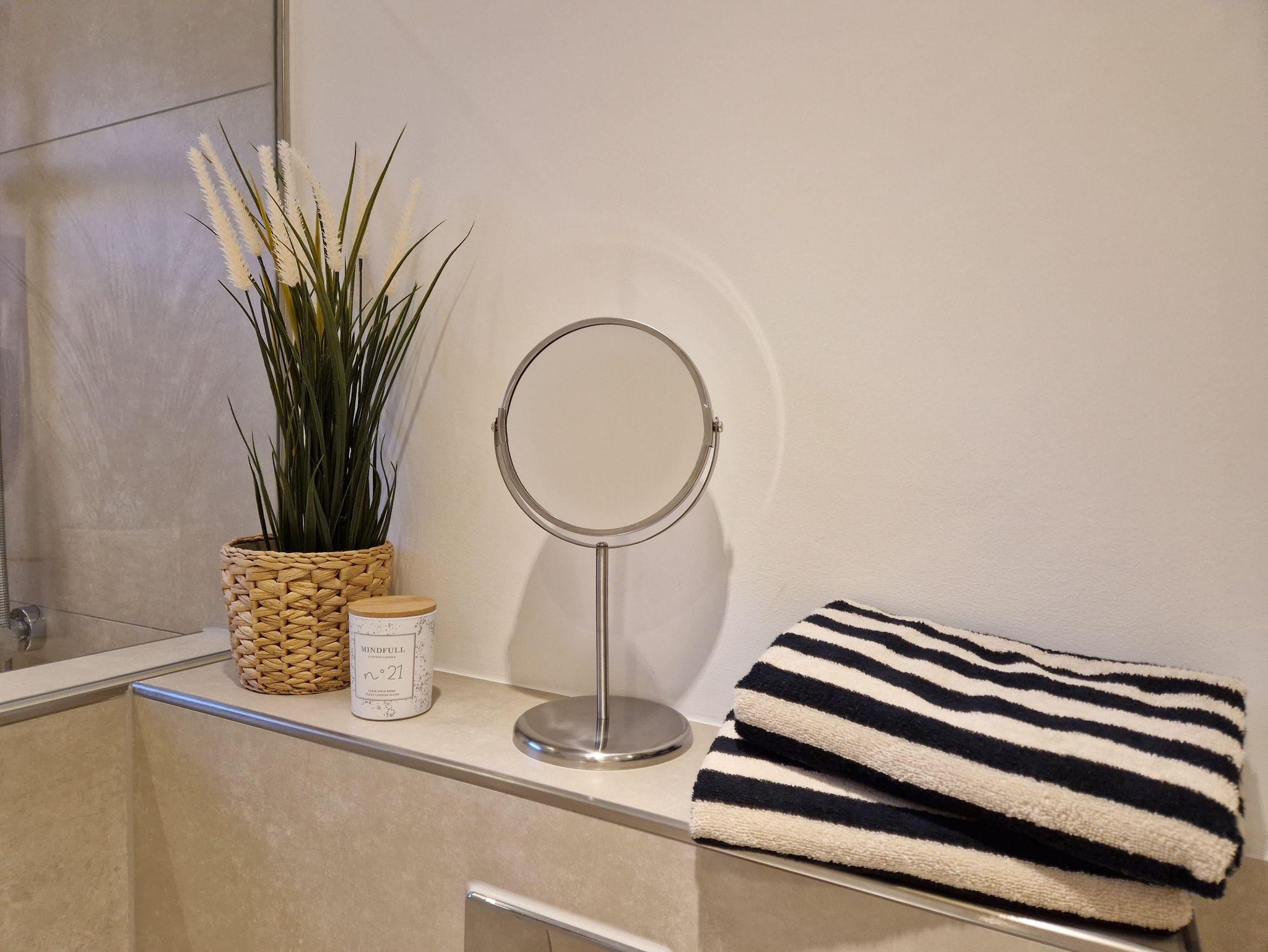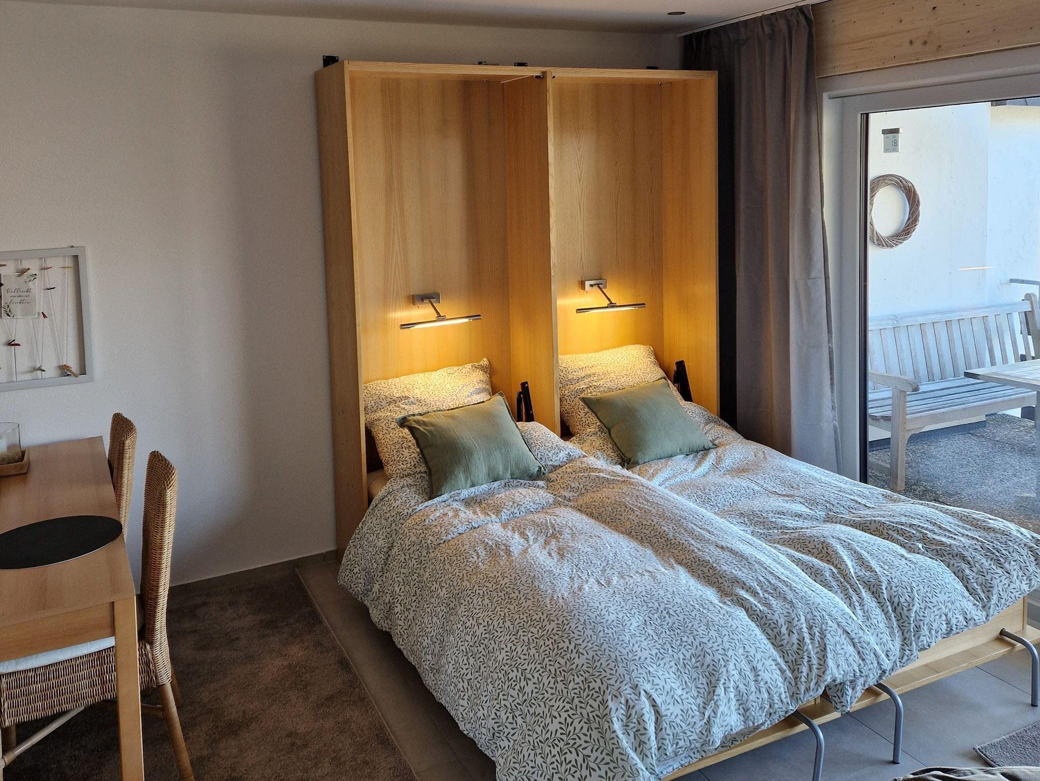 Das moderne Badezimmer mit Fenster bietet eine bodengleiche Rain-Shower-Dusche, Waschtisch und Spiegelschrank mit viel Stauraum. Das separate Schlafzimmer hat ein Doppelbett (180x200 cm), im Wohnzimmer gibt es ein Schrankbett mit zwei Einzelbetten.