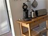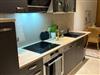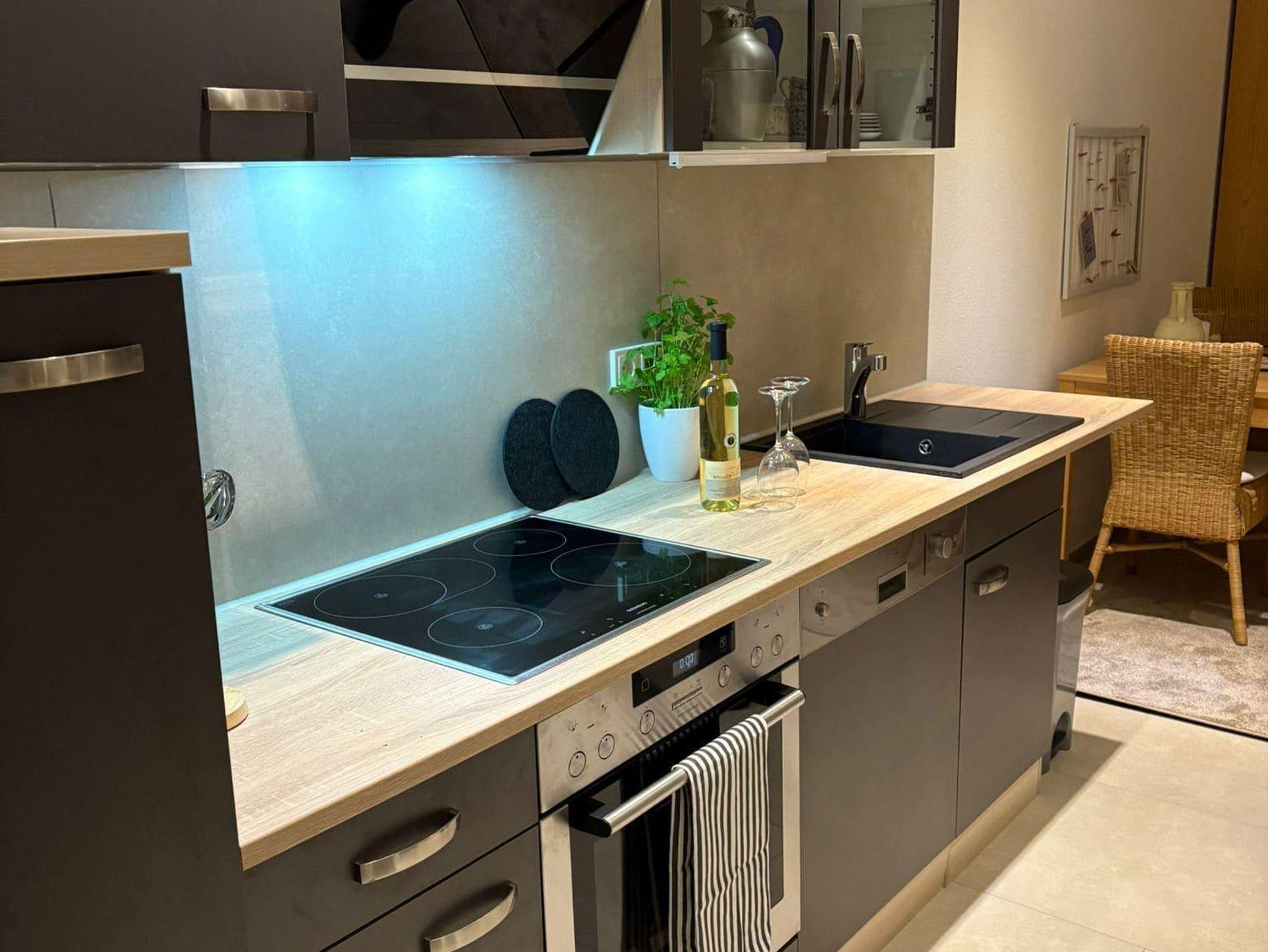 Die voll ausgestattete Küche verfügt über Induktionsfeld, Backofen, Spülmaschine, Senseo-Kaffeemaschine, Toaster, Wasserkocher, Mikrowelle, großen Kühl- und Tiefkühlschrank sowie eine Heißluftfritteuse. Gewürze, Essig, Öl, Tee und Kaffee stehen bereit.