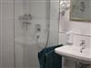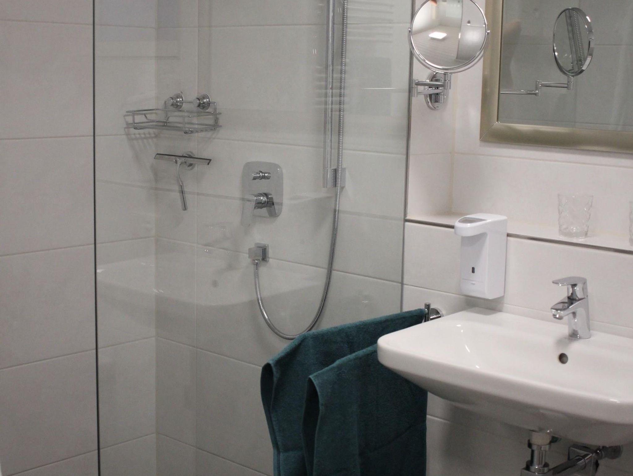 Das großzügige Bad bietet einen Waschplatz mit ebenerdiger Dusche.