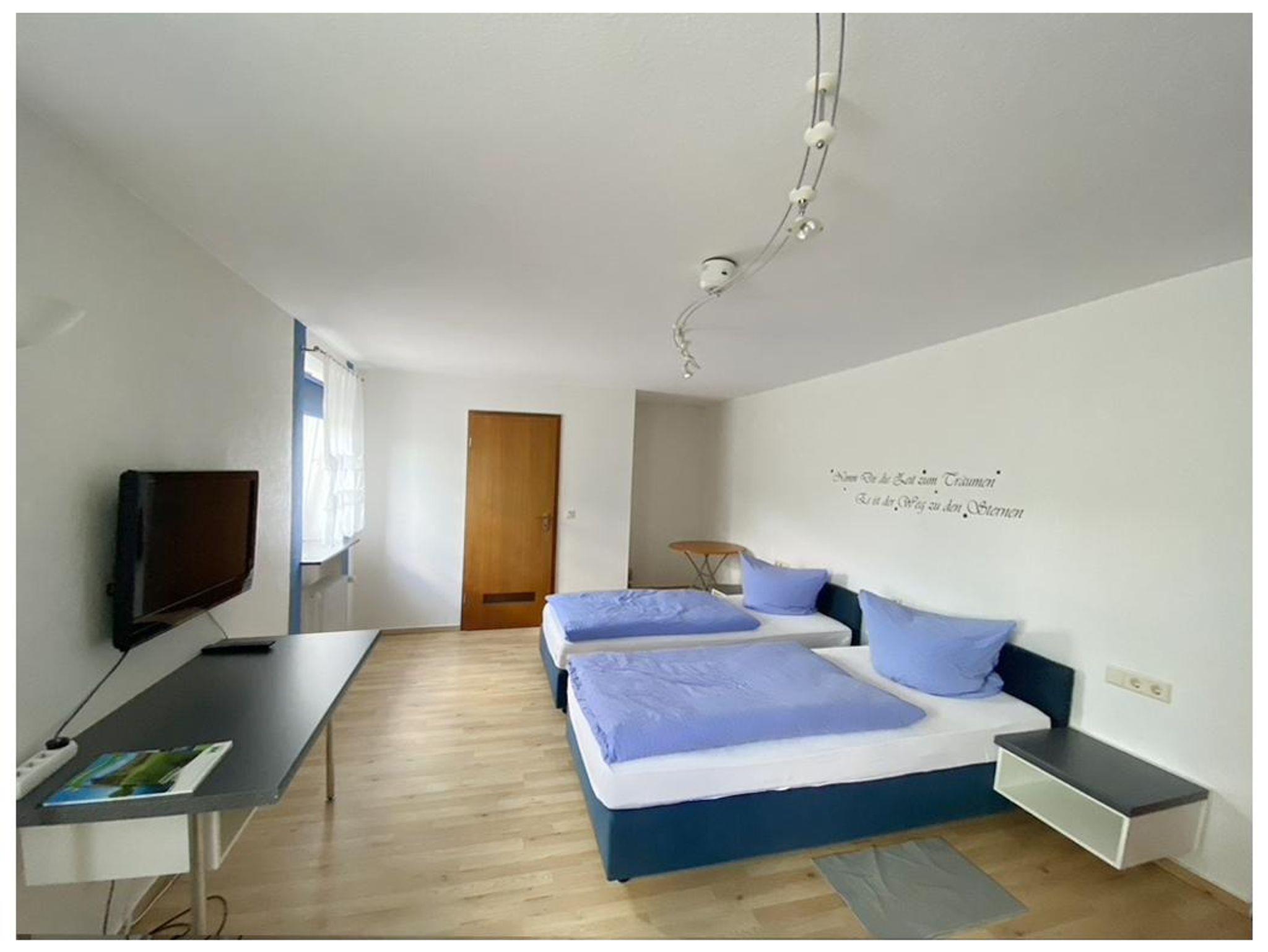 Modern eingerichtete Zimmer mit Dusche und WC, Sat-TV und WLAN. Das Bett ist 2,00 m breit. Mit einer zusätzlichen Matratze kann es auch als Drei-Bett-Zimmer genutzt werden. Eine Sitzecke mit Tischen und Stühlen ist ebenfalls vorhanden. Zimmer Nr. 2 verfügt über 2 separate Dusche/WC.