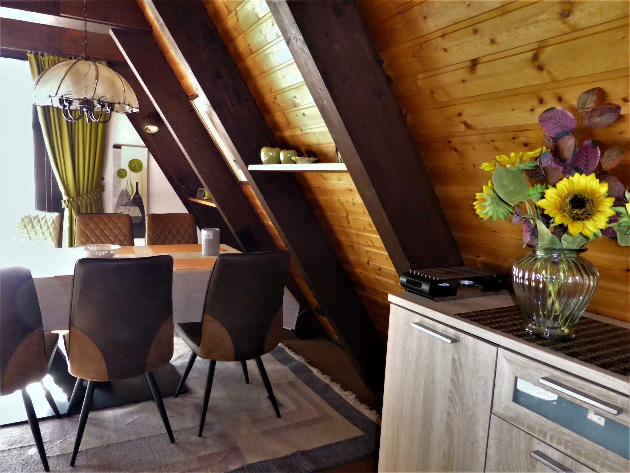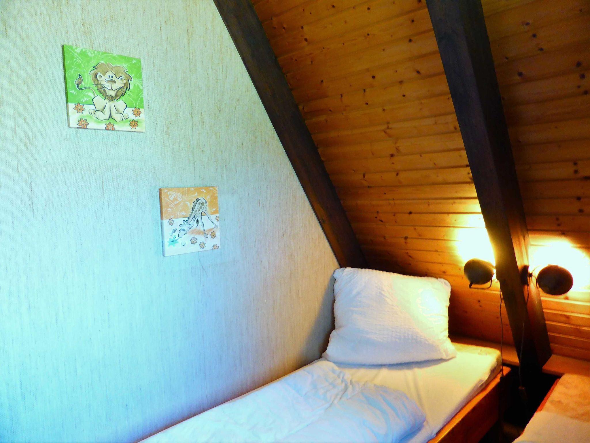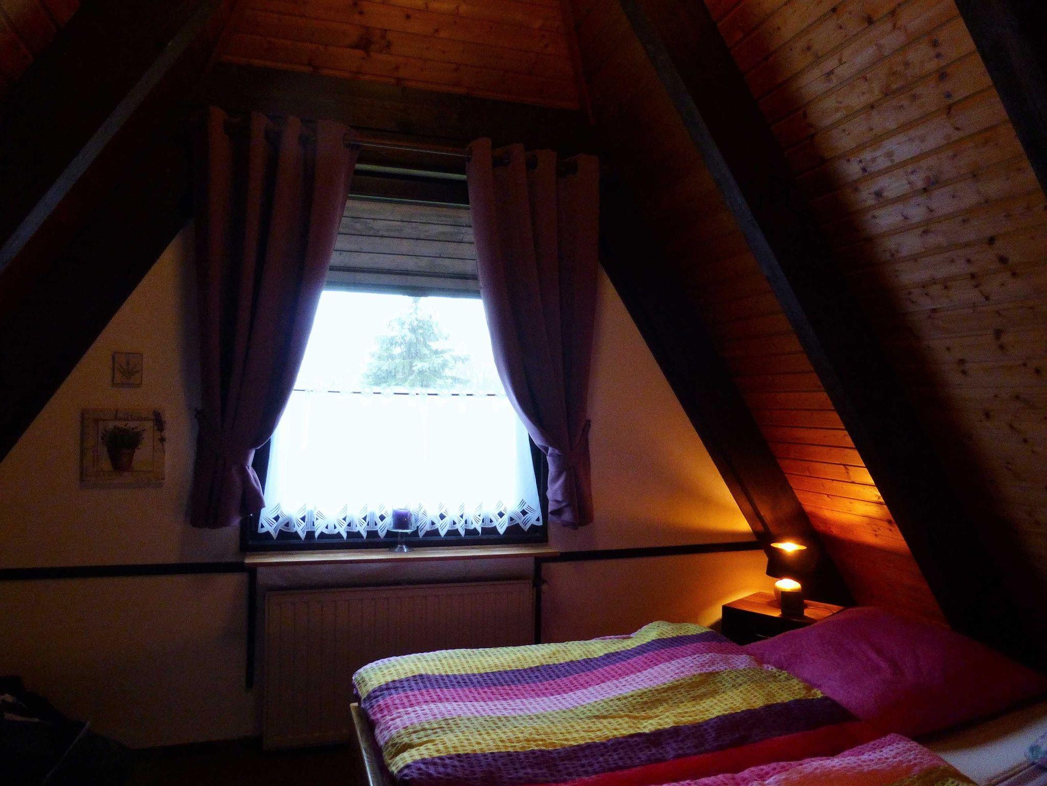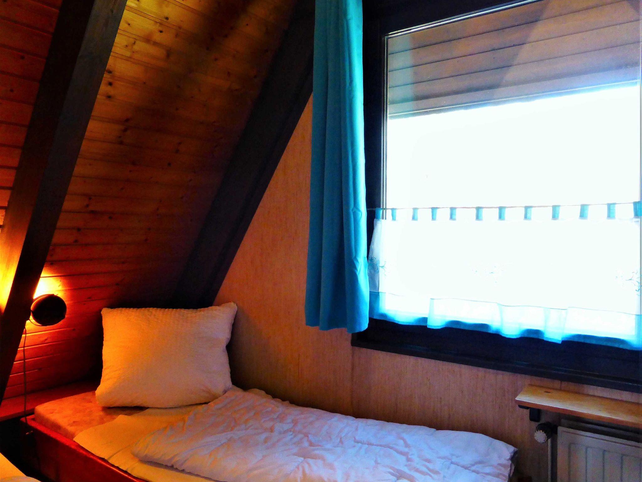 Sie sind aufgeteilt in ein Schlafzimmer mit zwei Betten (80x200) und ein Schlafzimmer mit drei Betten (2x = 90x200 / 1x = 80x200) sowie einer Schlafkoje im Spitzgiebel unter dem Dach (erreichbar über eine feststehende Holzleiter). Dieses Hochbett hat eine große Matratze mit dem Maß 140 x 200 cm. Im November 2022 bekam das große Schlafzimmer 2 neue rückenfreundliche Matratzen!
