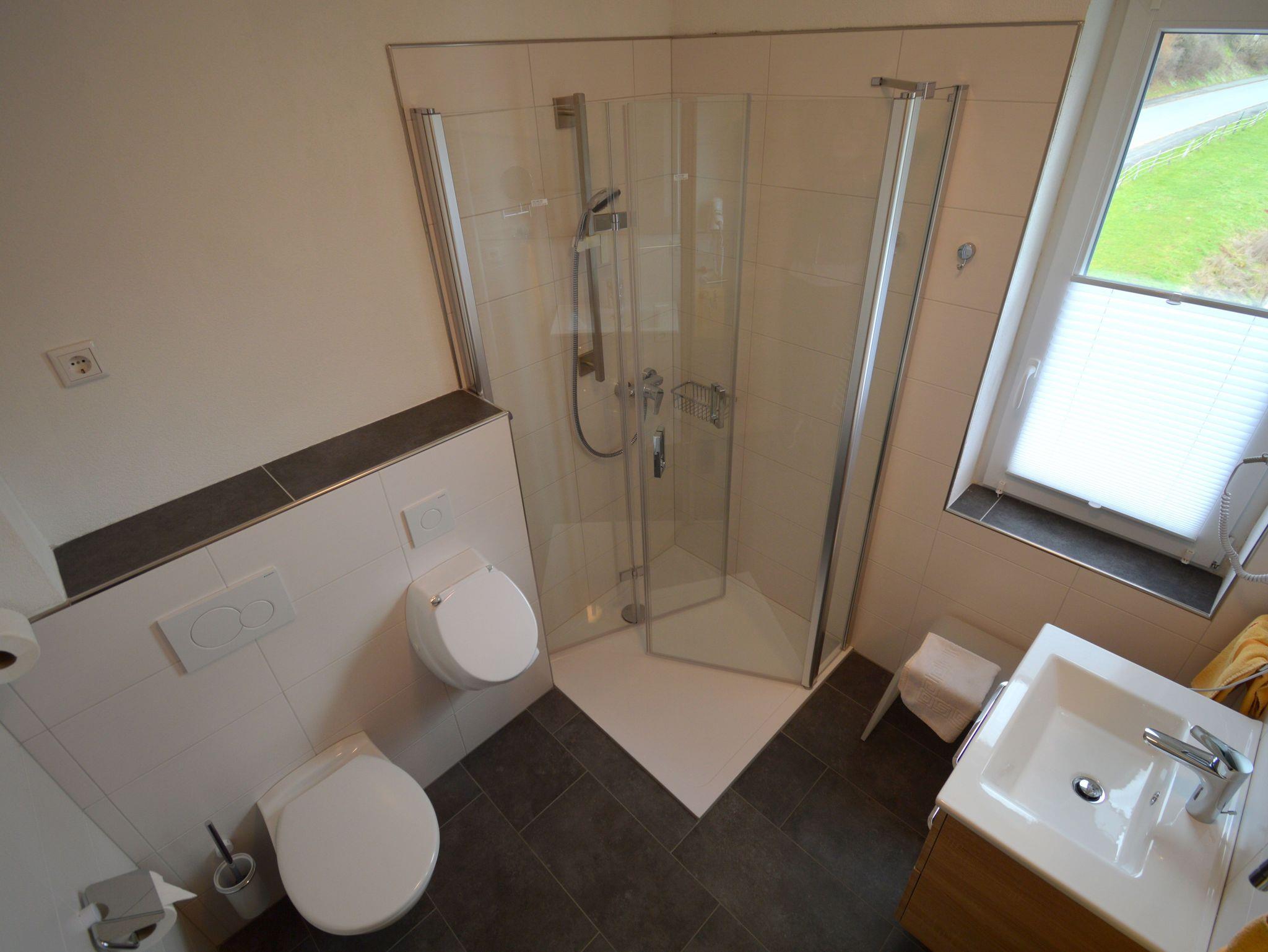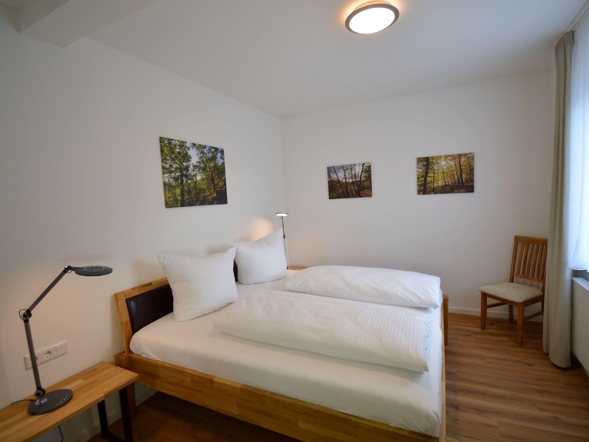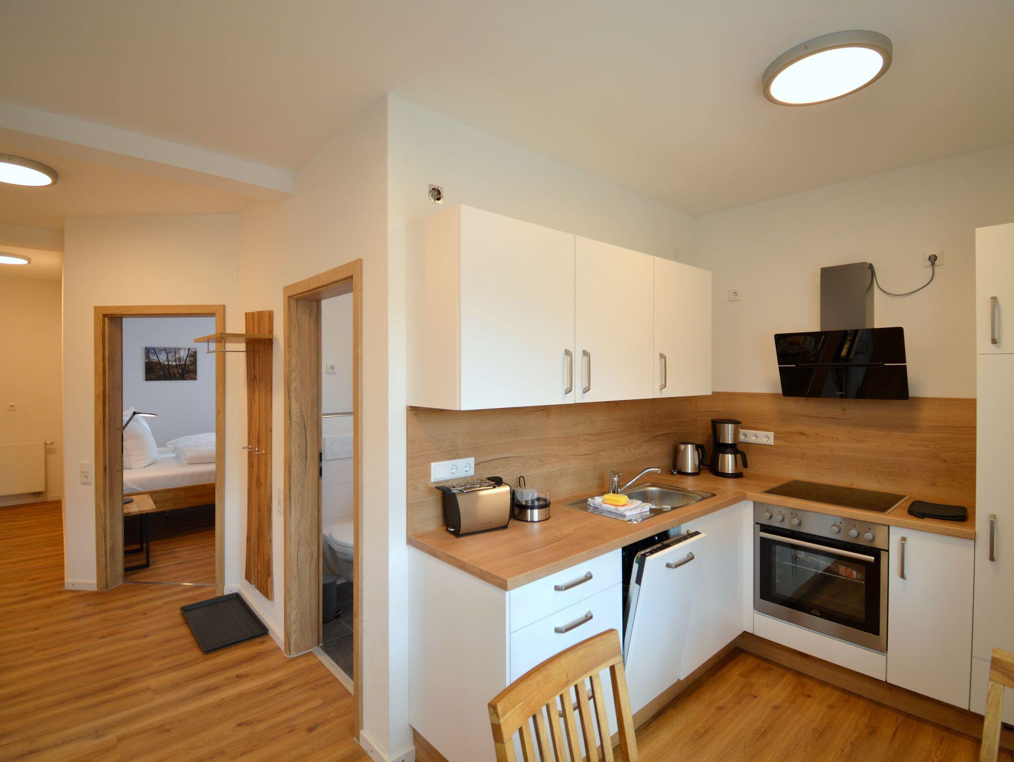 Die moderne Zwei Zimmer Wohnung liegt im ersten Stock unseres Hauses. Die Wohnung ist mit 48 qm perfekt für einen Urlaub zu zweit. Das Schlafzimmer ist mit einen großen Doppelbett (180 cm x 200 cm) ausgestattet. Besonderes Highlight im Schlafzimmer sind die Nachttischlampen mit verschiedenen Lichtstimmungen, je nachdem, ob Sie helles Licht zum Lesen benötigen oder ein warmes Licht zum Relaxen. Die Schlafzimmer lassen sich für besonders erholsame Nächte komplett verdunkeln. Auf der bequemen Couch haben Sie nach einem erlebnisreichen Tag einen herrlichen Ausblick auf die Natur. Die große Küche ist ausgestattet mit Kühl- und Gefrierschrank, Spülmaschine, Kaffeefiltermaschine, Wasserkocher, Toaster und Eierkocher und vieles andere, was Sie zum Kochen brauchen. Das Badezimmer verfügt neben dem WC über ein Urinal und eine ebenerdige Dusche mit mobilen Duschsitz. Auf dem Balkon lässt es sich in der Morgensonne mit einem Blick auf den Nationalpark und das Vorstaubecken des Edersees gut frühstücken.