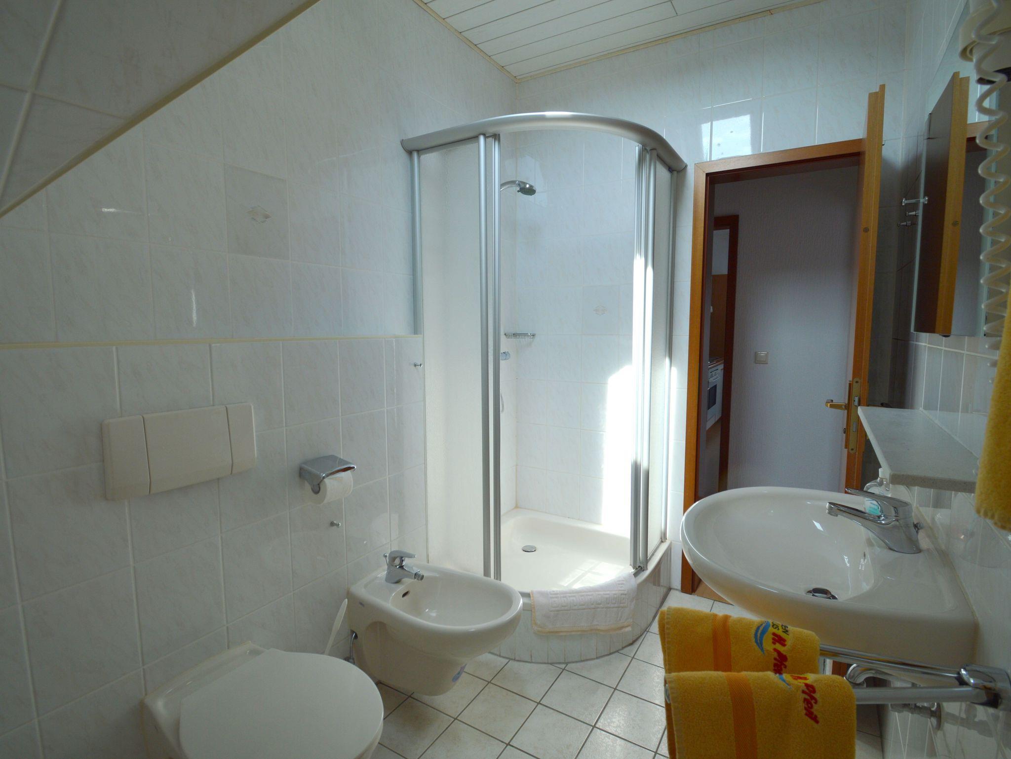 Im Bad befinden sich Dusche WC und Bidet.