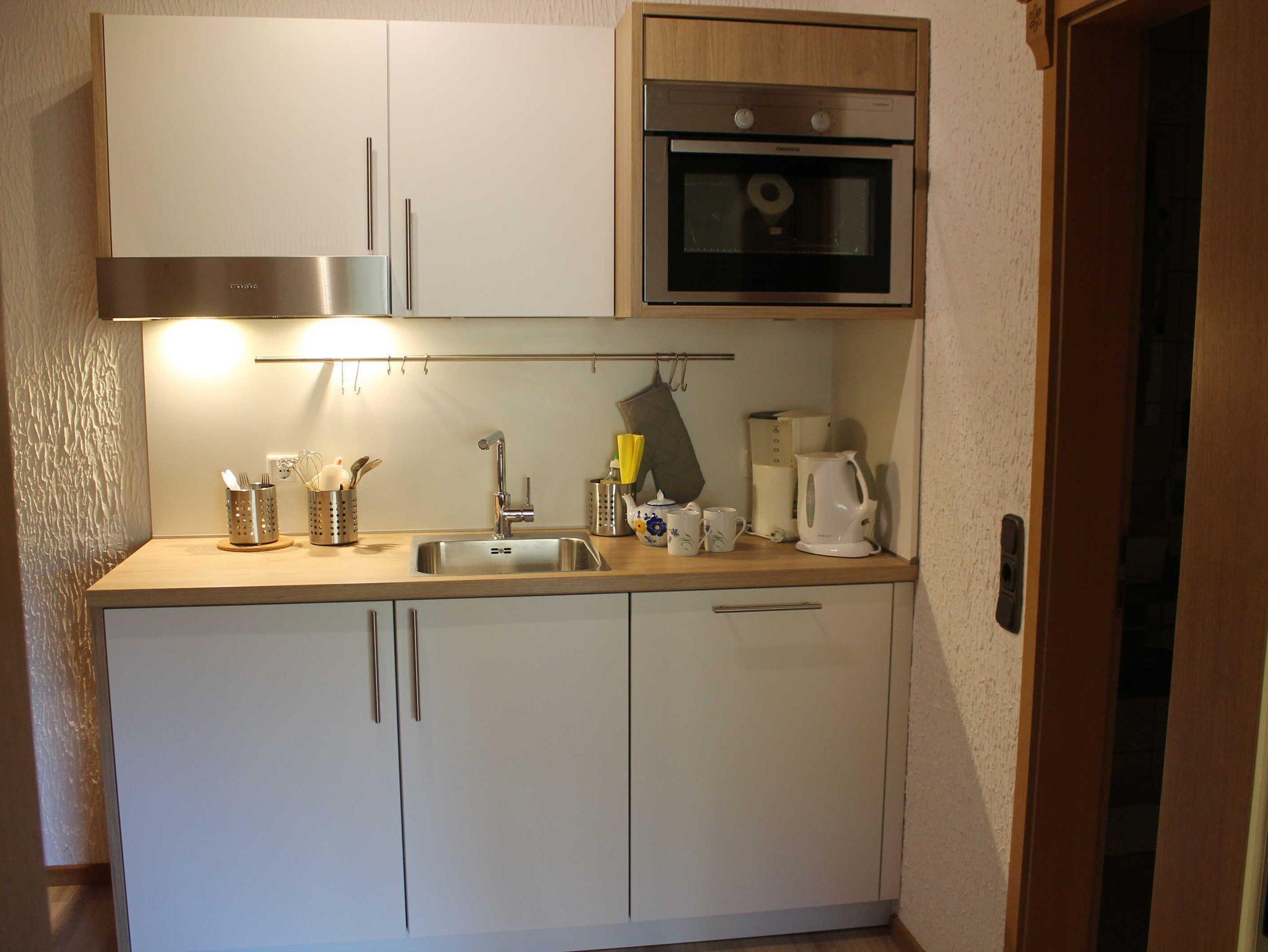 Küchenzeile mit Geschirrspülmaschine und Backofen, Dusche und WC, Bademantel, Föhn, Lotion und Shampoon Speick Thermal.