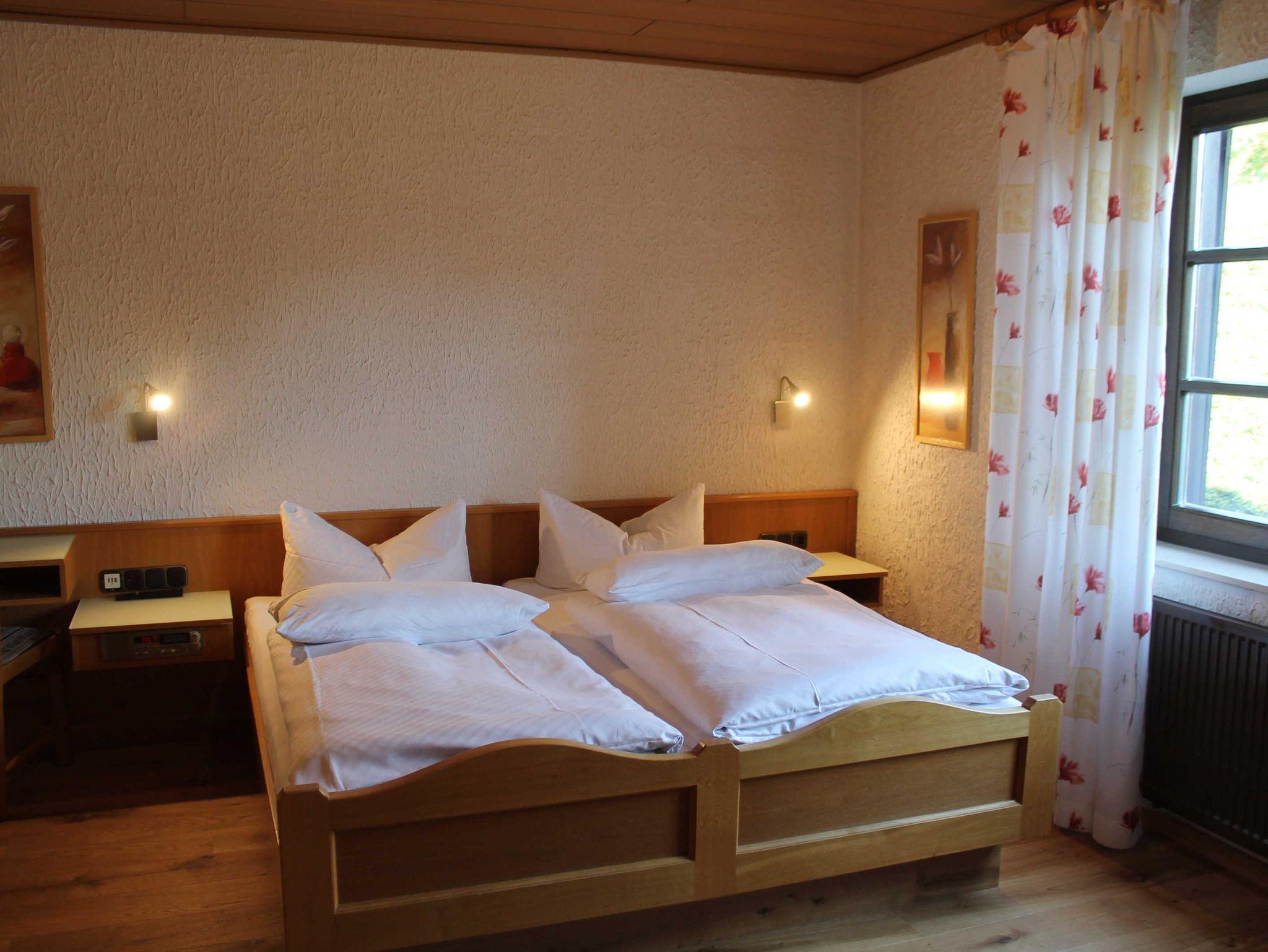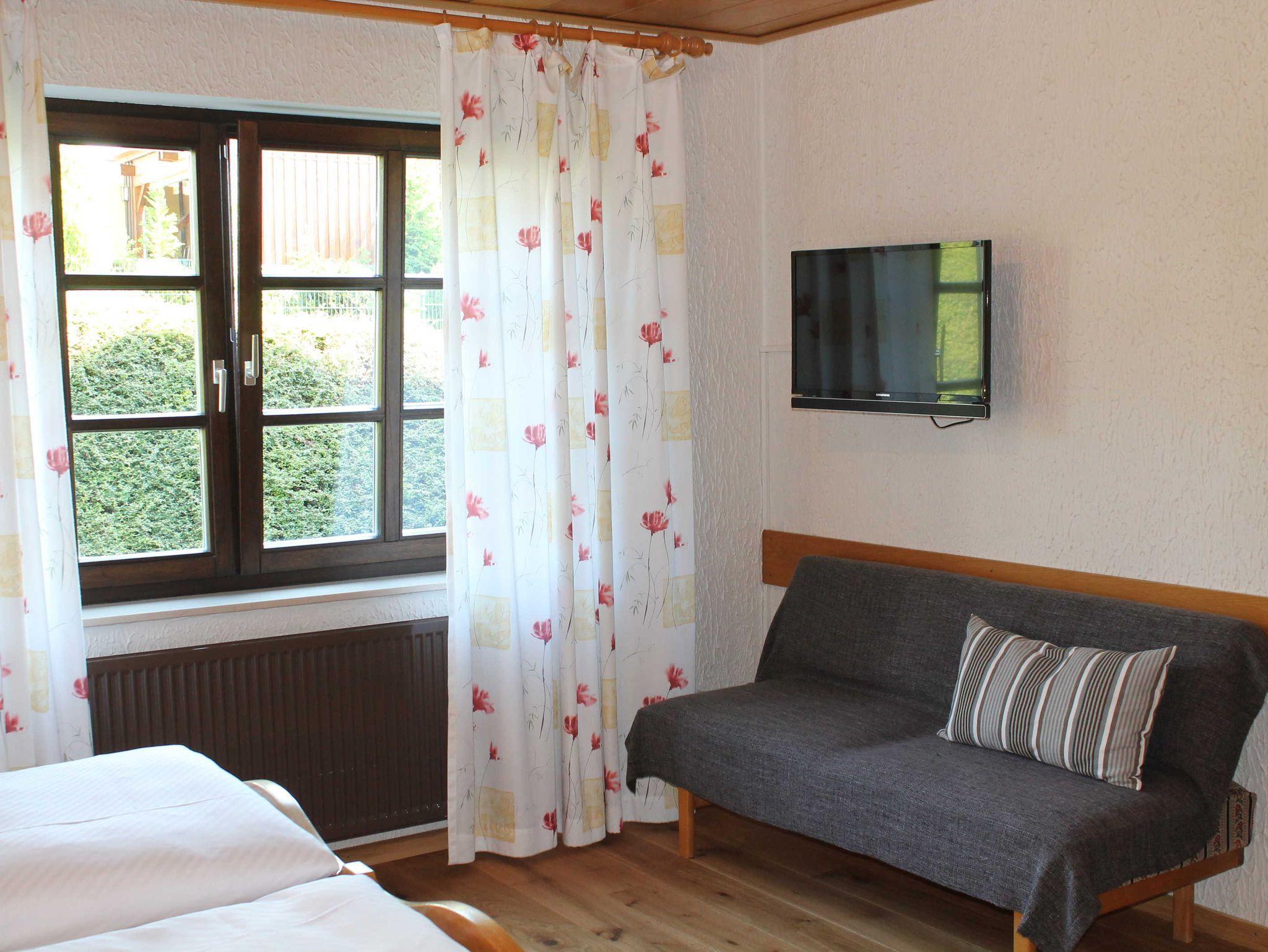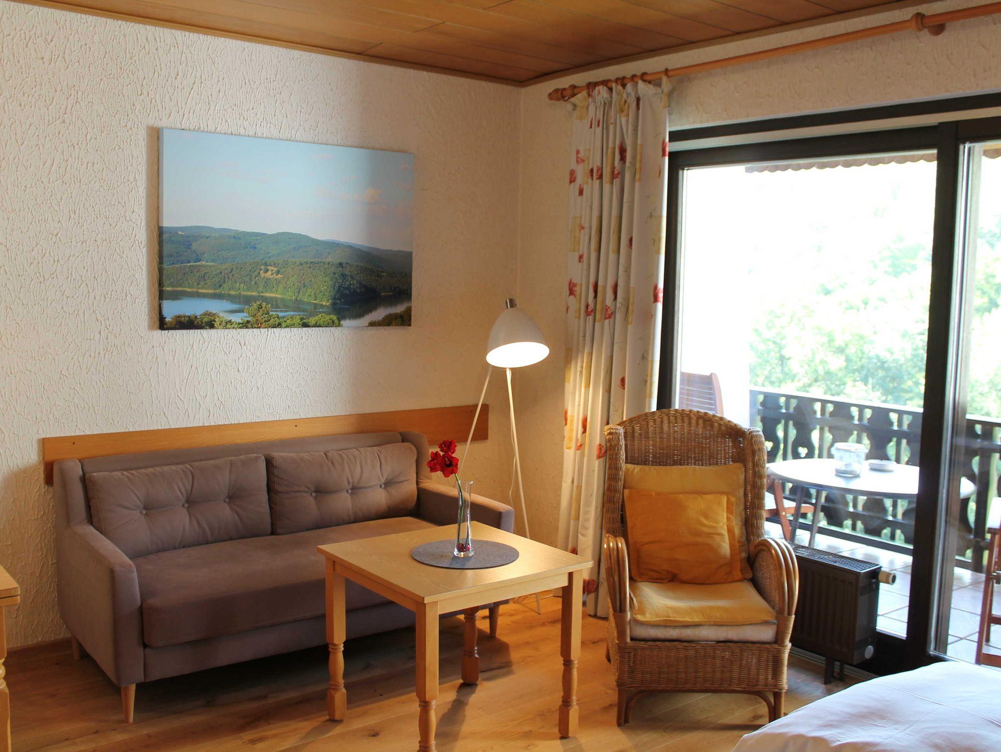 Wohn-Schlafraum (2 Betten in einer Schrankwand) mit großzügigen Balkon und Panoramablick zum Schloß , Waldeck, TV, Schlafraum mit Doppelbett, TV, Deckbetten 155 x 220 cm., Bettwäsche und Handtücher in 100 % BIO Cotton. Fußboden mit Naturholz-Dielen, 2 x Dusche und Wc, Lotion und Shampoon Speick-Thermal , Küchenzeile mit Geschirrspülmaschine und Backofen, Föhn und Bademantel.
