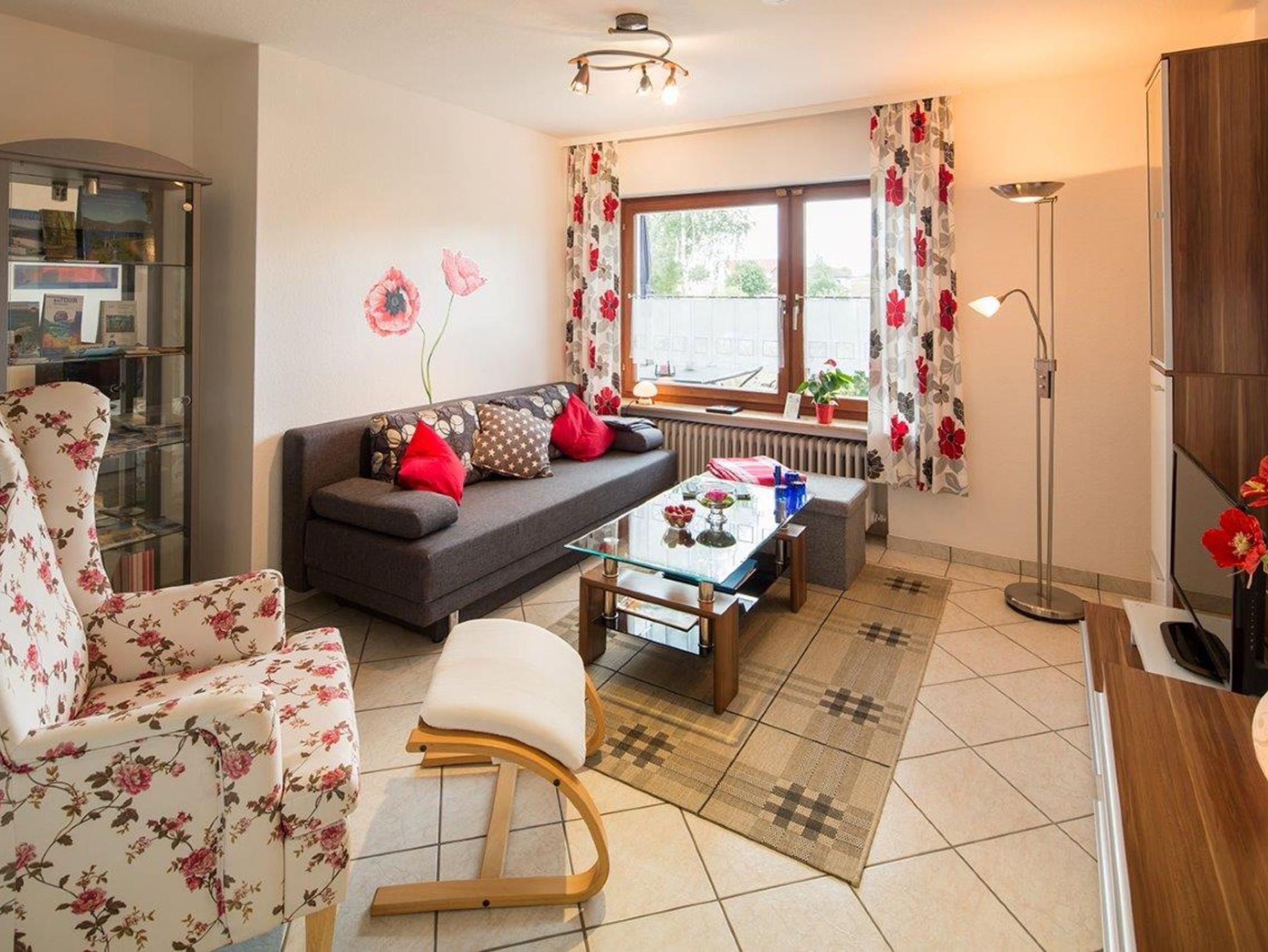 Im modern gestalteten Wohnraum befinden sich ein LCD Fernseher mit Videotext, Kompaktanlage CD + Radio und eine Couch mit Federkern zum ausziehen ( 140x 200 m ). Für müde Beine ist der große Ohrenbackensessel mit Hocker eine ideale Erholung.