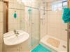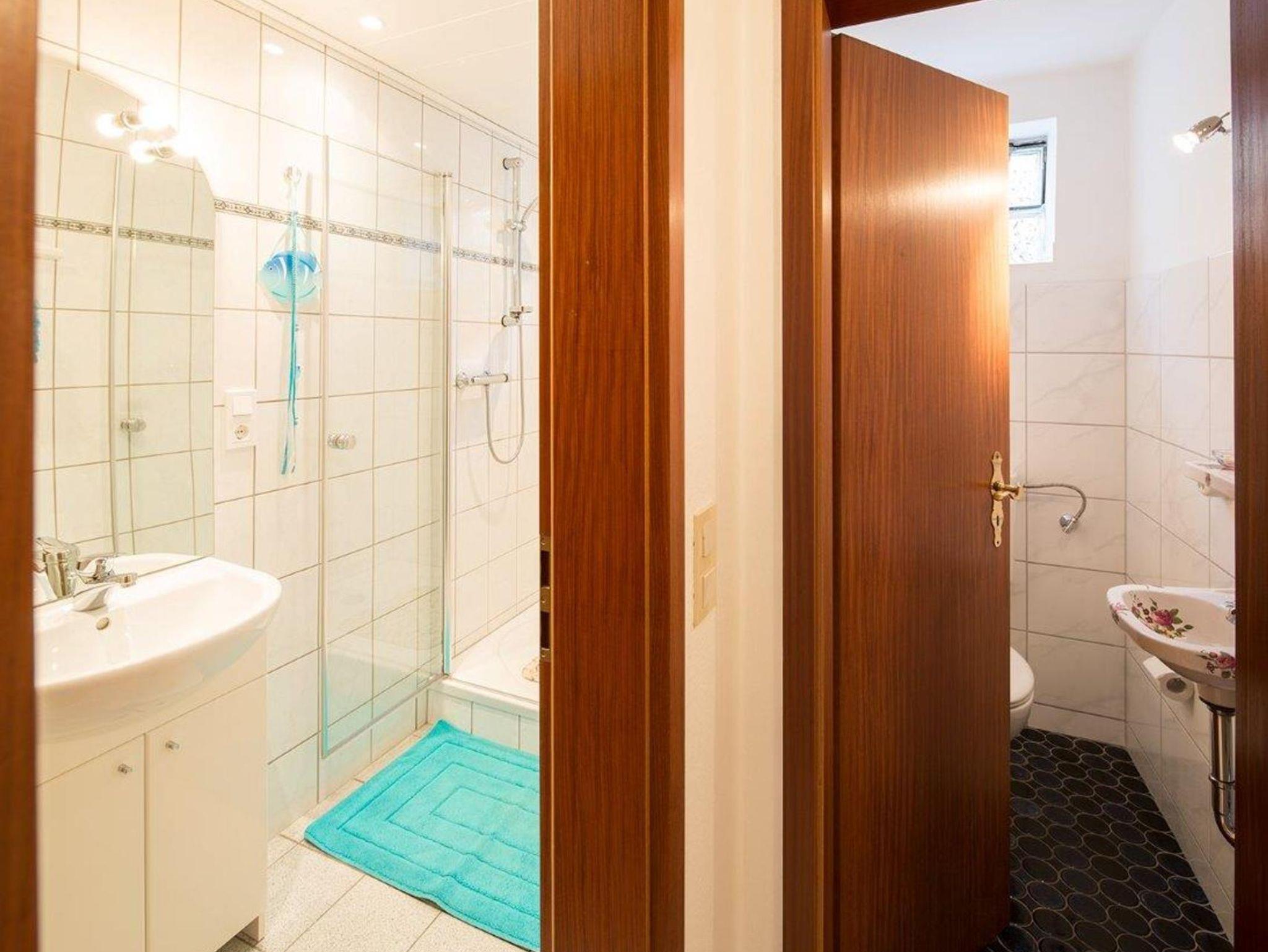 Das Badezimmer ist ausgestattet mit einem Waschtisch, Unterschrank, großer Duschraum, Hocker, Fön und Kosmetikspiegel. Es ist ein Tageslichtfenster vorhanden. Die Toilette ist separat.